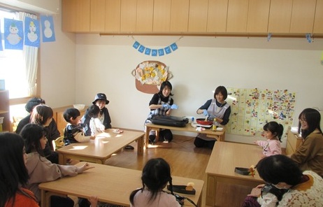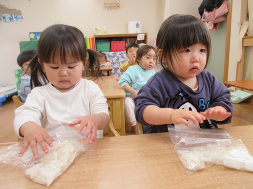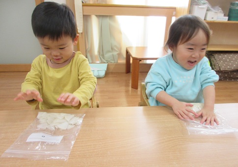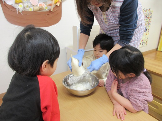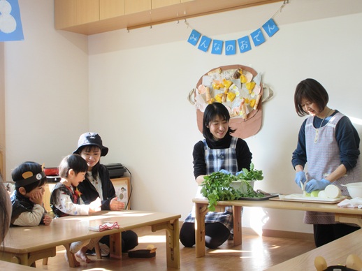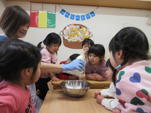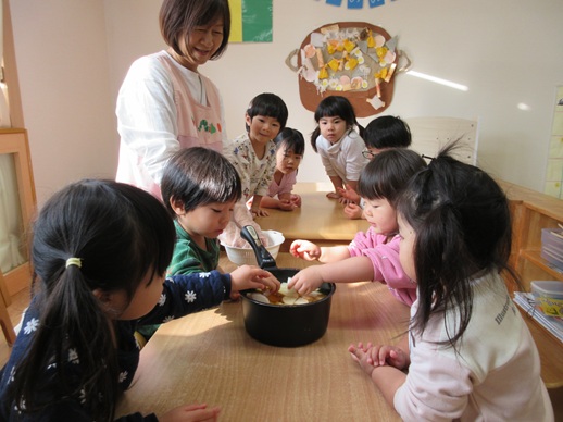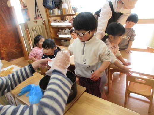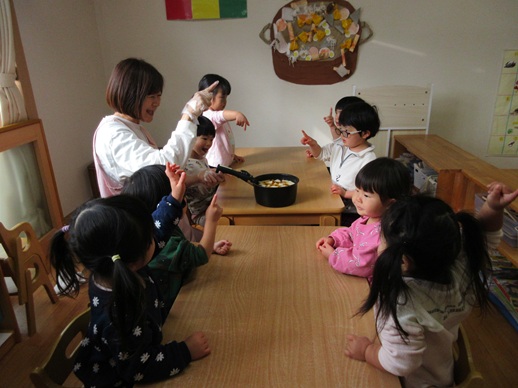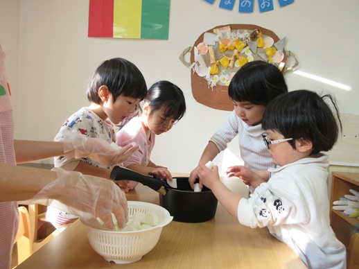 4日目は『大根の煮物』壁のおでんのように、大根をお鍋にぽっとんといれて、「おいしくなぁれ~」の魔法をかけてくれました。コトコト煮えていい香りがしてきます。3時のおやつにおにぎりと一緒においしくいただきました。