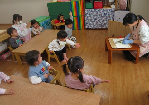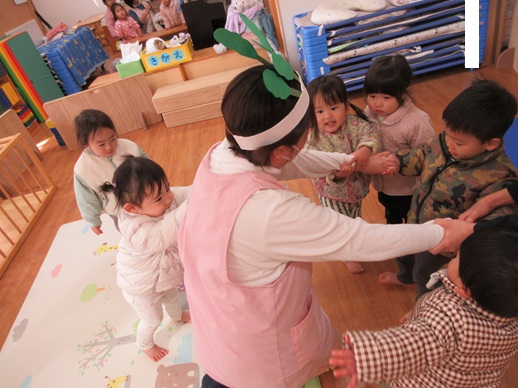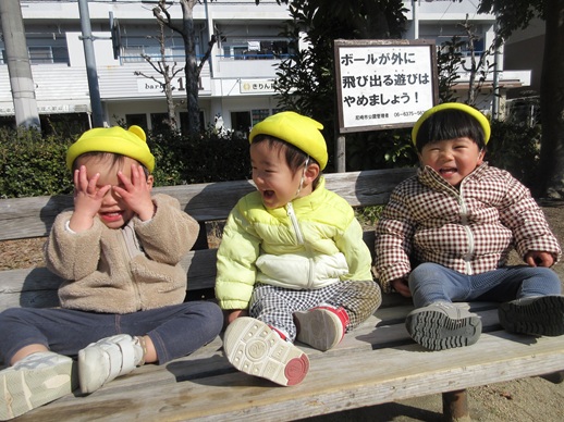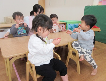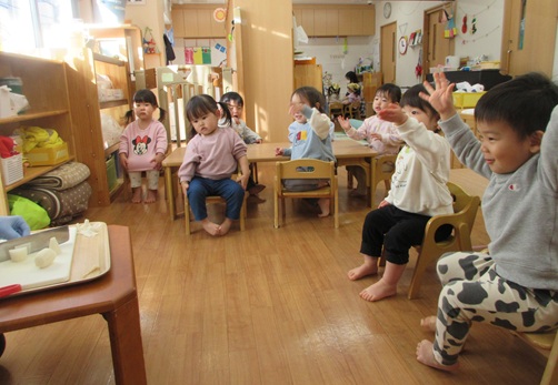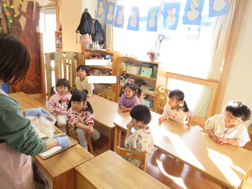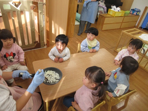 どうです!この可愛らしい鬼さんたち!カメラを向けると「ガオー!」と爪をたてる真似をして強さをアピールするのに笑顔が100点満点の鬼さんたち。2月3日は節分の行事をしました。その時の様子はね、こんな感じ。