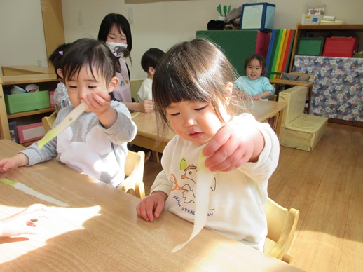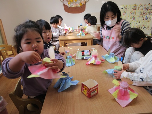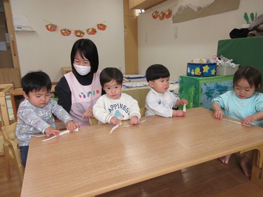 続々と、小さな鬼さんたちが、ほしのお部屋に集まってきました。ほしのお部屋のお友達は、お花紙で作ったカラフルでふんわりした優しさが子どもたちにピッタリの鬼さんに。たいようのお部屋のお友達は、ティッシュの箱で作った大きなお口がかっこいい鬼さんです。