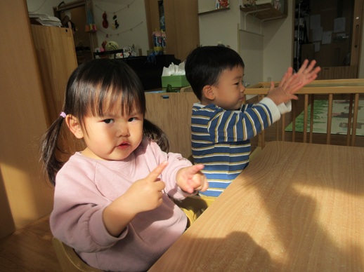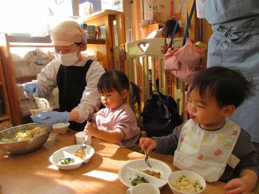 公園でたっぷり遊び、おなかをすかせて帰ってきたら、給食室からおいしそうな香りがしていて、食べたい気持ちがムクムクをわいてきます。手を繋いで帰る時も「今日の給食はなにかな~」とお話しながら帰ってくるようで、食べること、遊ぶこと、寝ること。しっかりと関わっていきたいなと思います。