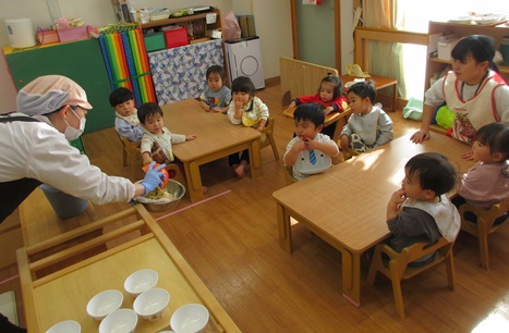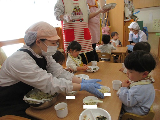 給食の先生が一人ずつ、横に来て、お茶碗にご飯をついでくれました。いつもとちょっと違うシチュエーションが楽しかったのか、最近、食が進まなかったお友達も、緑のお野菜がちょっぴり苦手なお友達も、あっという間にピッカリ~ン★ペロリと食べてくれました。