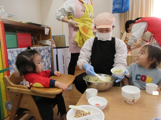 たいようさん(2歳児と1歳児クラス)は、”バイキング”と言って、ご飯やおかずを取りに行き、テーブルまで運びました。以前もお伝えしましたね、そうなんです、2回目の”バイキング”です。まだ自分で食べれる量は分からないので、こちらで一人ひとりの食べれる量をついでいますが、「大きいの!」「いっぱい」と、みんな食べる意欲がすばらしくって、「OK!」と盛り付けしています。この取り組みは子どもたちがとっても楽しみな一つになっています。