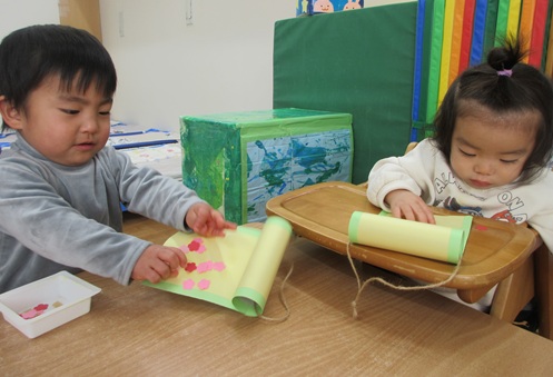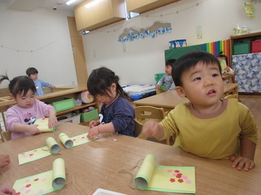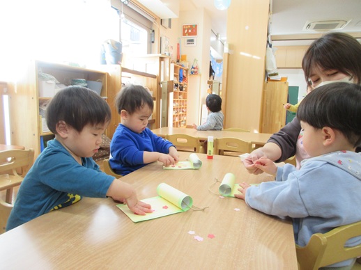 ほしさん(1歳児と0歳児クラス)が、小さなお花を貼っていますよ。赤とピンク、自分で選んでペタペタ。指先を器用に使って貼れるようになりました。
