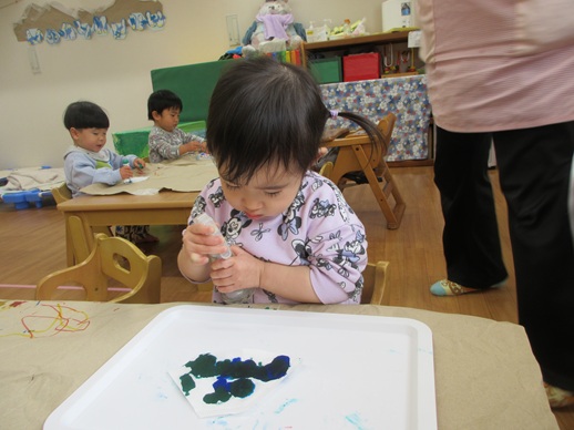 お雛様のお着物は、コーヒーフィルターにサインペンで色を付けて、霧吹きでにじませたものです。色が混ざっていく様子がきれいで不思議で、シュッとするたびにお顔をあげてニッコリ。先生に「みて」と嬉しい気持ちを共有しながら作ったものです。0歳児さんはシールのお顔。1歳児さんはサインペンでお口を描いてみました。