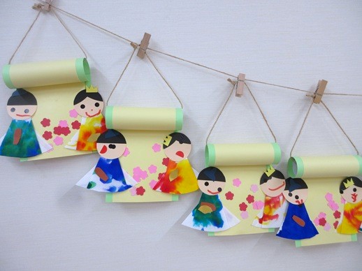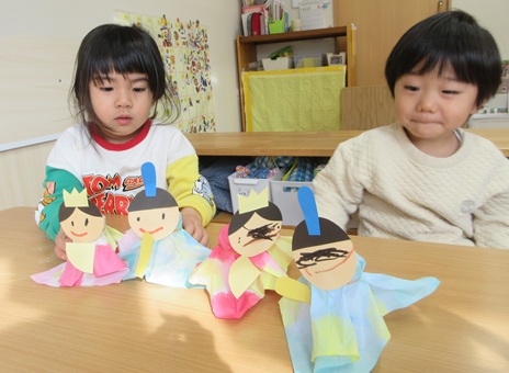 たいようさん(2歳児と1歳児クラス)のお雛様は、絵の具でにじみ絵をしたものを使ってお着物にしました。トイレットペーパーの芯にかぶせて輪ゴムでとめて、お顔をペタリ。お顔はサインペンで描きましたよ。目を塗りつぶしたのには理由がちゃんとあるんですよ。子どもの表現をそのまま残すことを大切にしています。