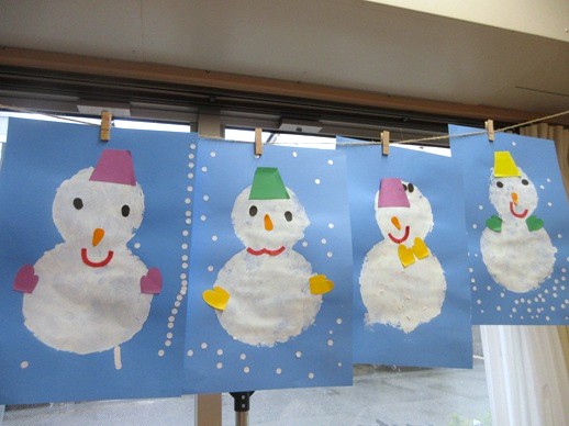一列にならんだ雪。雪だるまの上にびっちりと貼った雪。雪だるまには重ならないように散りばめた雪。お口を工夫したり、手の位置を考えて貼ったりと、同じものが一つもなくて、自由な表現が楽しめるって素晴らしいなと思います。踊りだしそうな雪だるまたち。