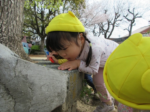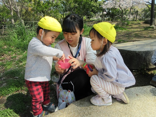 靴を履くよ。ぜーんぶ自分でやってみたいの。・・・と思ったら、イヤイヤ~っ。まだまだ甘えんぼさんしてたいの。反対っこの気持ちが出たり入ったりの子どもたち。思いのままに過ごしていてかわいいなと思います。でもね、今は「できた!」「やってみたい!」の気持ちが大きくてはりきっていますよ。少しでも早く公園に行きたいものね。公園には春がいっぱいで、たんぽぽさんや、ありさんにだって会えるんですから。