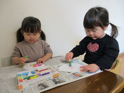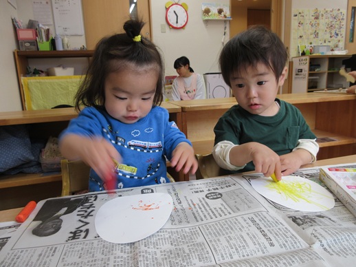 クレパスでお絵描きタイム。好きな色を選んでぬりぬりしてみました。「あか」「きいろ」「みどり」色も分かるようになったね。自分の好きがあるんだね。日々変わっていく成長の気づきが楽しいですね。