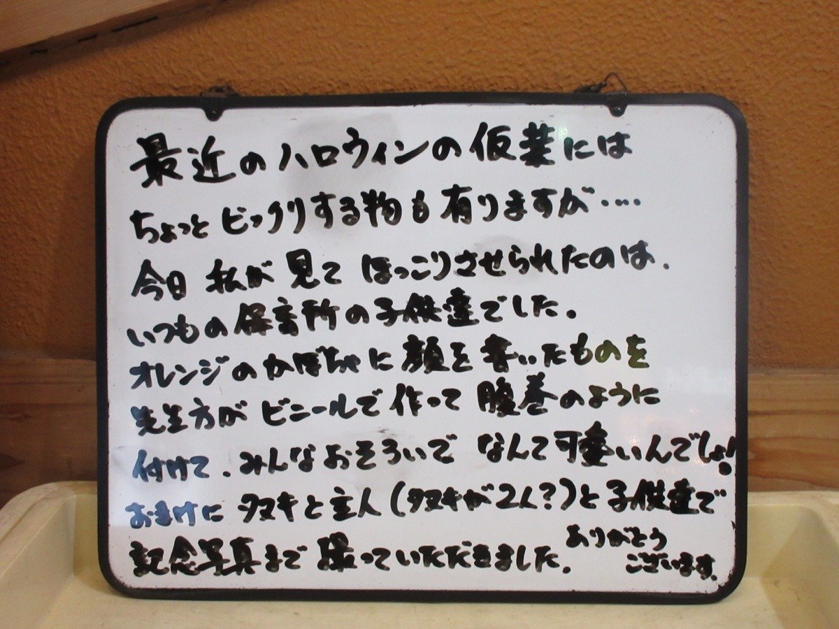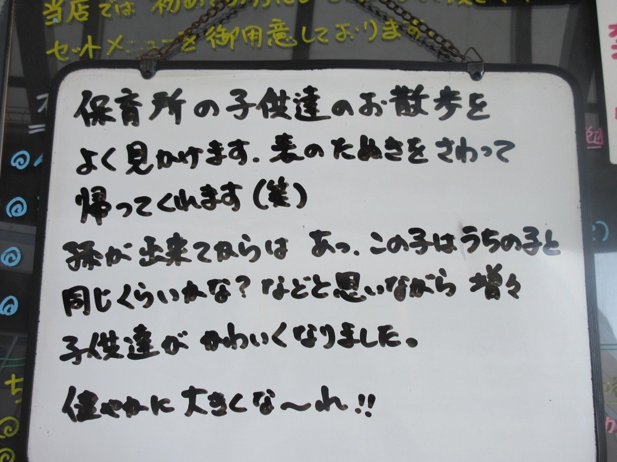 ある日、狸君をバイバイした後にお寿司さんの前を通ると、なんとも嬉しいコメントが…♡