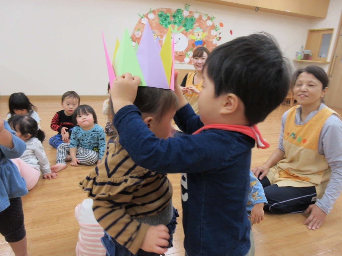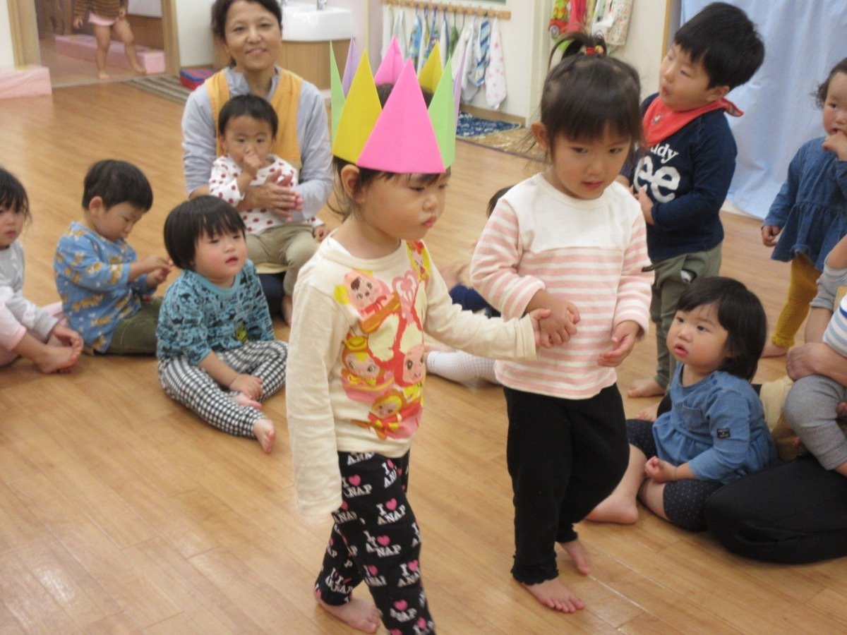 王冠を被って、お友達の周りを回って、次のお友達とタッチで交代!王冠は次のお友達へ「はい。どうぞ。」