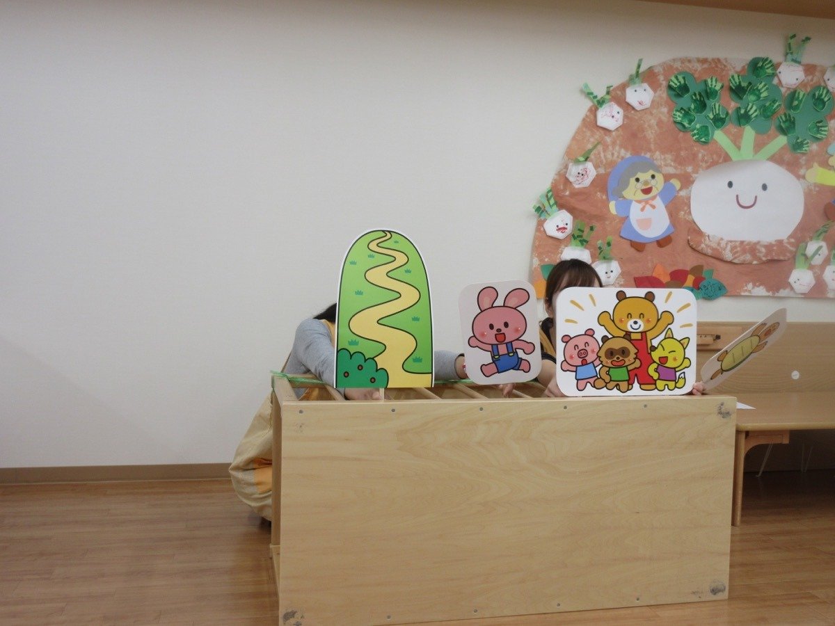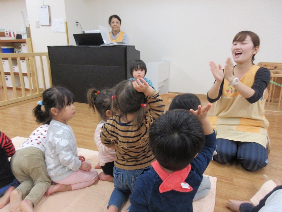 みんなで、♪○○ちゃん ○○ちゃんはどこでしょう~♪と、お名前の歌を歌って元気にお返事、「は~い!」