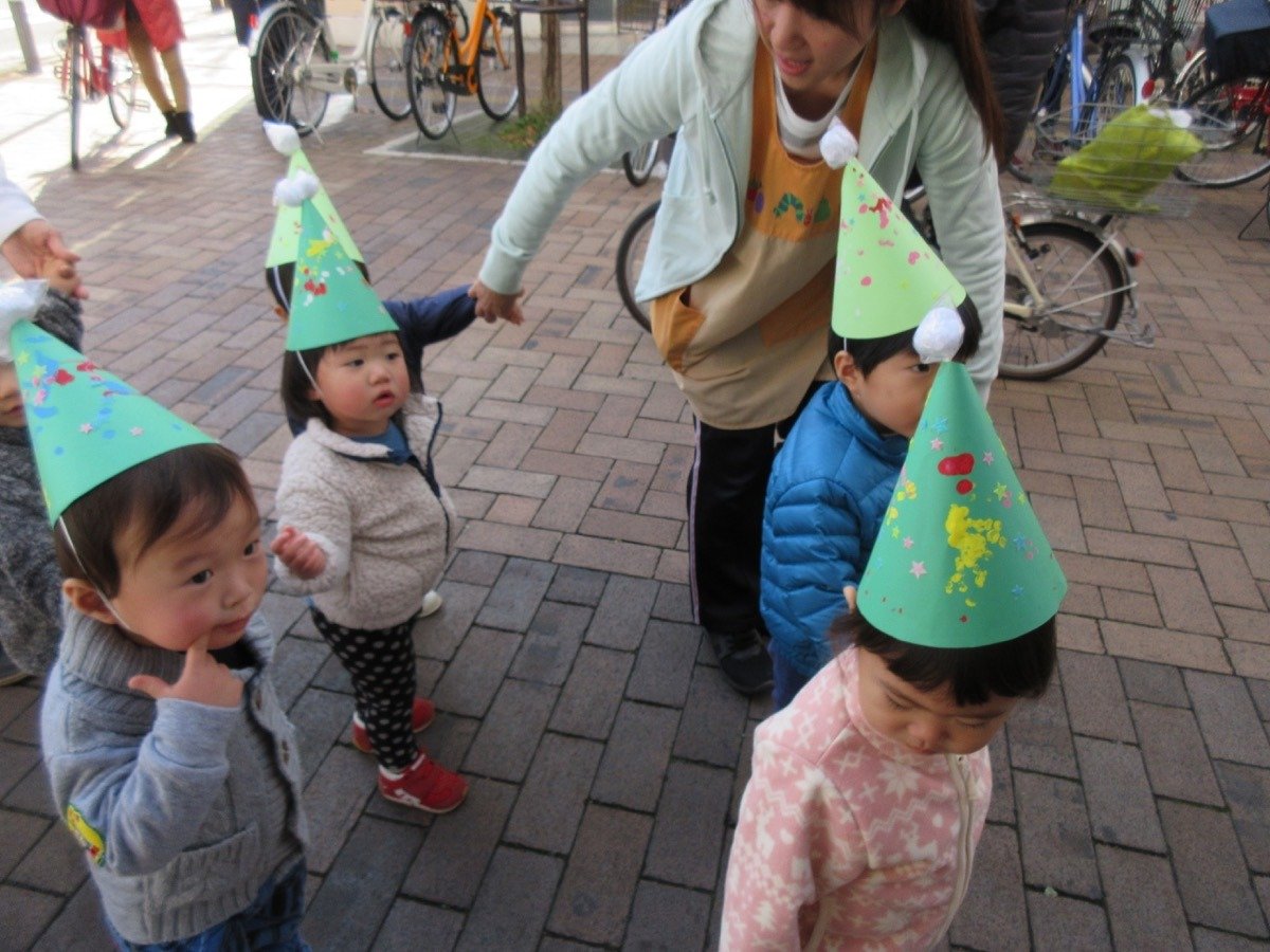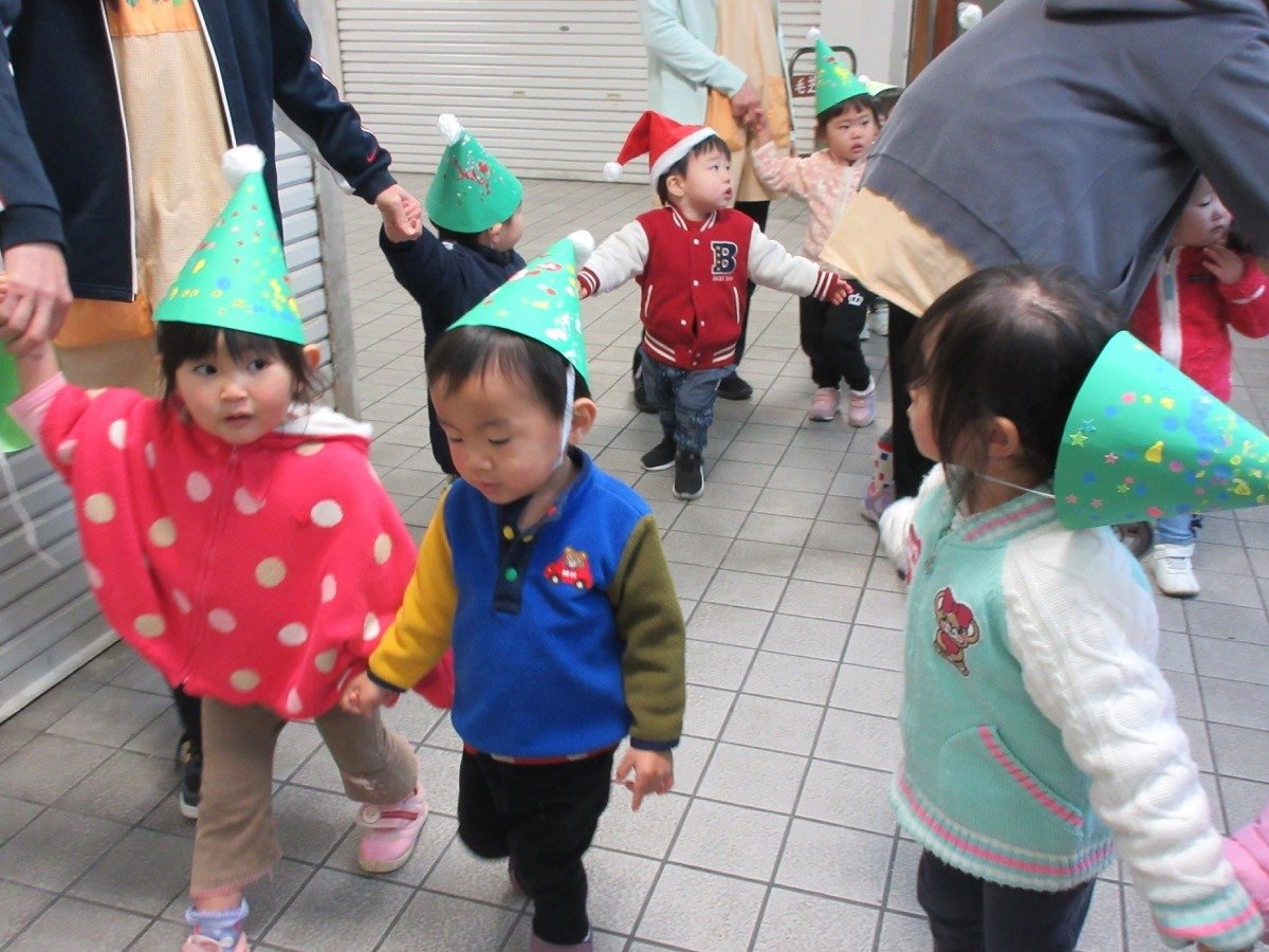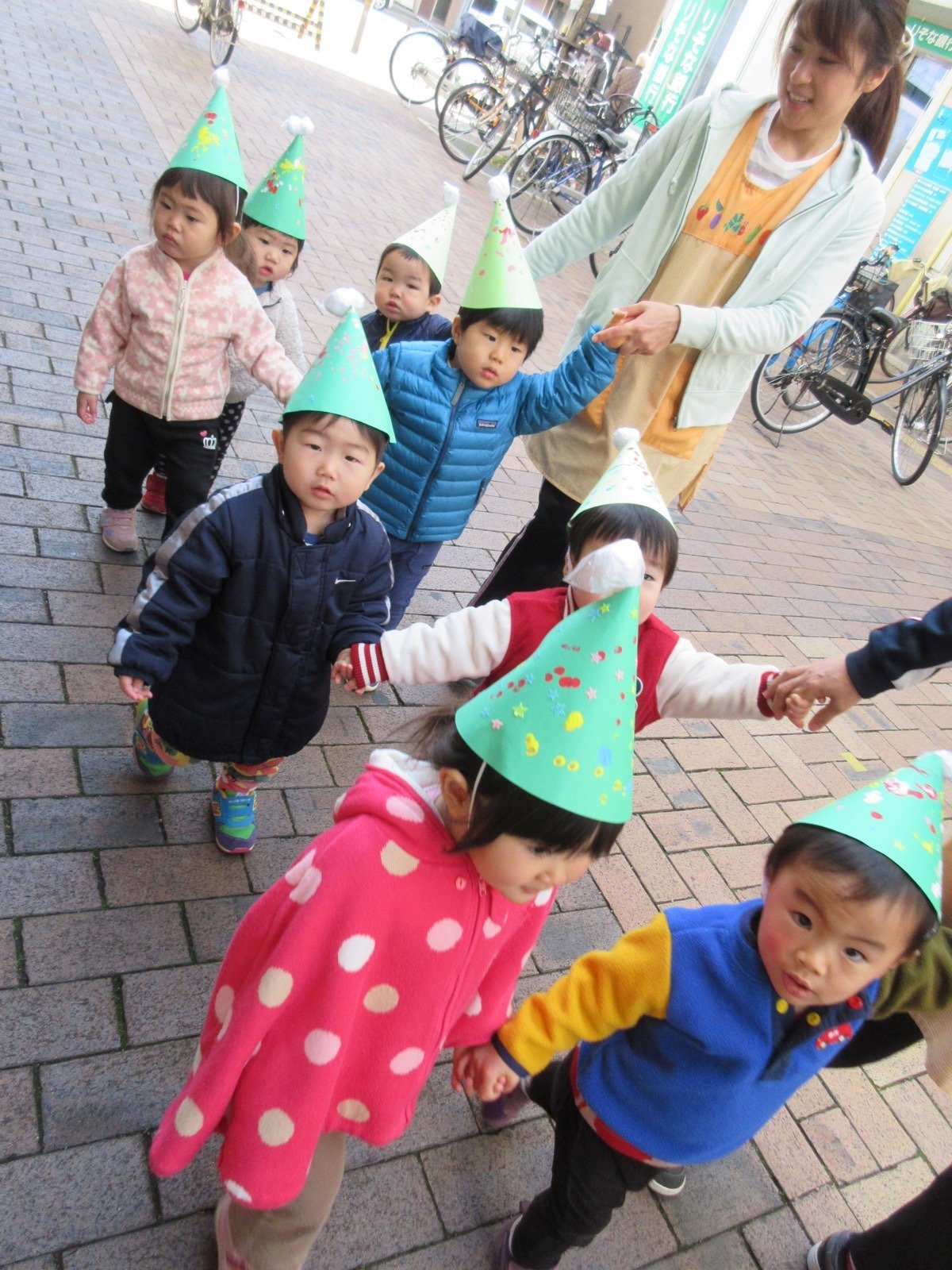 子ども達が作ったツリー帽子を被って、商店街をパレード♪