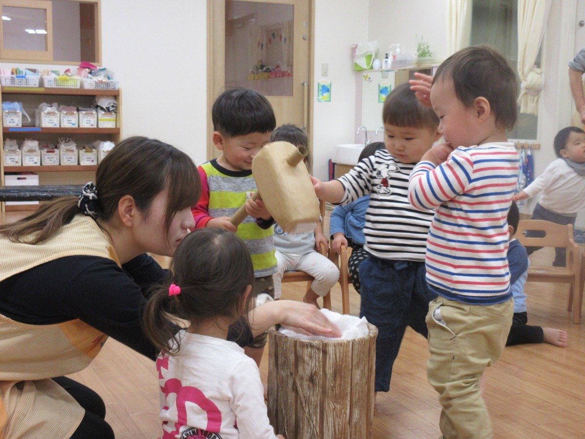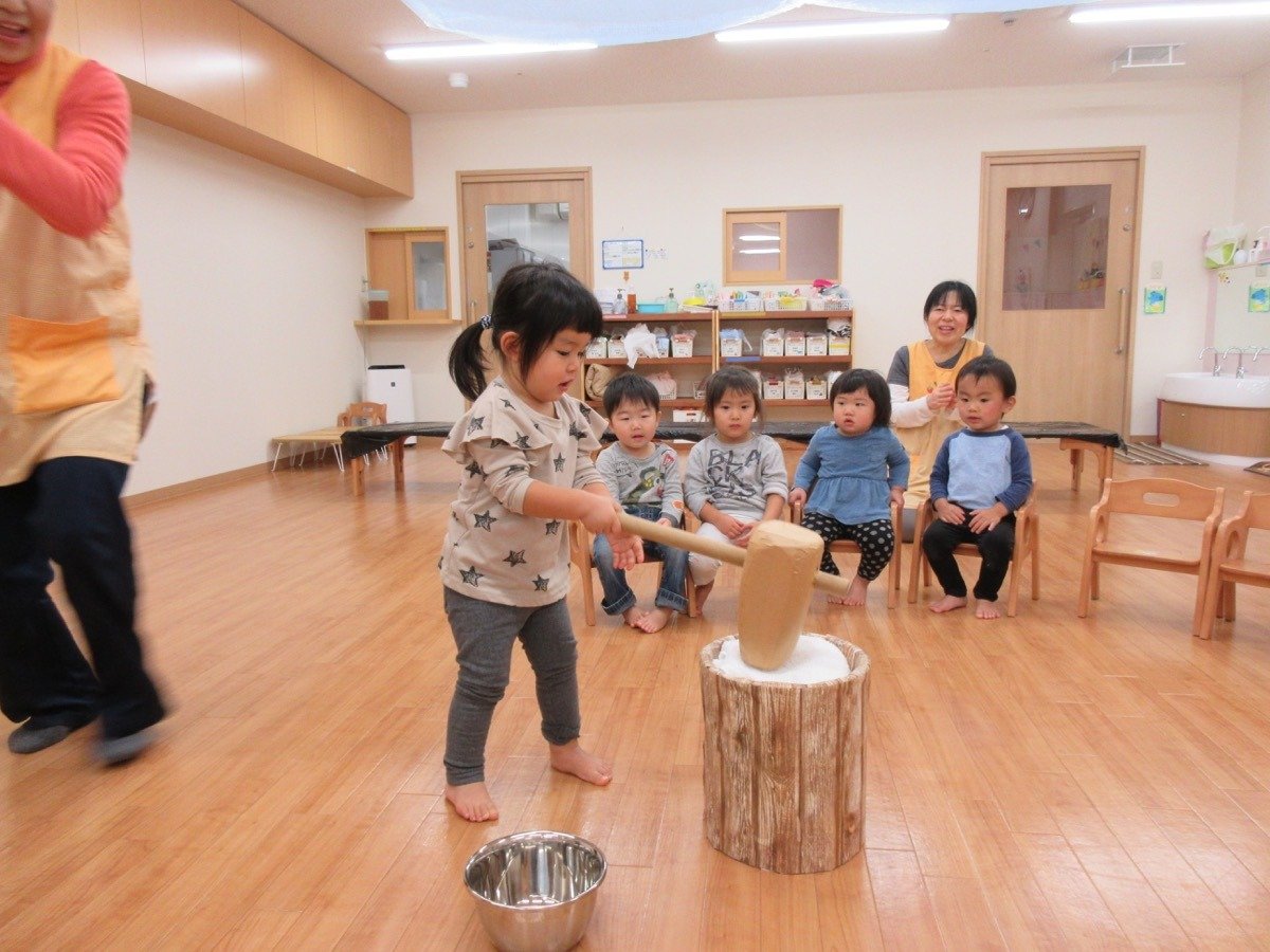 ぺったん、ぺったん おもちつき!水をつける人も順番に交代!