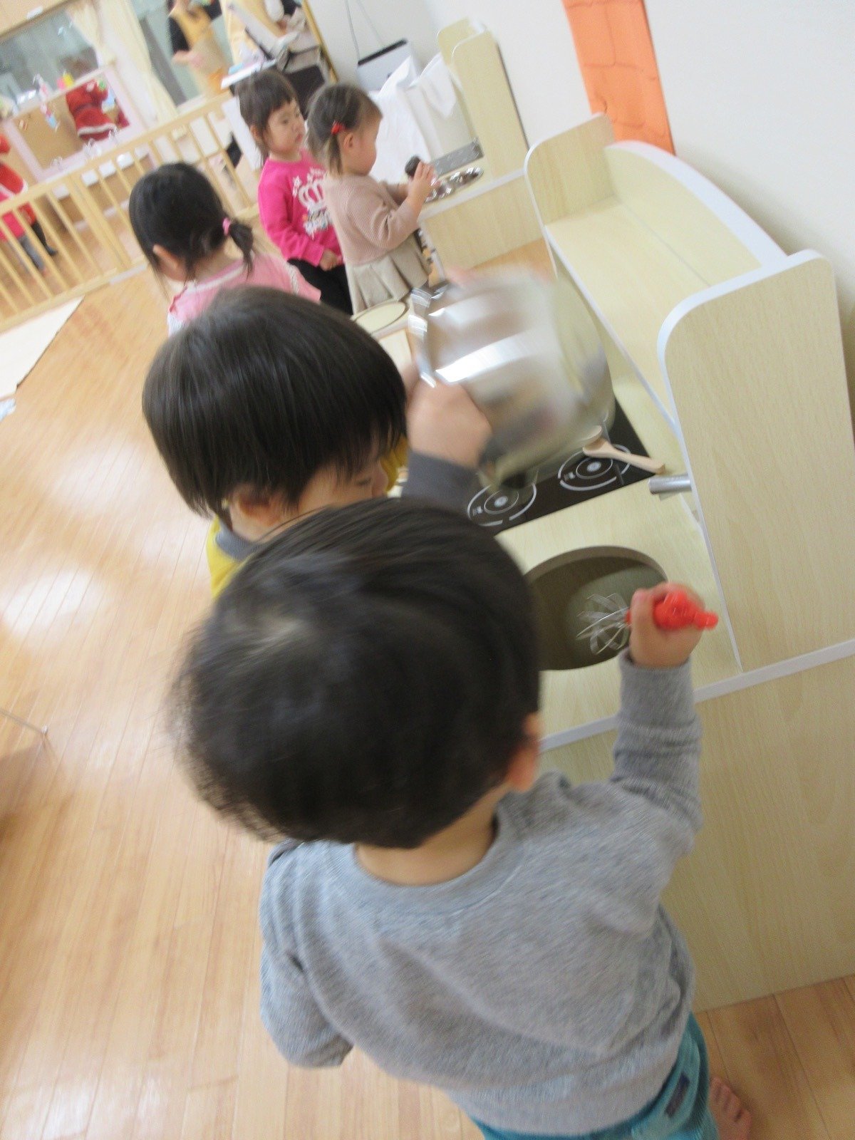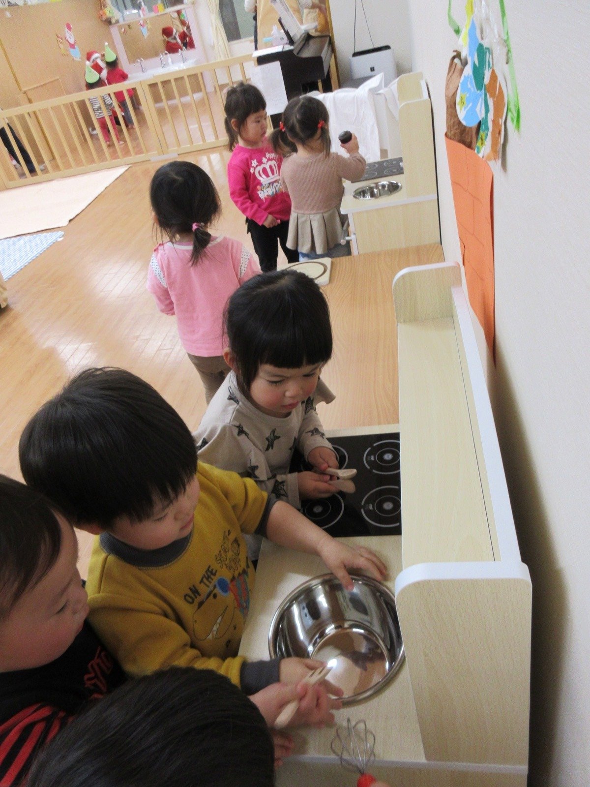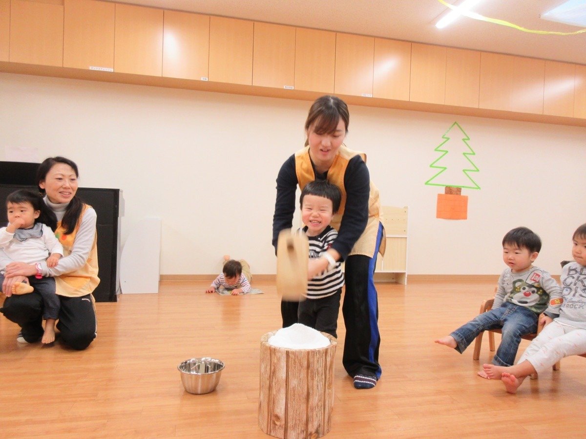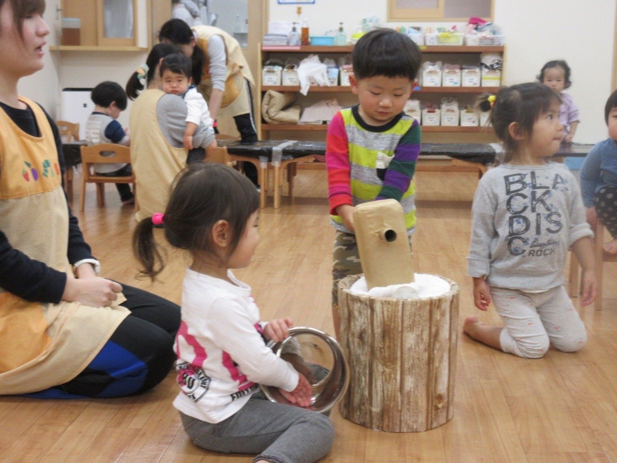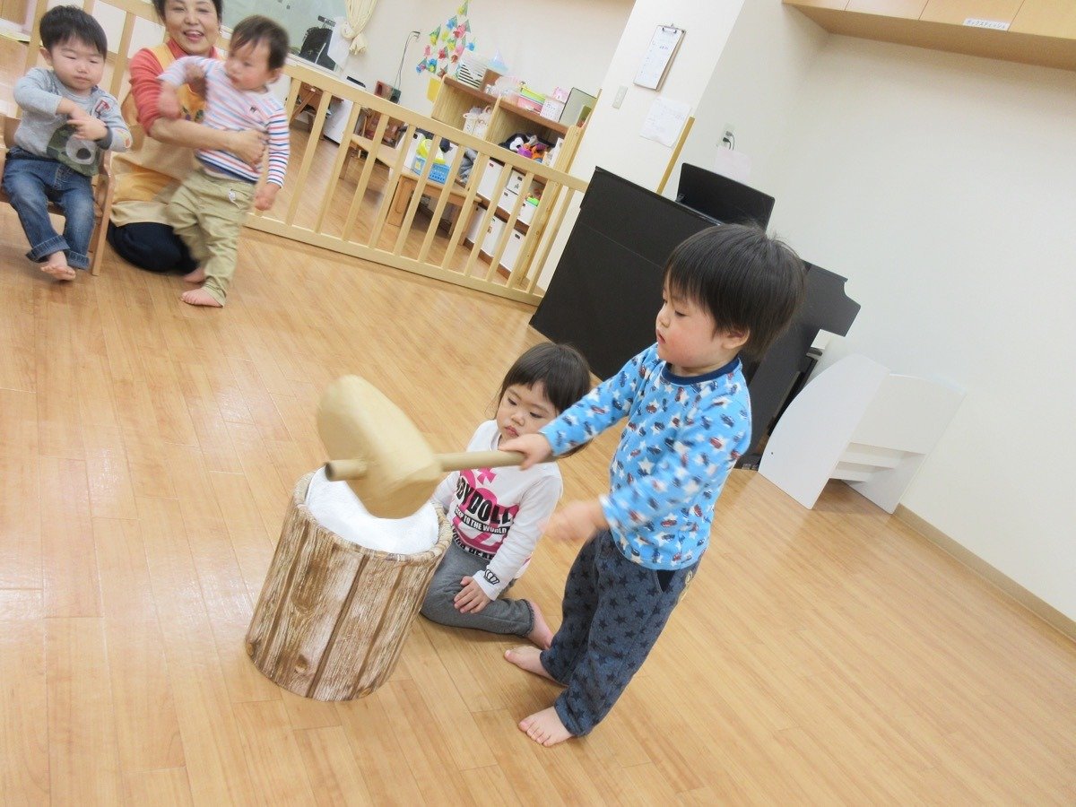 そこで、今日は、正月気分を味わおうと、おもちつきごっこをしましたよ♪