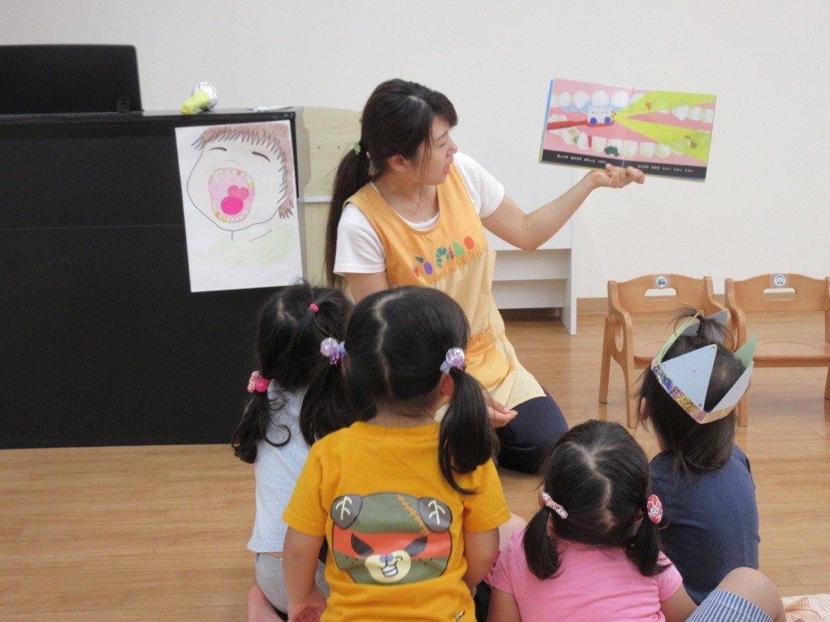 お誕生児さんが代表して、お話しのお友だちに‘ゴシゴシゴシ‘ 上手に歯ブラシをしてくれました。