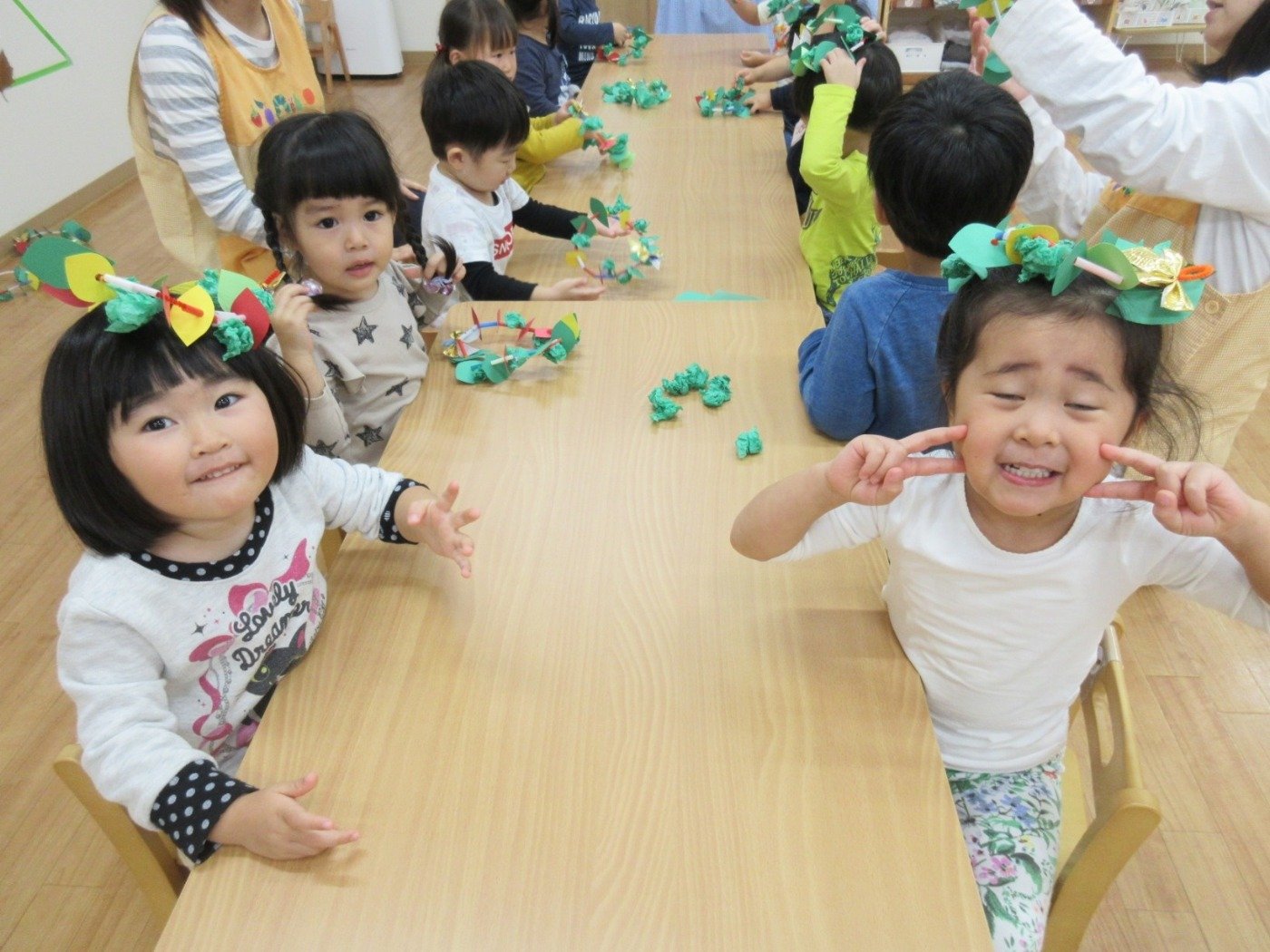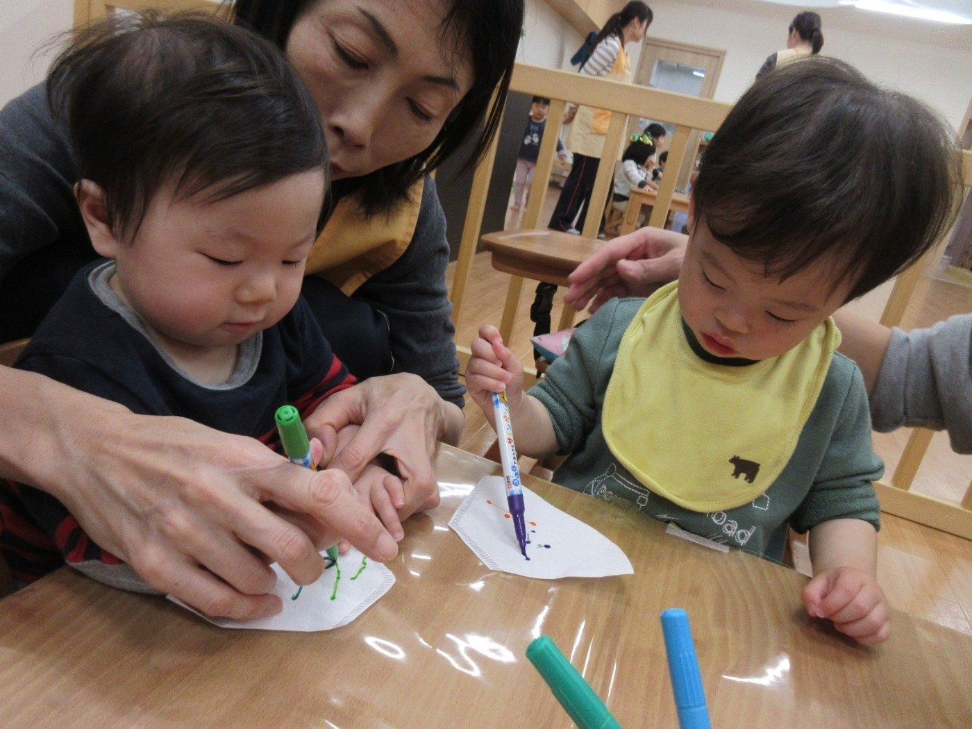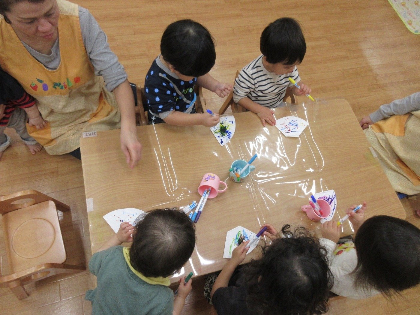 大喜びでハイタッチをする’くま組さん’、おっかなビックリで先生のエプロンをギュッて握る’うさぎ組さん’