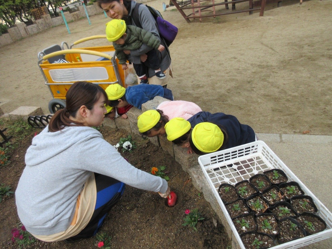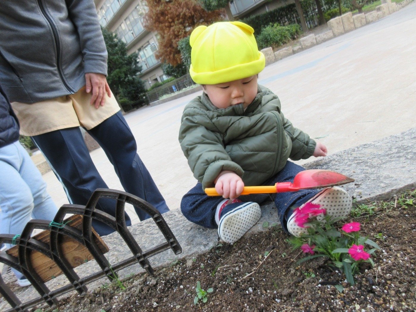 小さな小さなひよこ組さんのお友だちも「ぼくも!」と、スコップを手に土をかけるお手伝い。