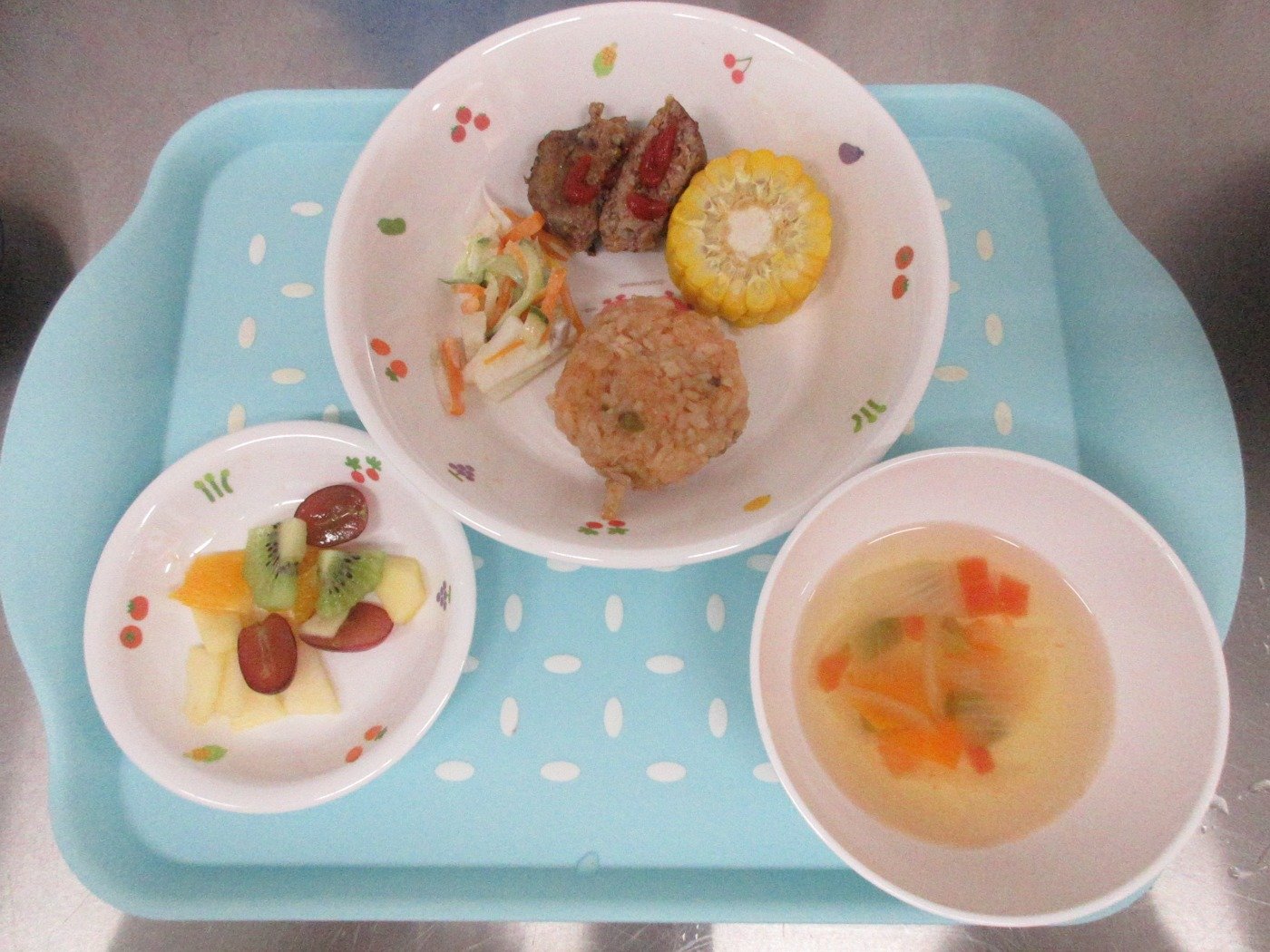 ぶどう、ハンバーグ、とうもろこし、りんご……