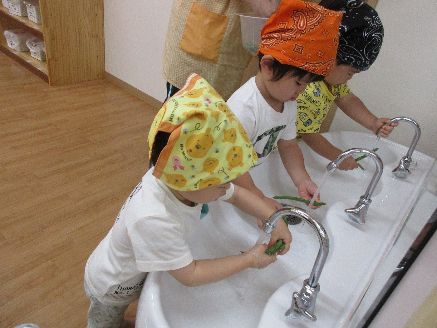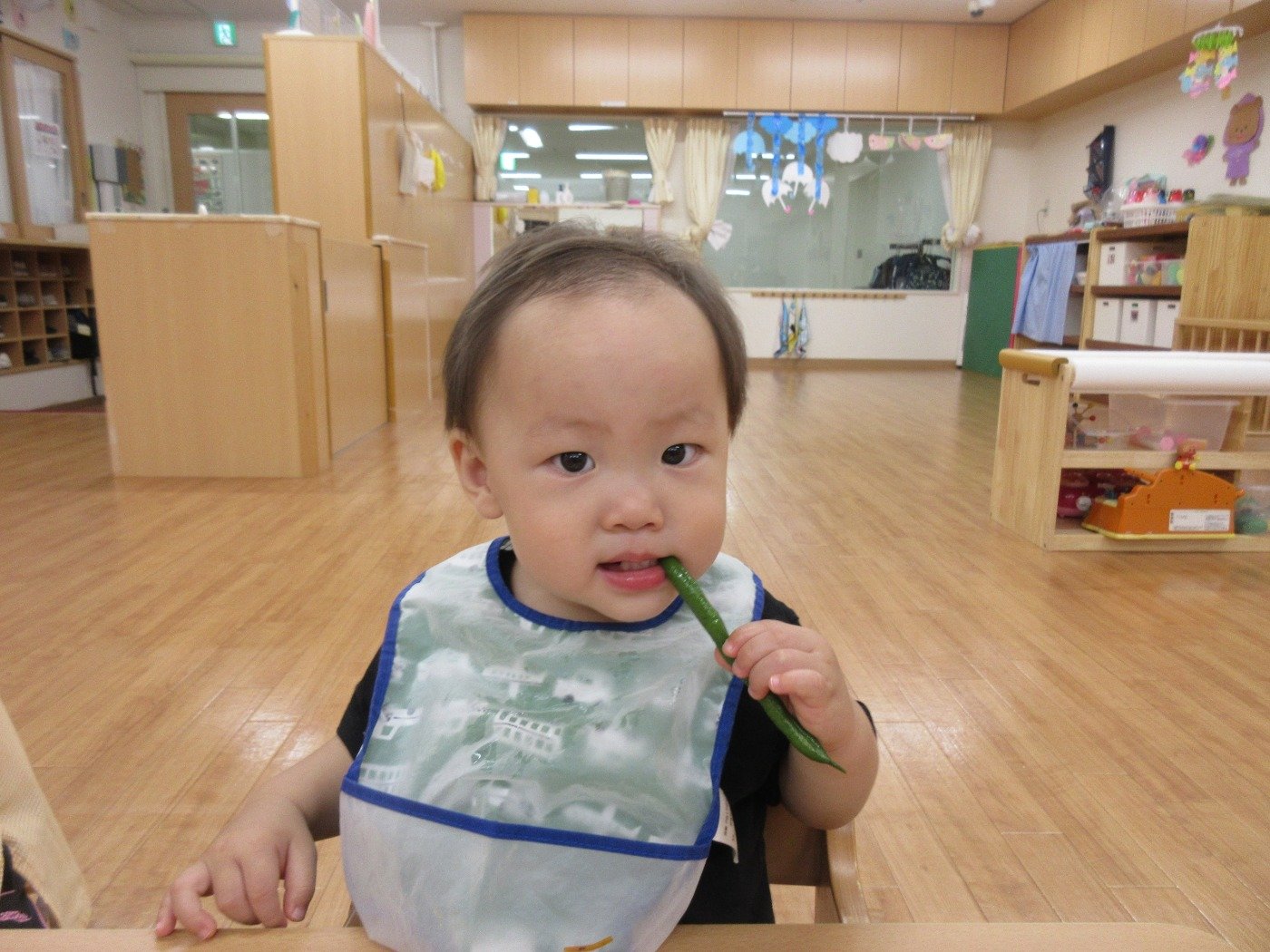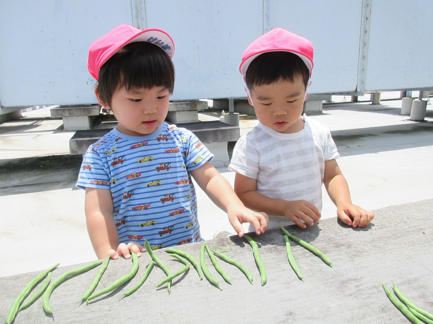 「いっぱい採れたね~💛」と、採れたインゲンを並べてお店屋さんごっこが始まりましたよ。