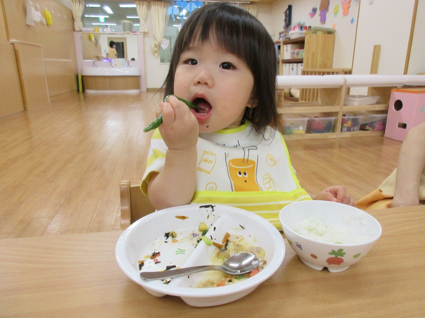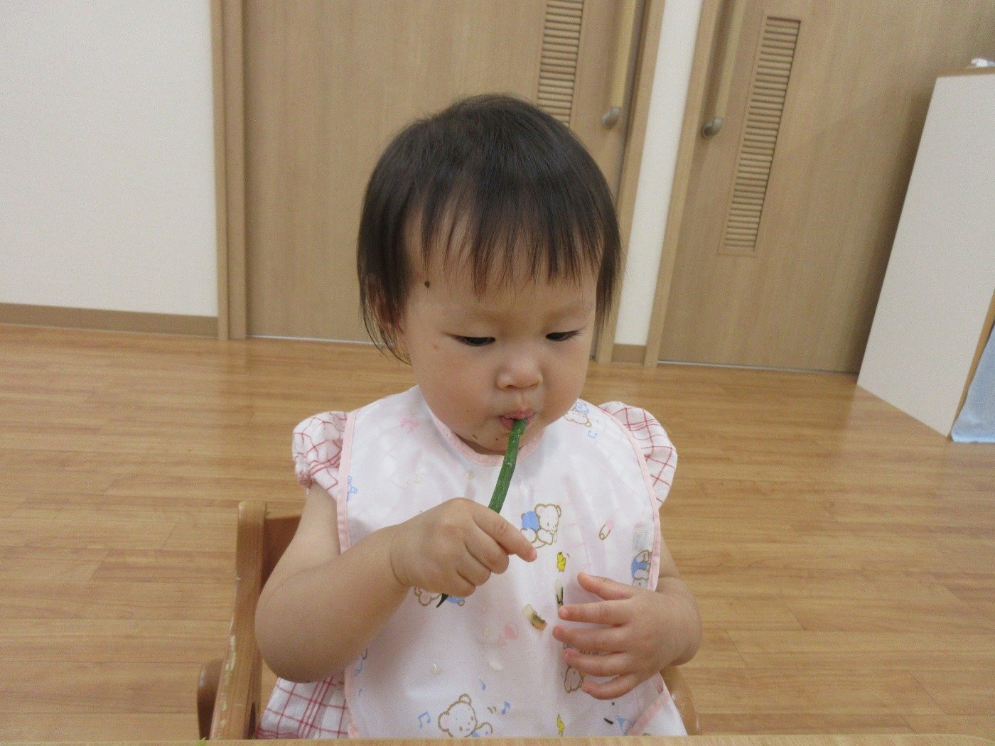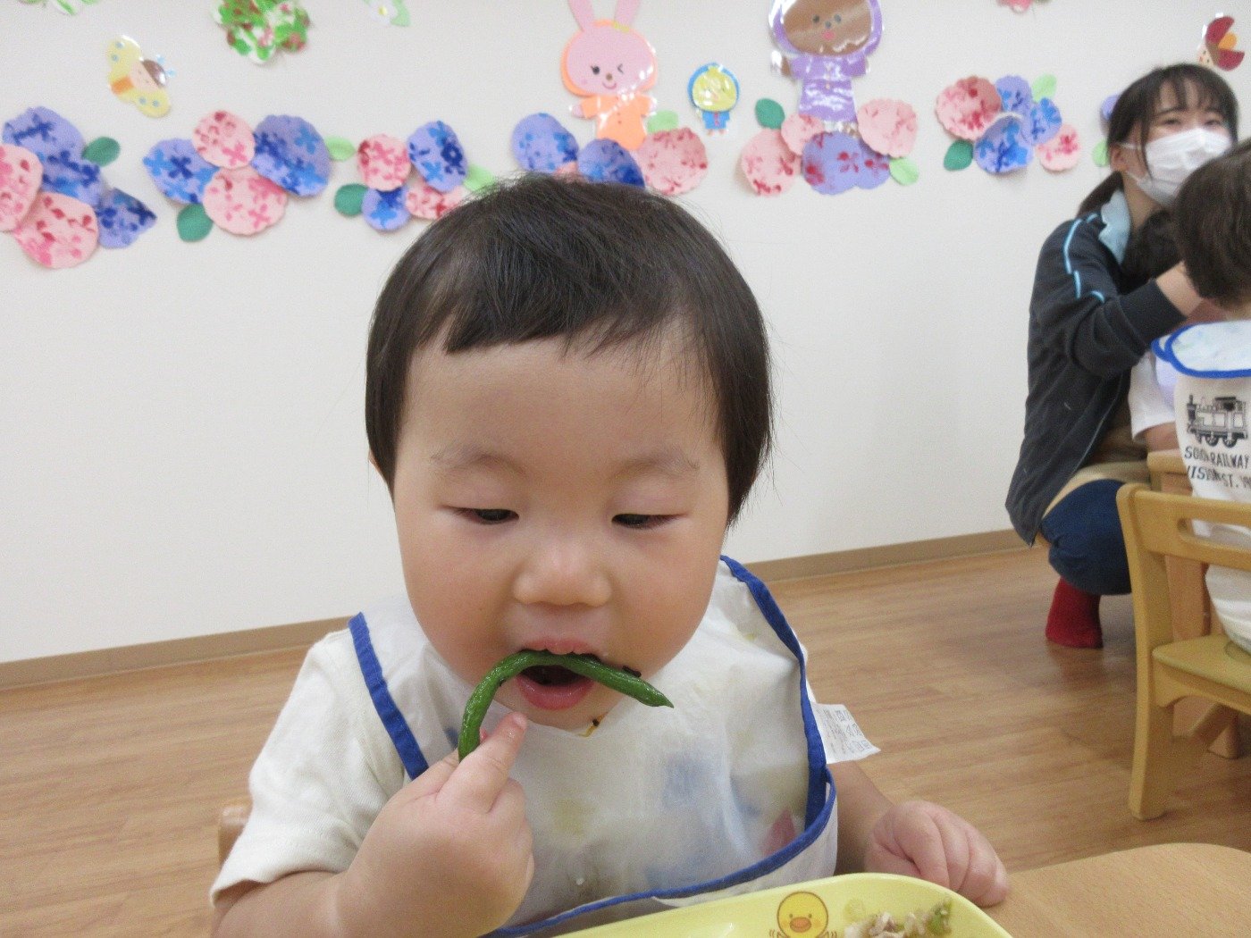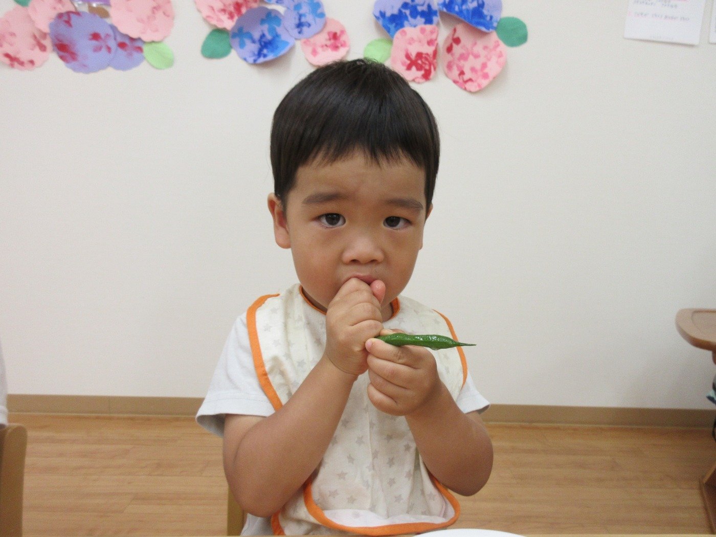 「いっぱい採れたね~💛」と、採れたインゲンを並べてお店屋さんごっこが始まりましたよ。