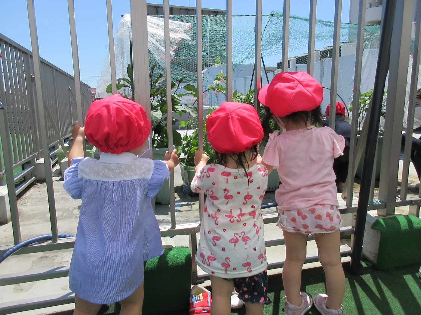 くま組さんが、さっそく屋上の野菜たちにご挨拶(^^♪