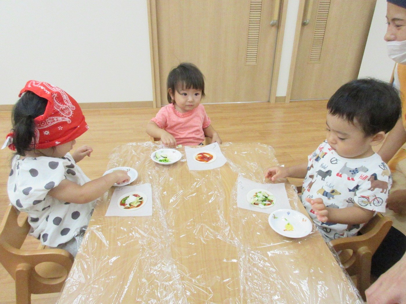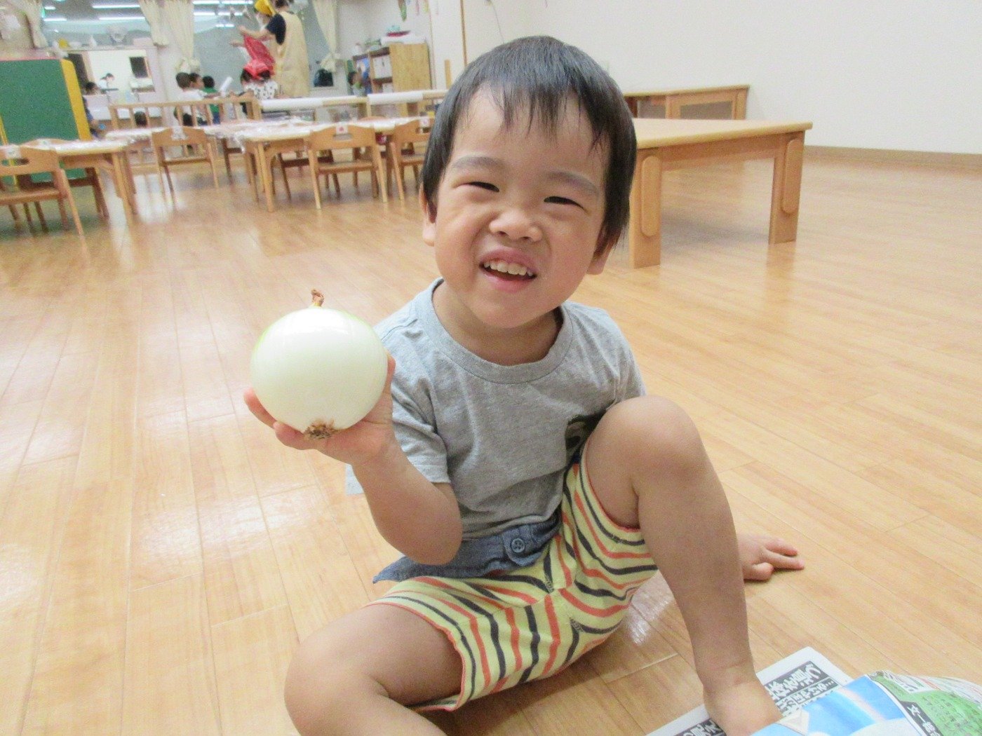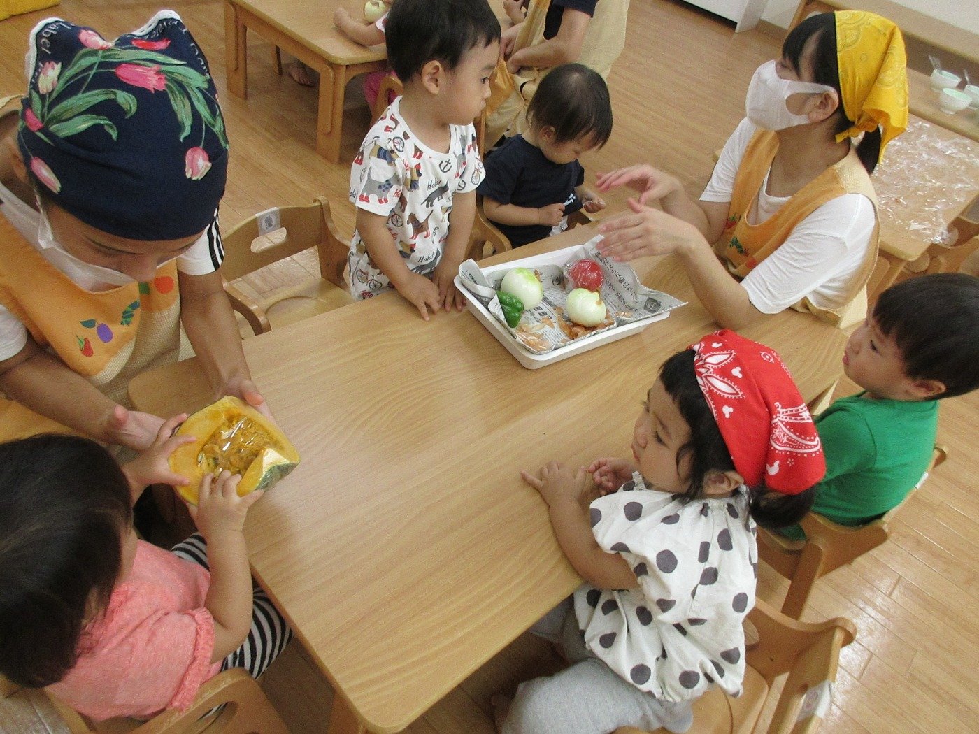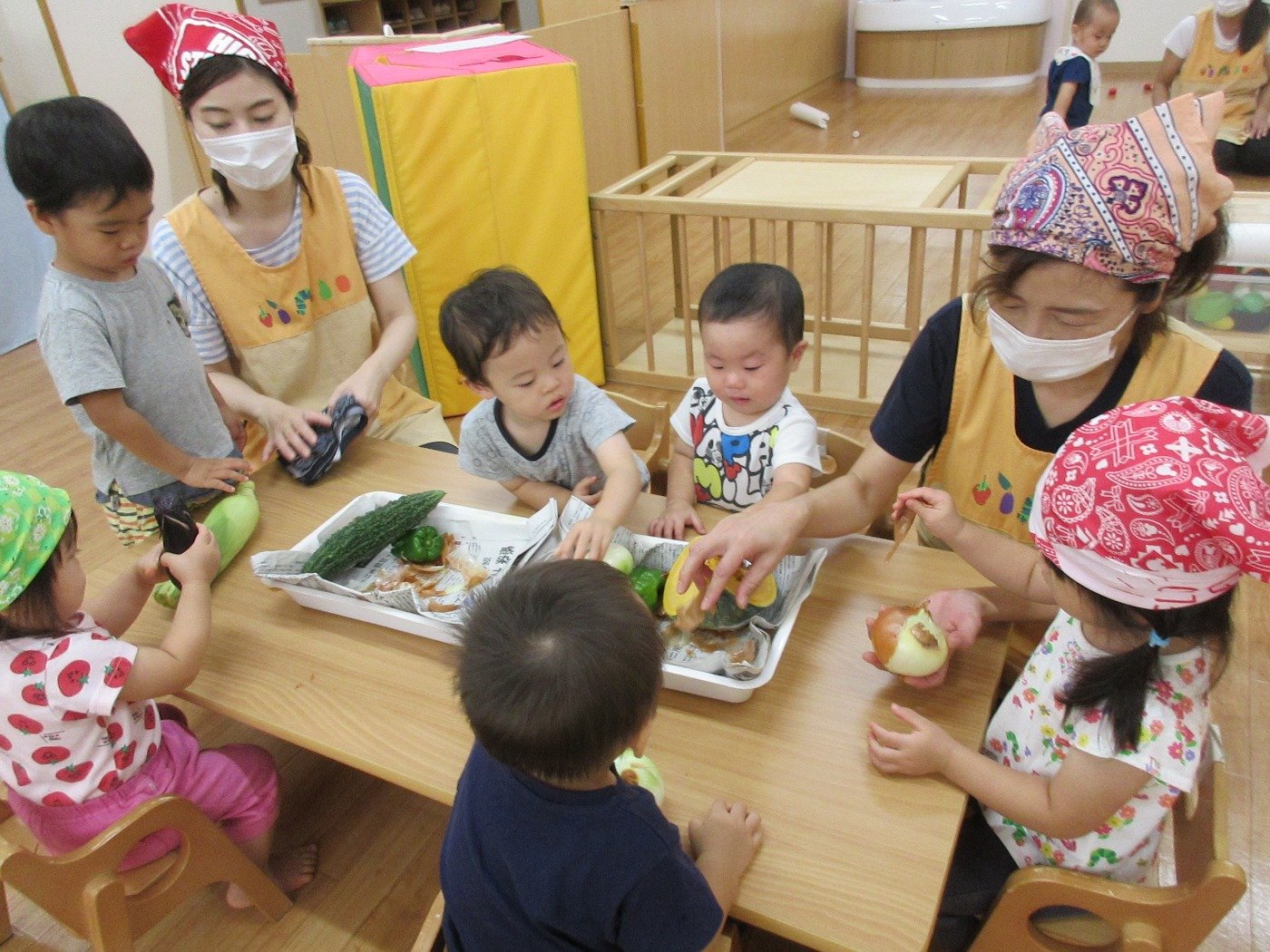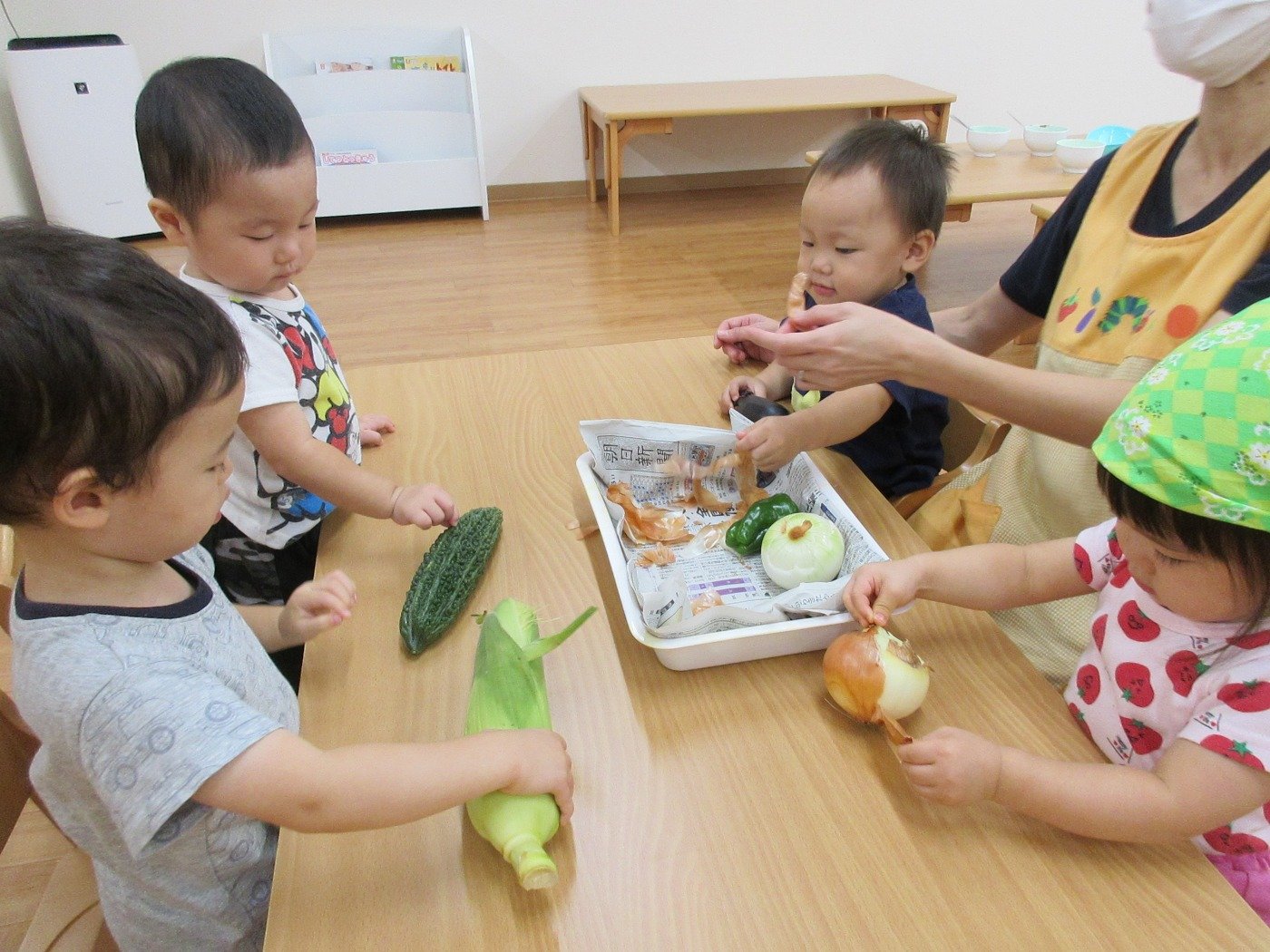 その間にうさぎ組さんは、先生が持ってきてくれた夏野菜のお勉強会(^^♪