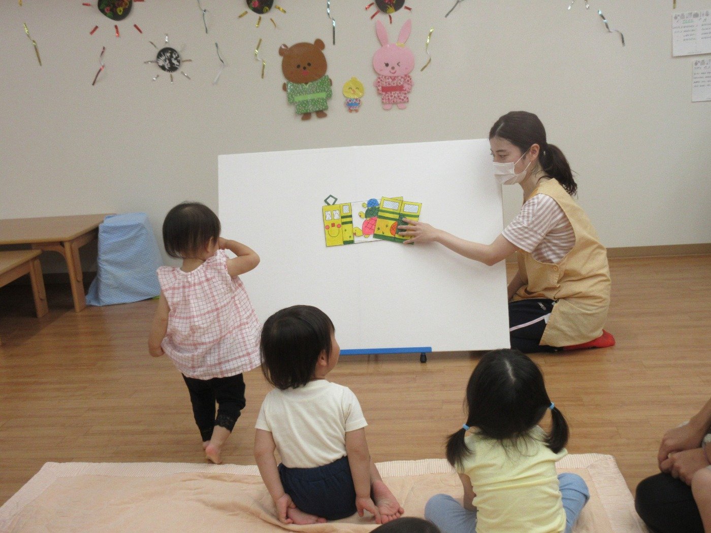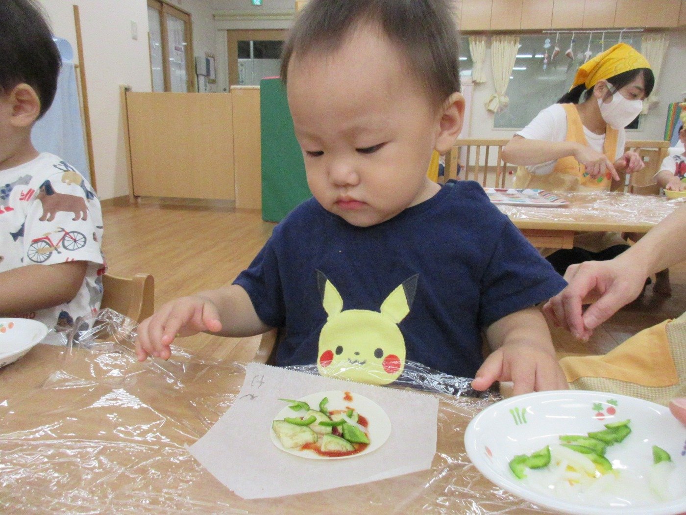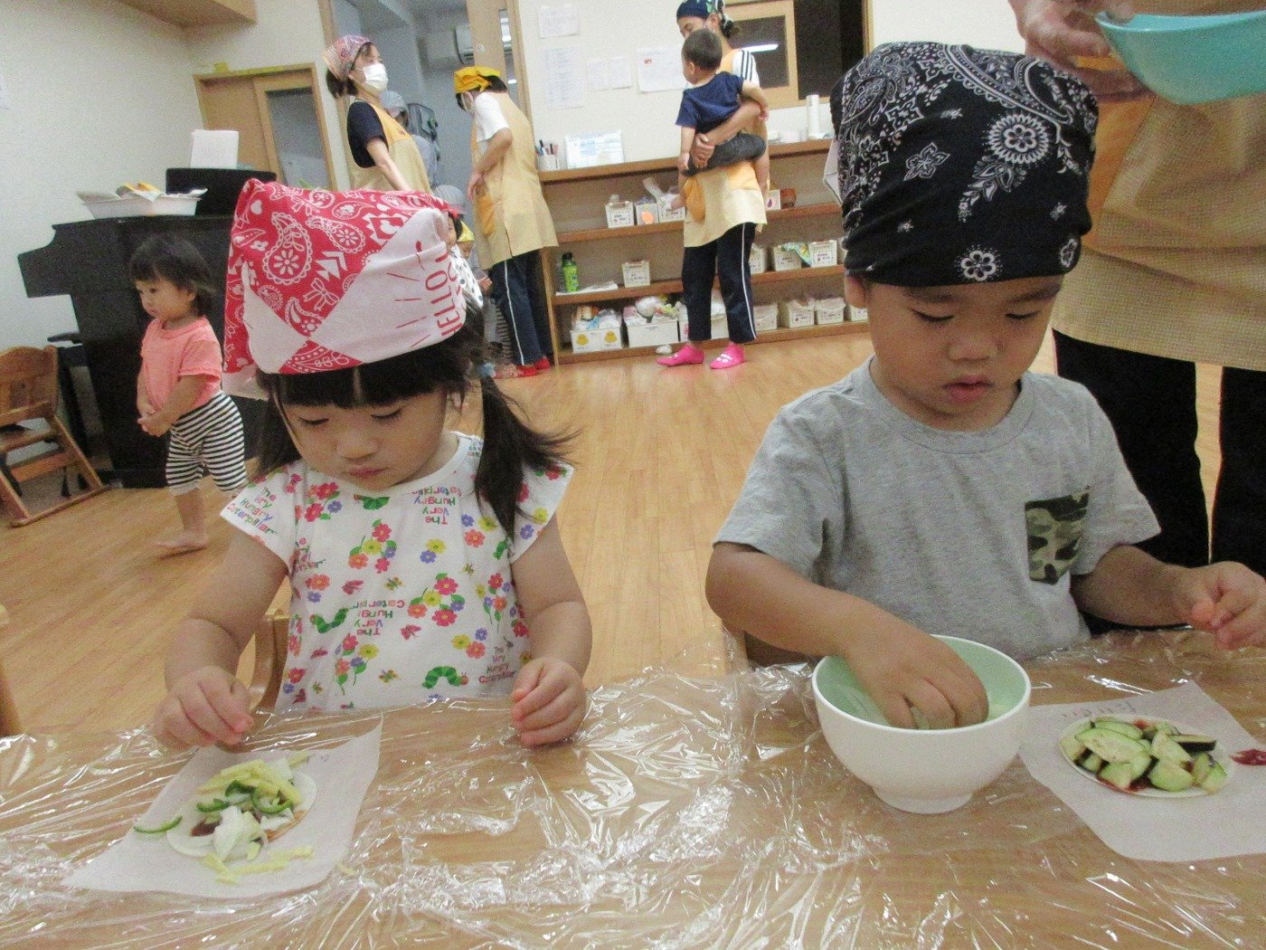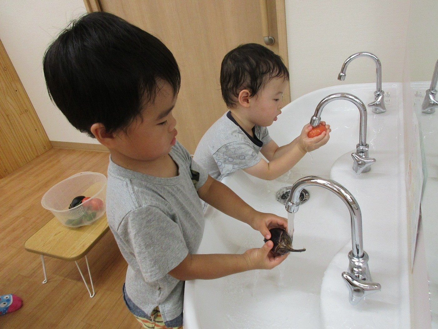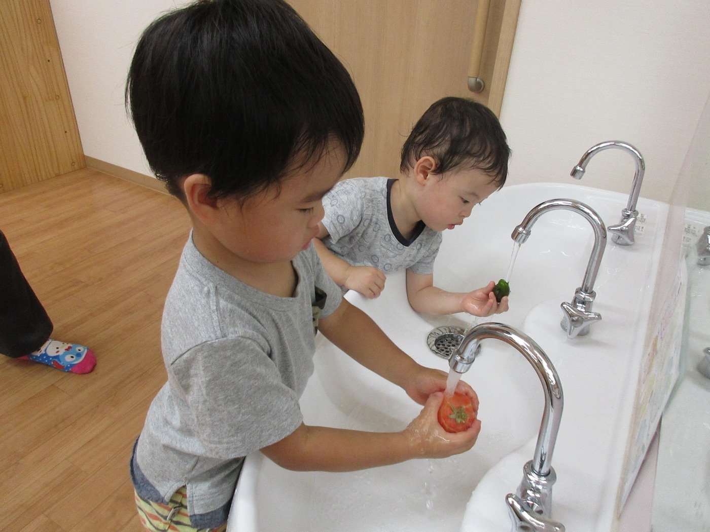 その間にうさぎ組さんは、先生が持ってきてくれた夏野菜のお勉強会(^^♪