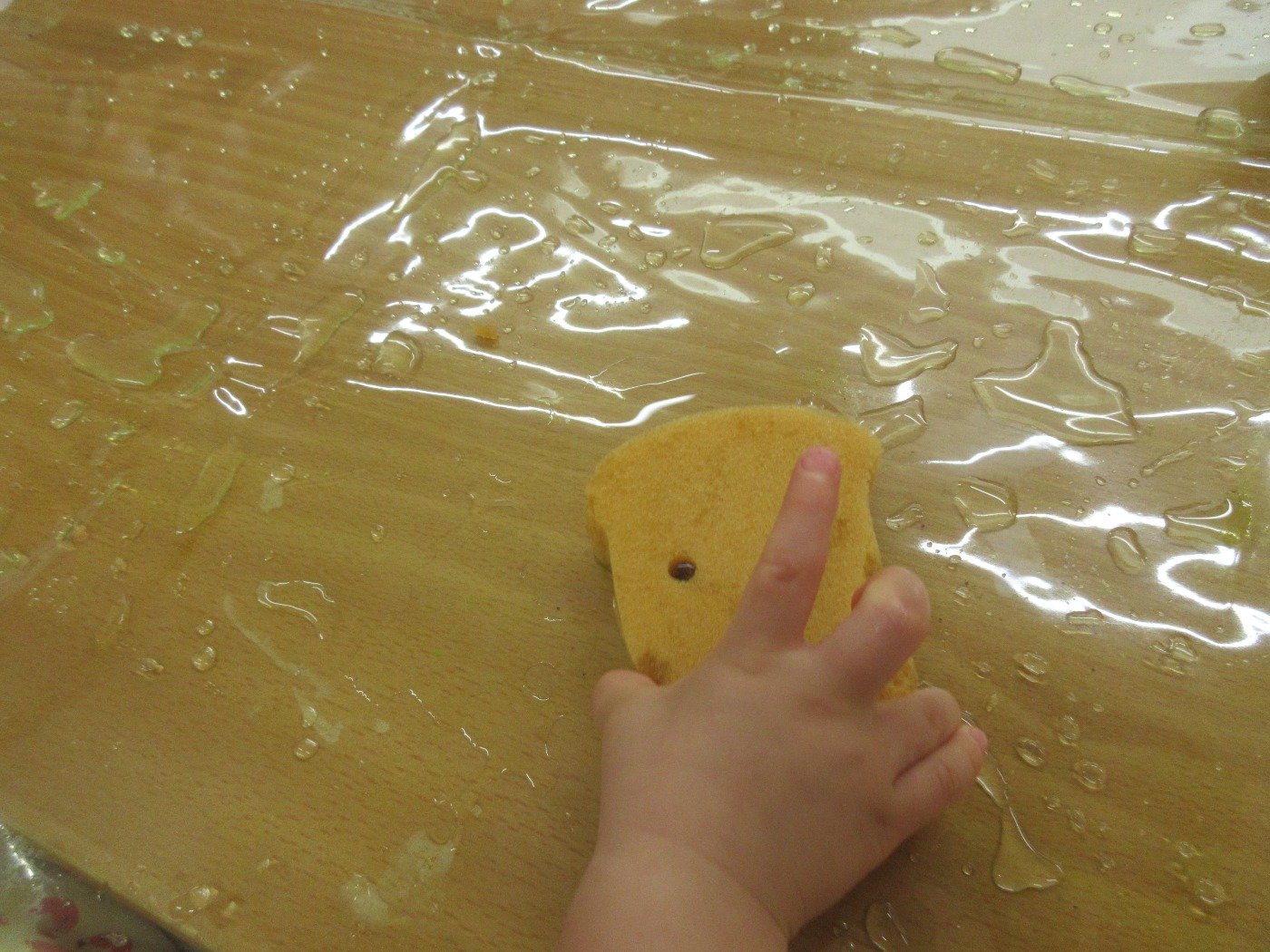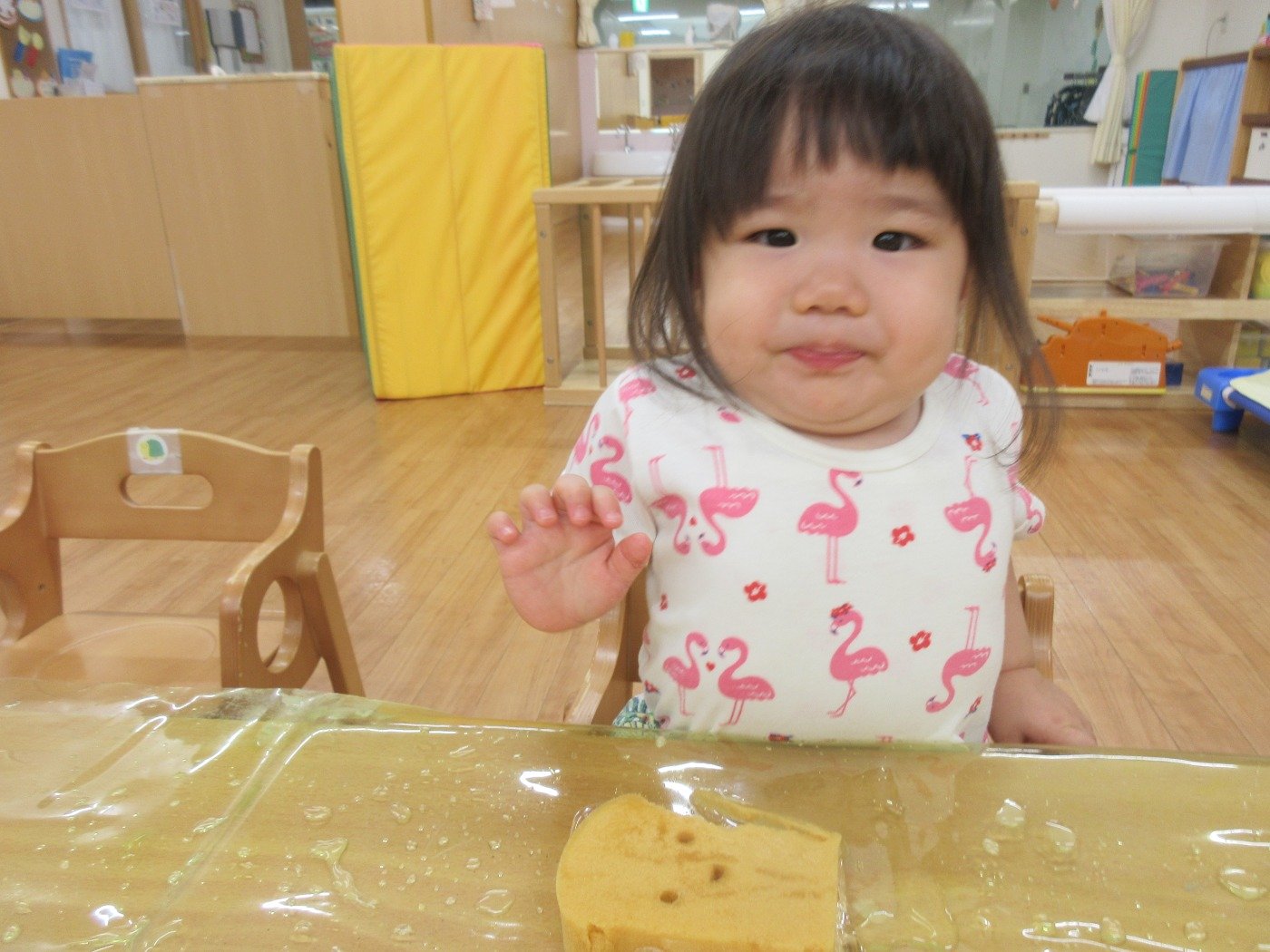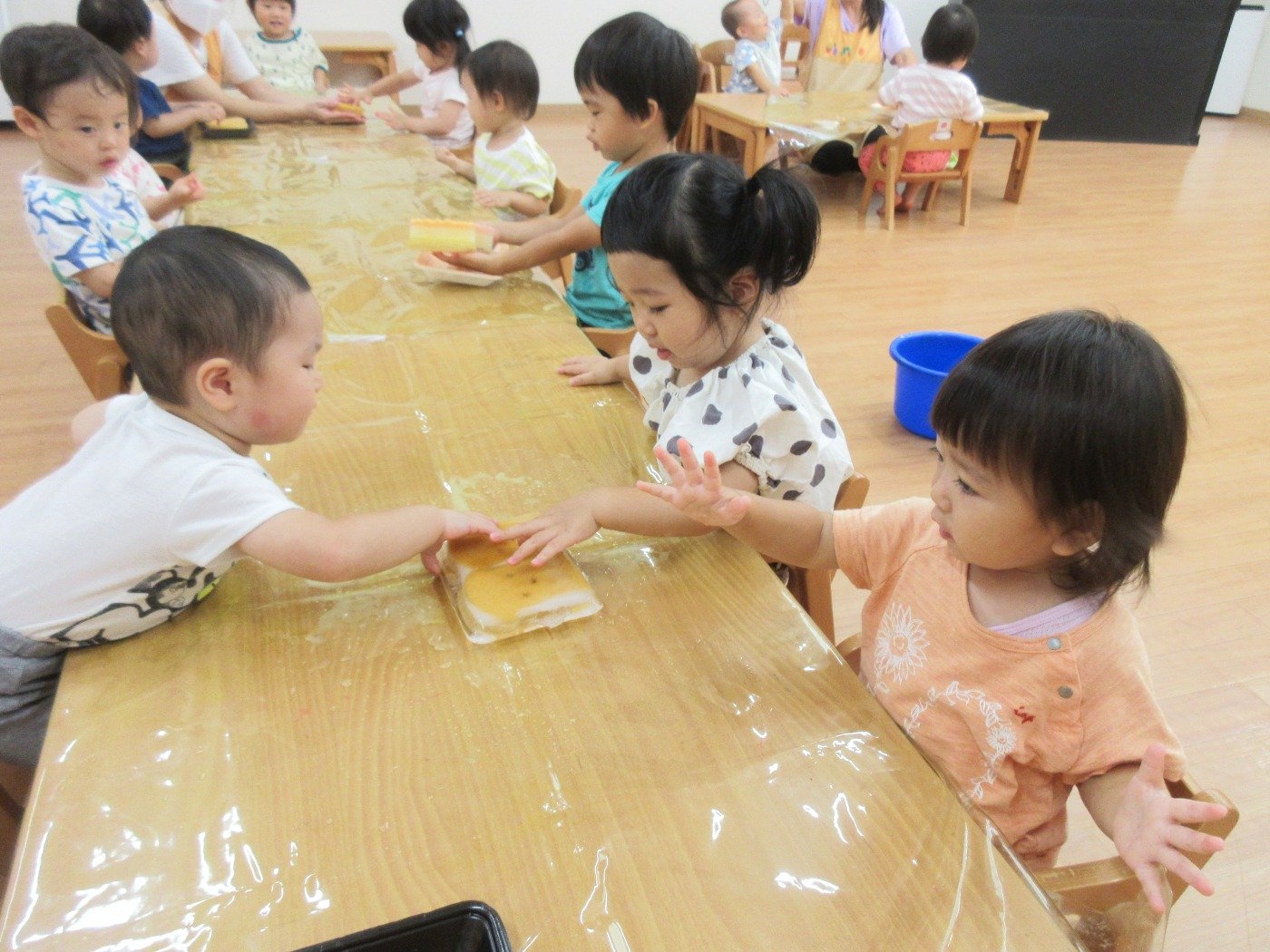 くま組のお友だちがスポンジにお水をふくませるのをお手伝い。
