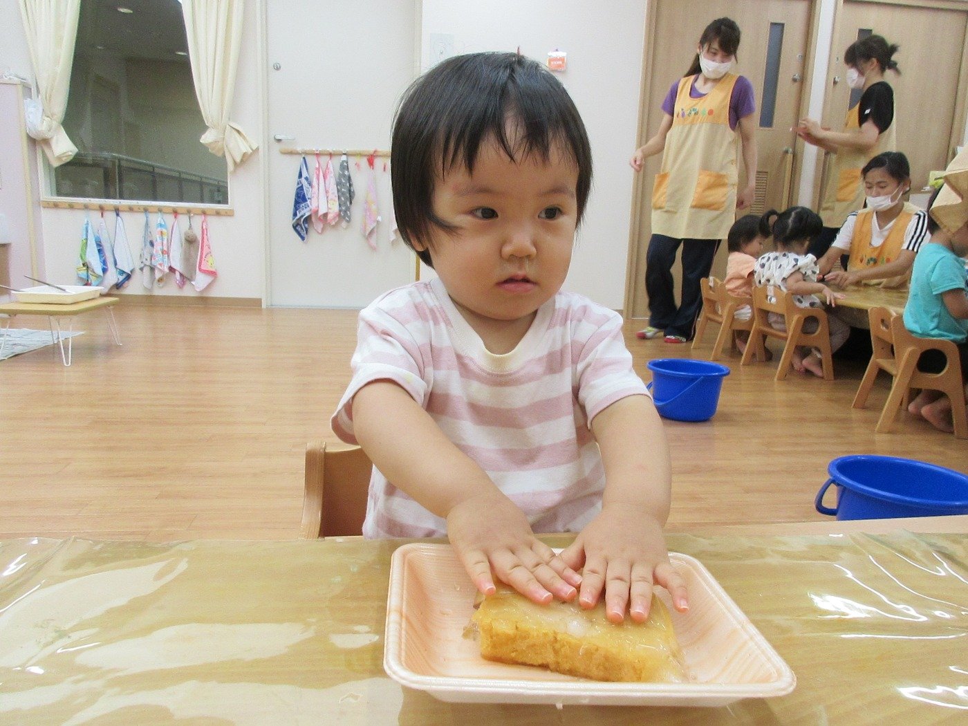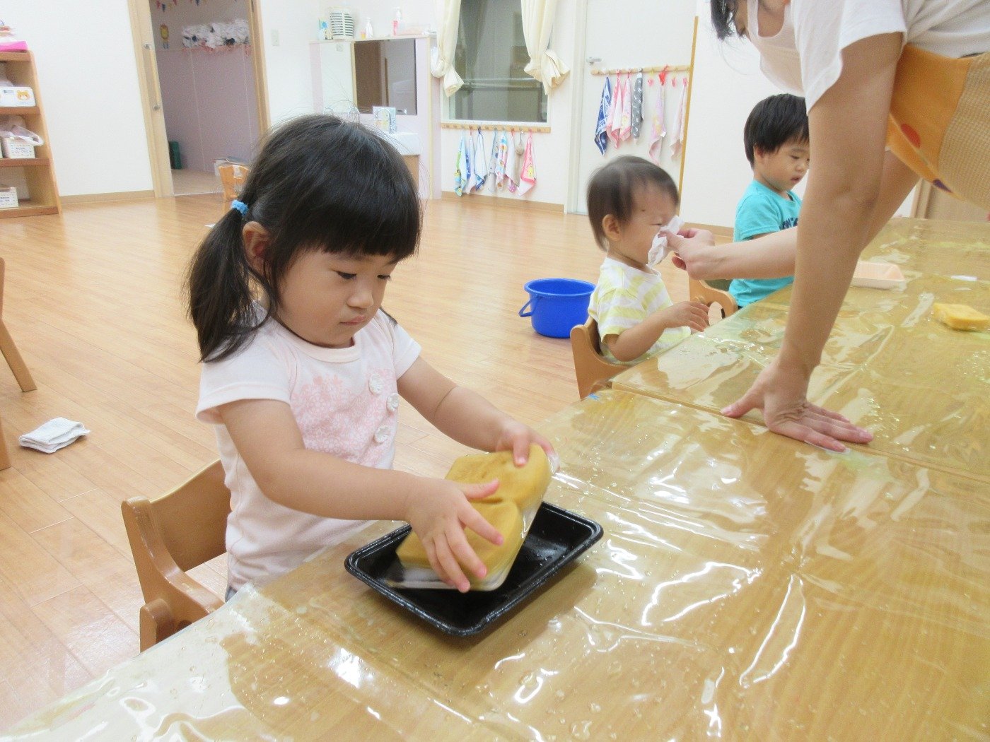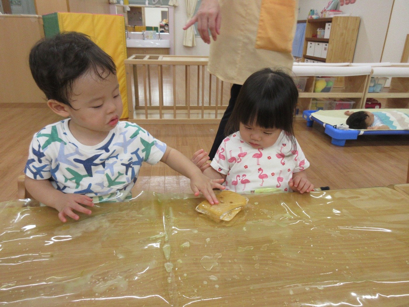 くま組のお友だちがスポンジにお水をふくませるのをお手伝い。