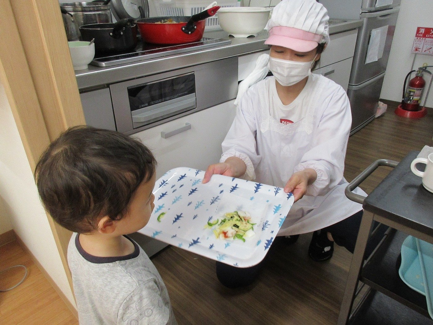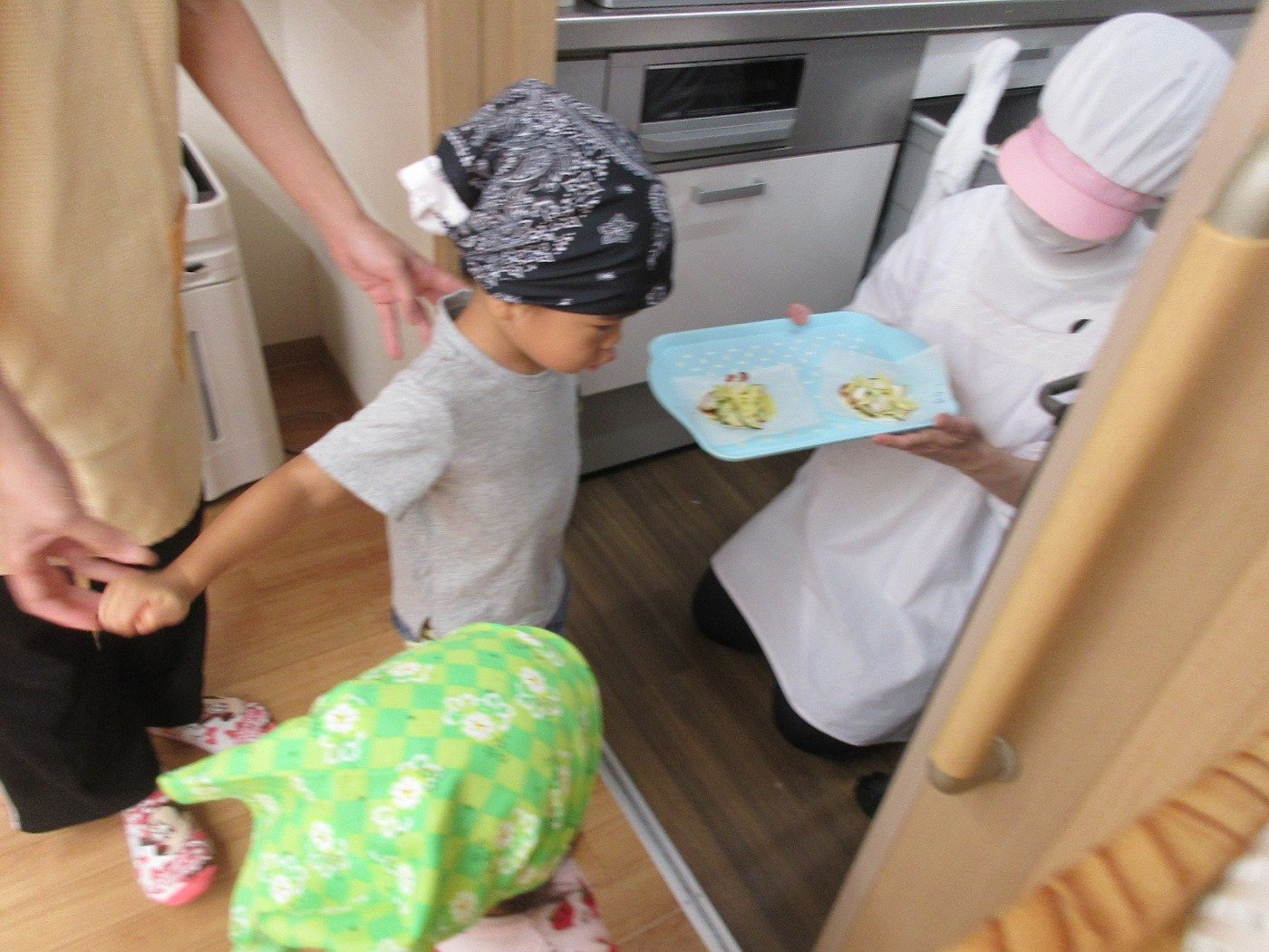 こちらでは、お野菜を洗い終えたくま組さんがお調理の先生に