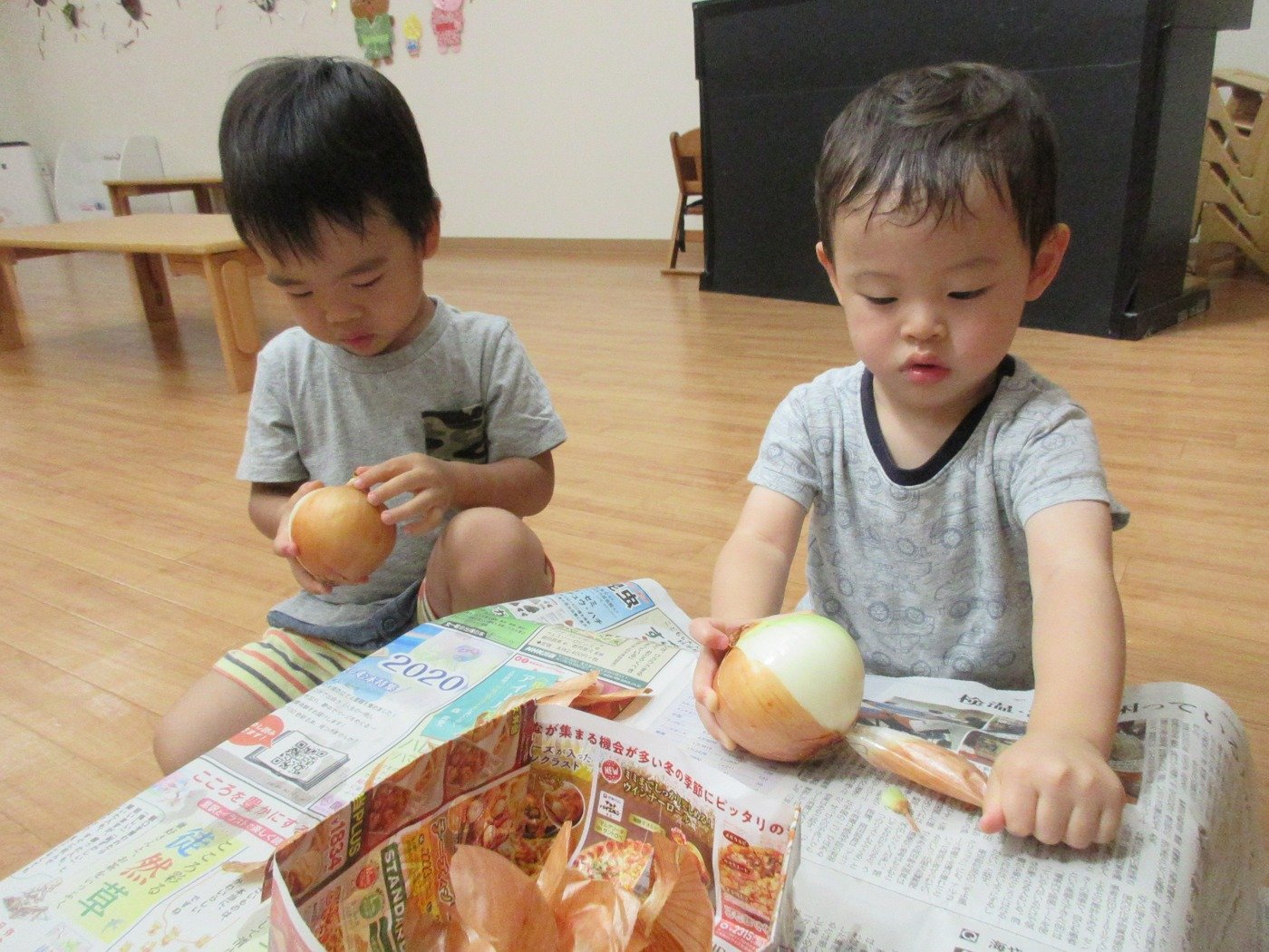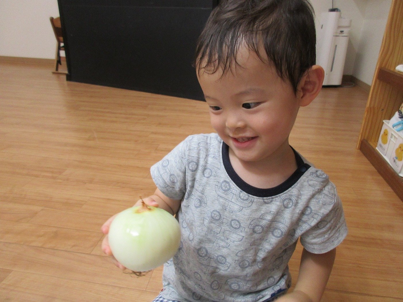 玉ねぎをつんつん触ってみたり、転がしてみたり♪