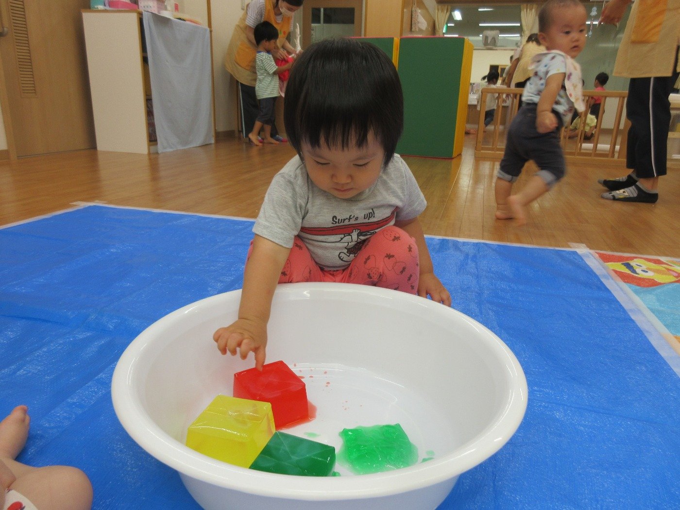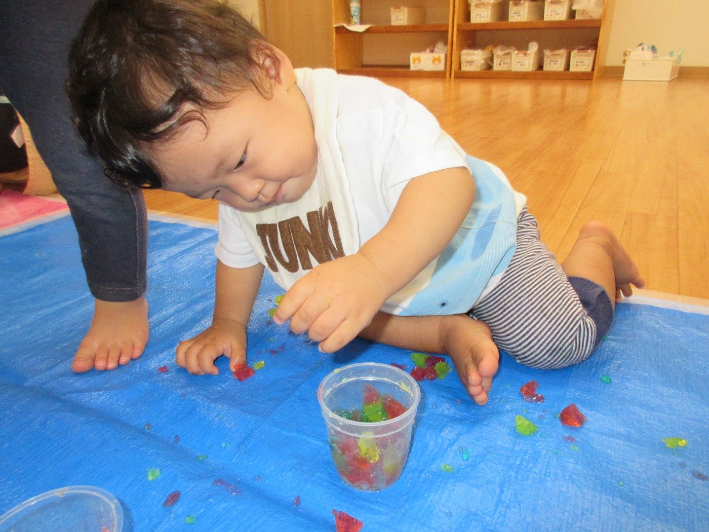 両手で ‘ぐちゅー!’ とつぶし、色々な色の寒天を混ぜたら