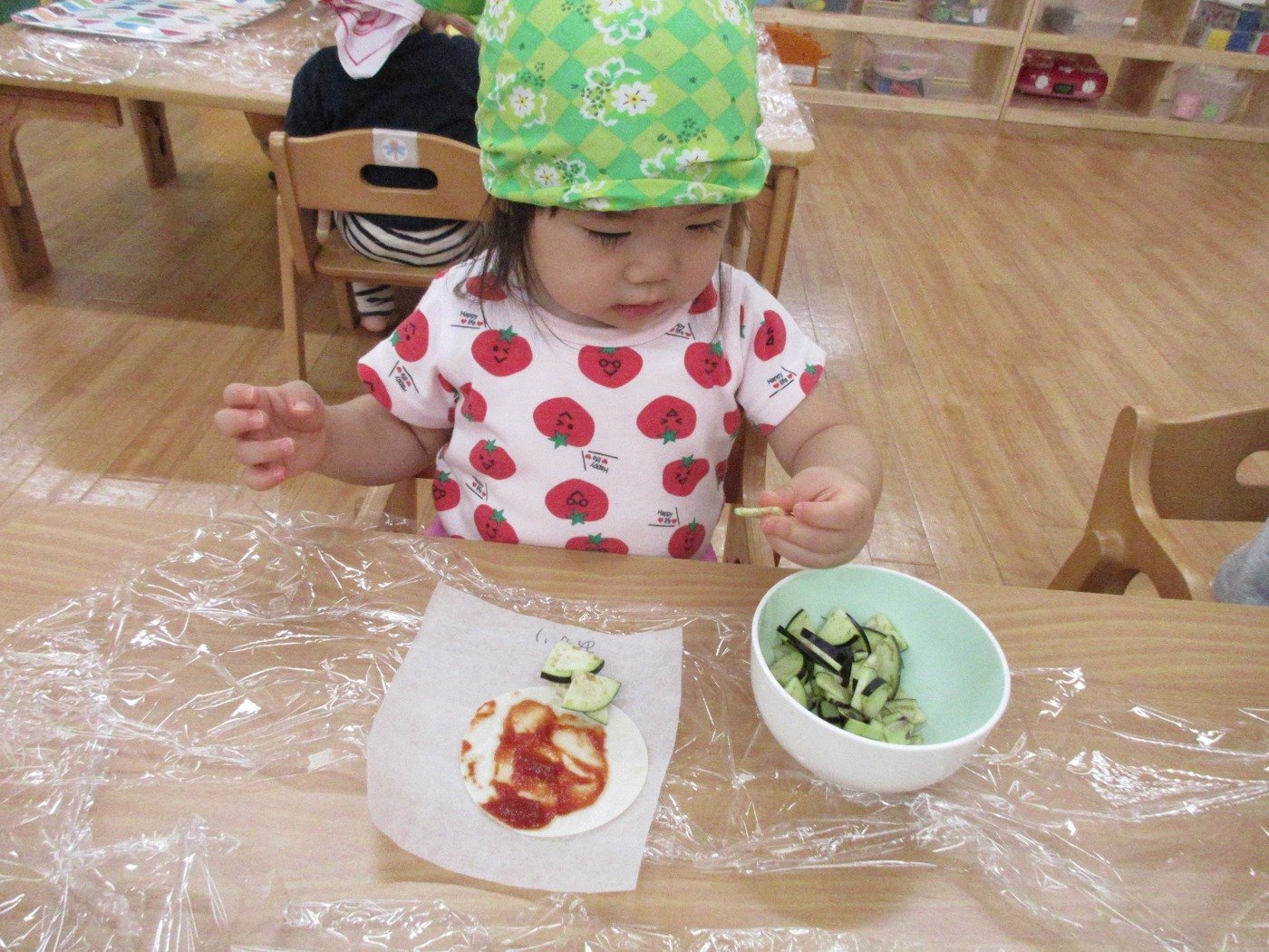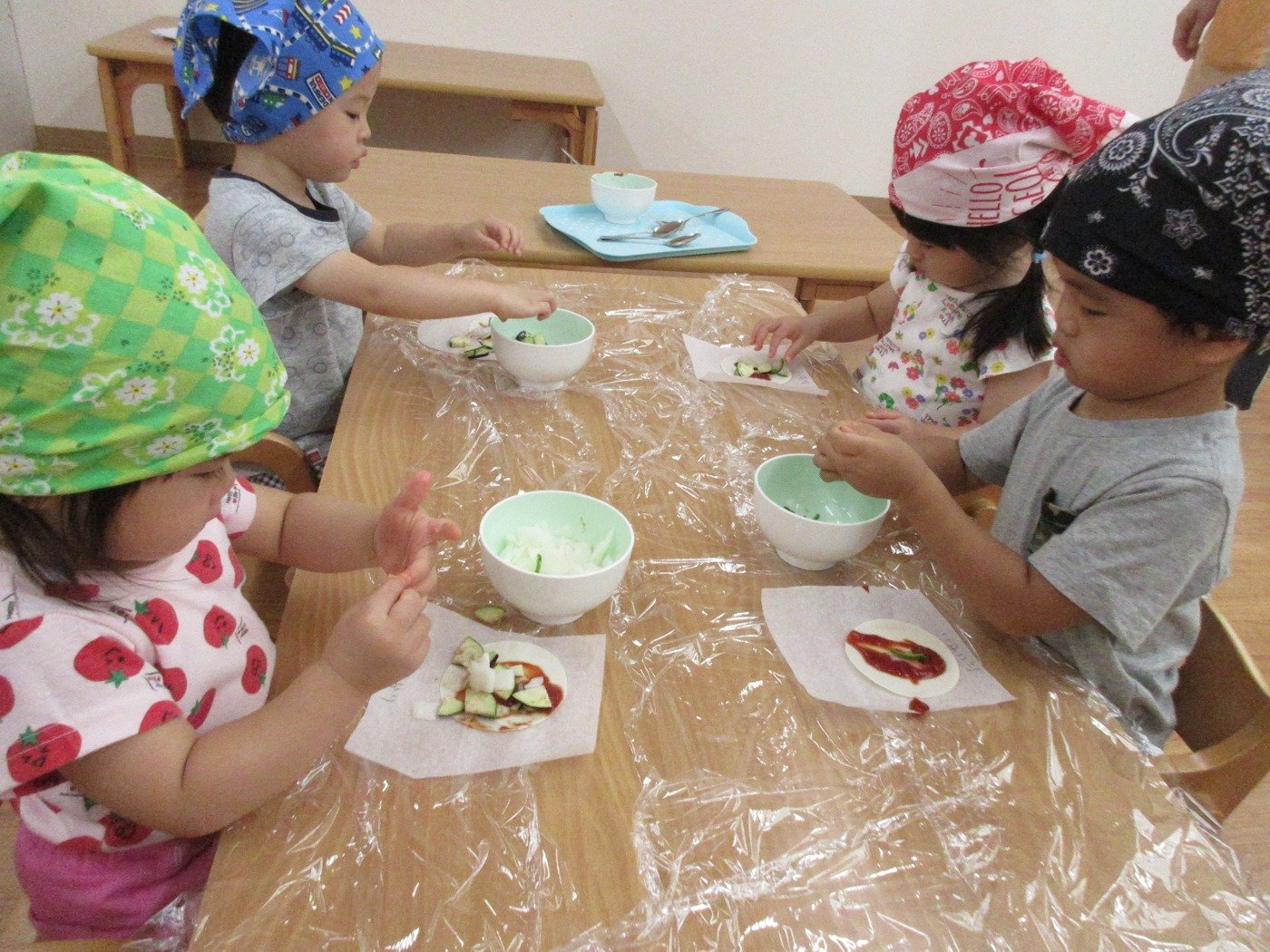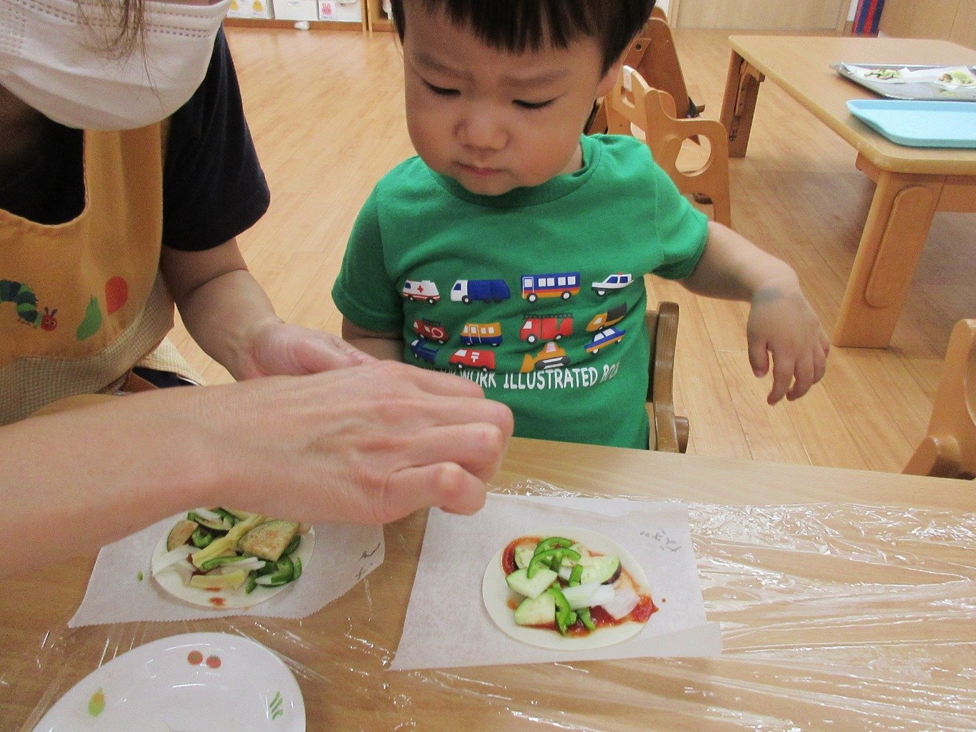 今月のクッキングは「夏野菜のどっさりピザ」。