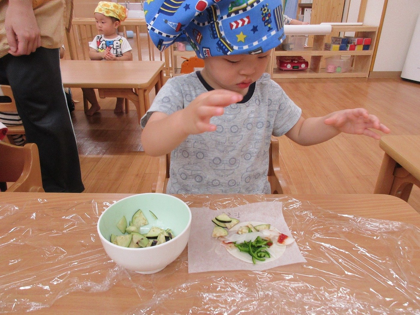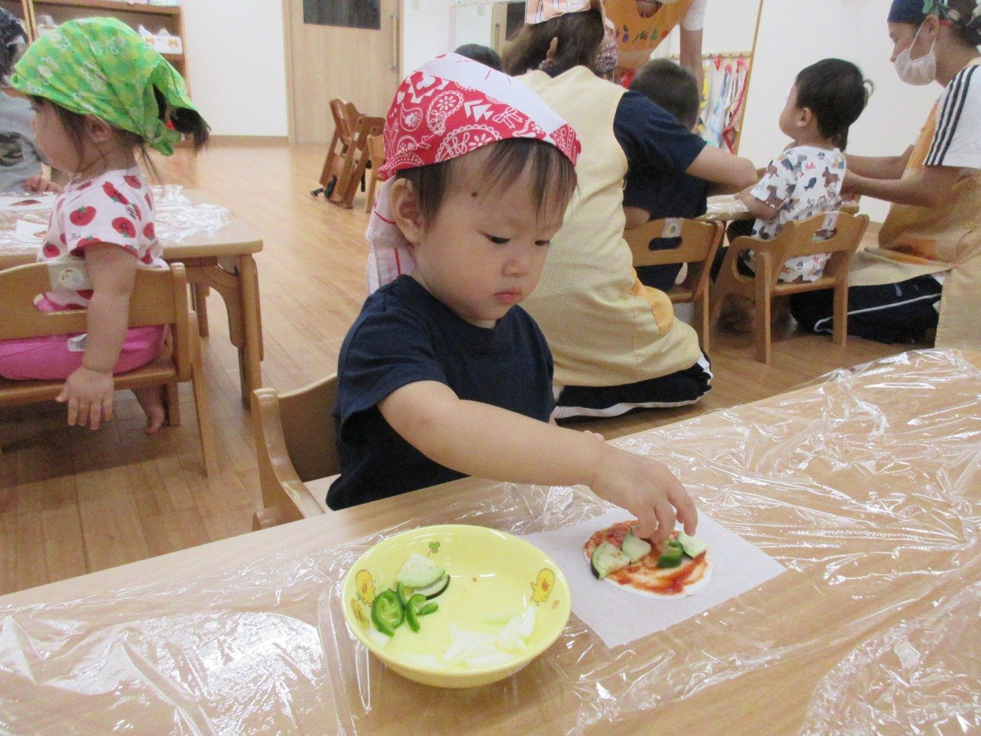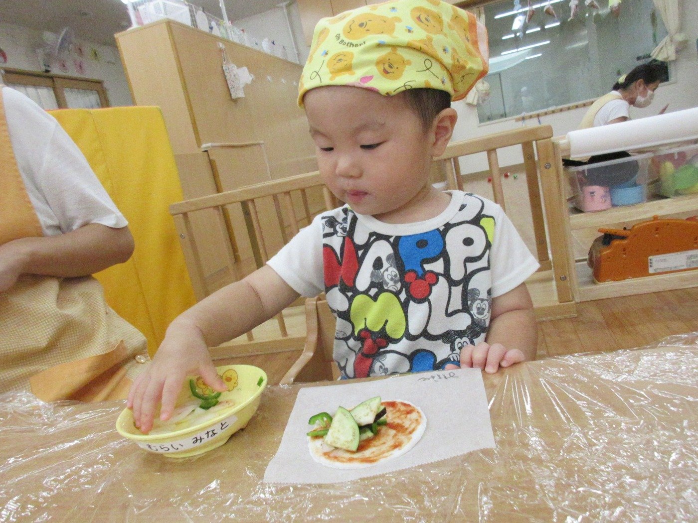 今月のクッキングは「夏野菜のどっさりピザ」。