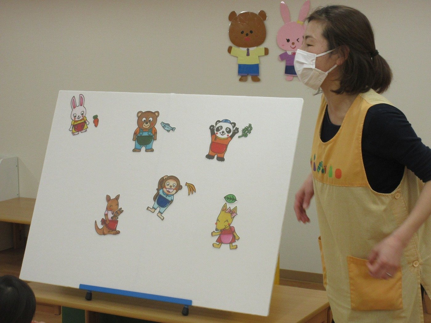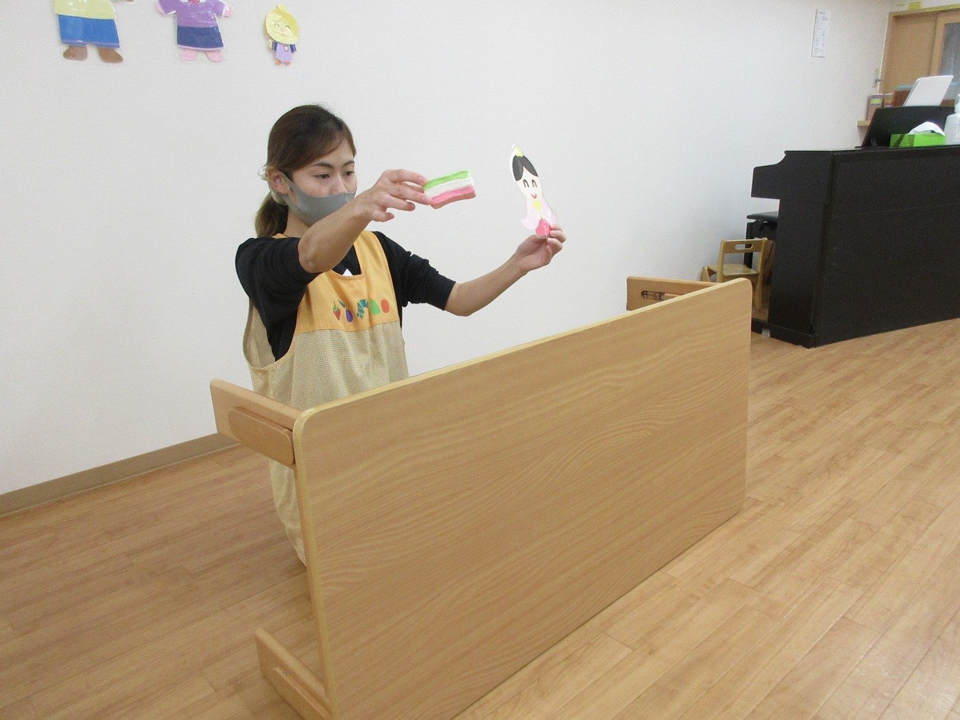 先生たちからの’お楽しみ’は「ぽんぽんポケット♪」のペープサート。