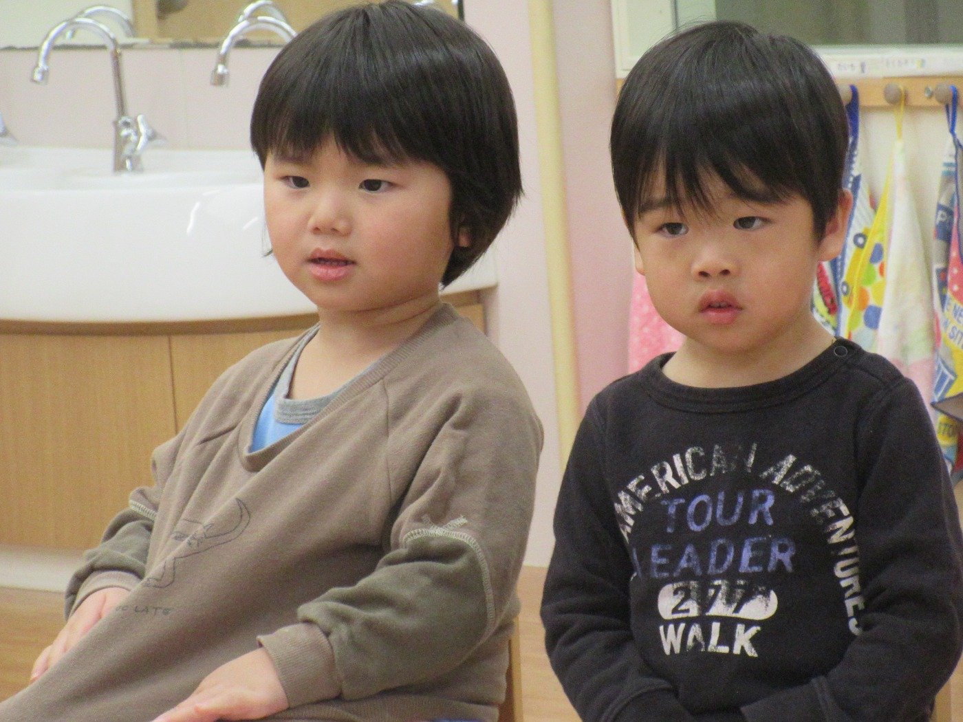 初めての主役にキョロキョロ落ち着かないひよこ組のお友達。