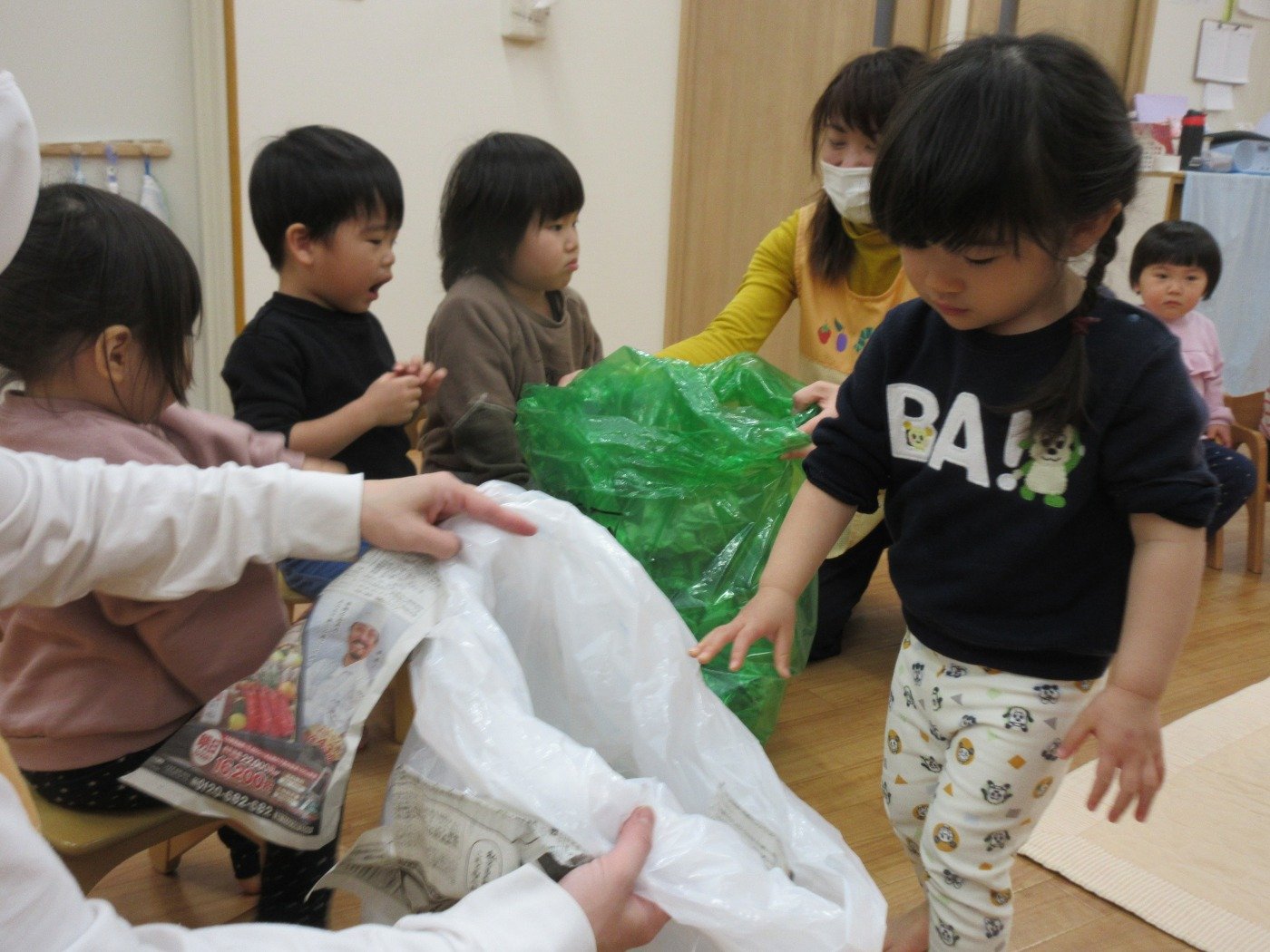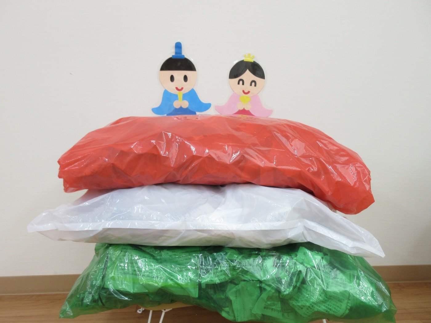 新聞紙を丸めて、赤・白・緑のビニールにどんどん詰めて行きます。