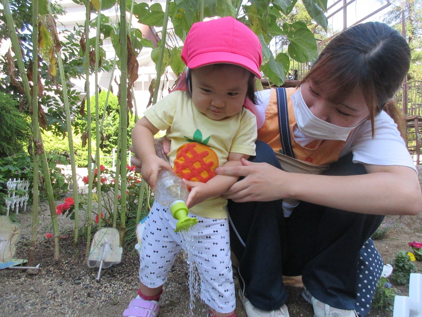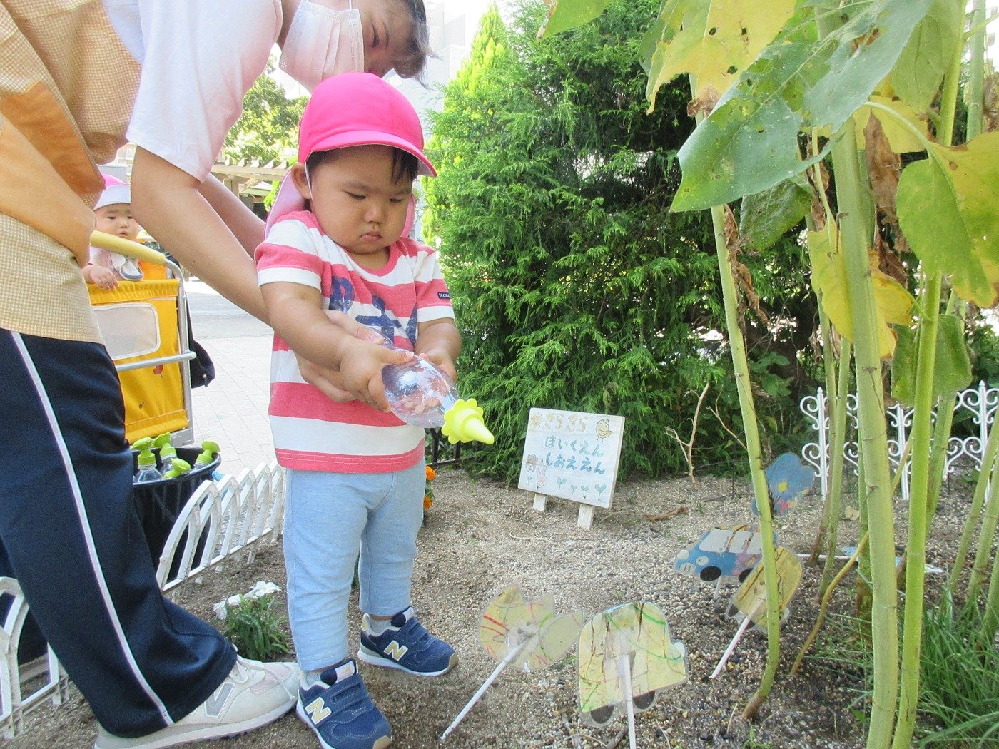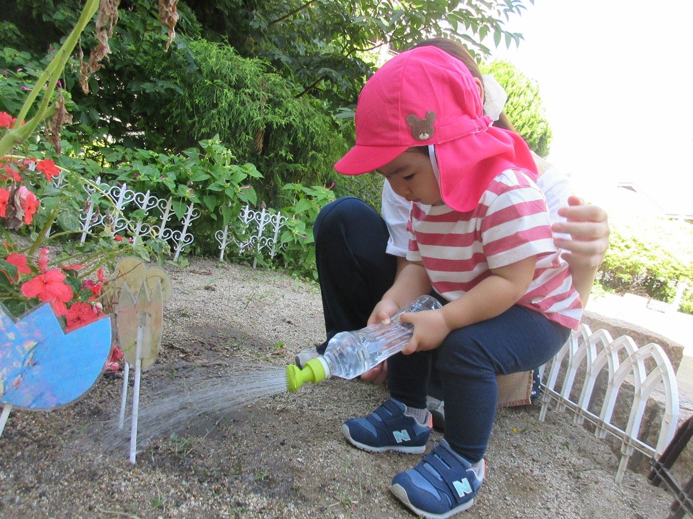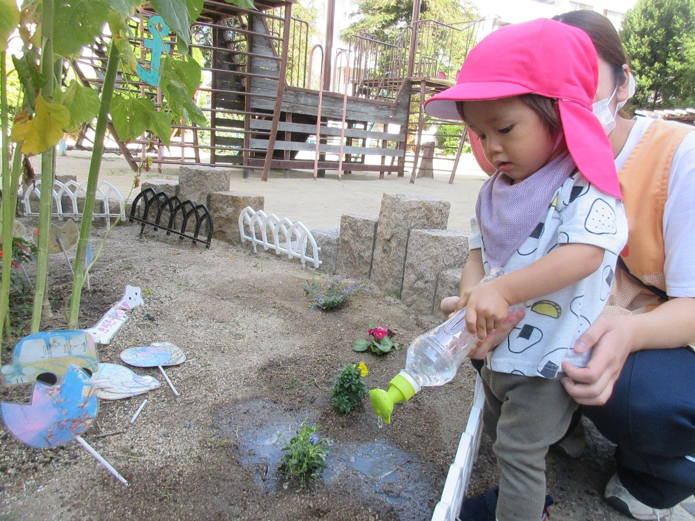 今日は、くまぐみさんが、植えたお花のお水あげに