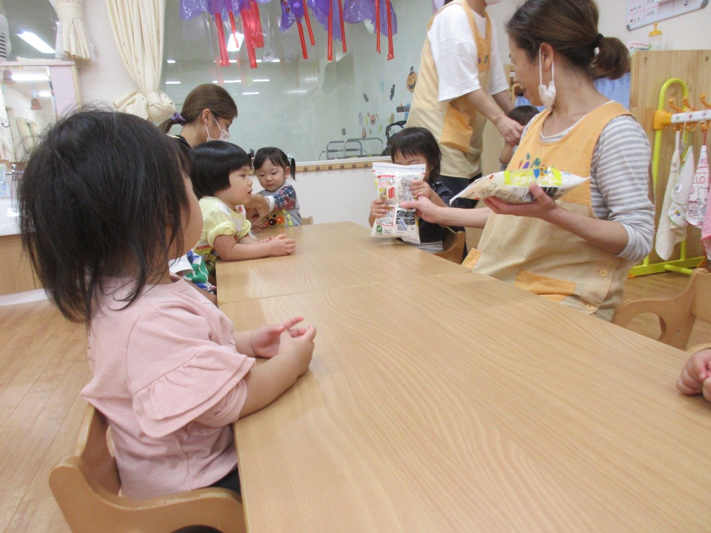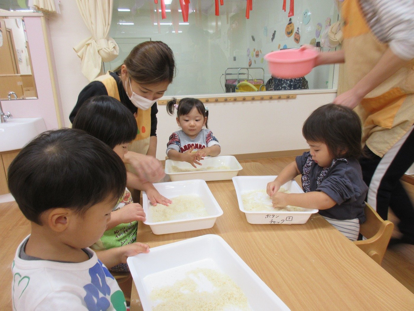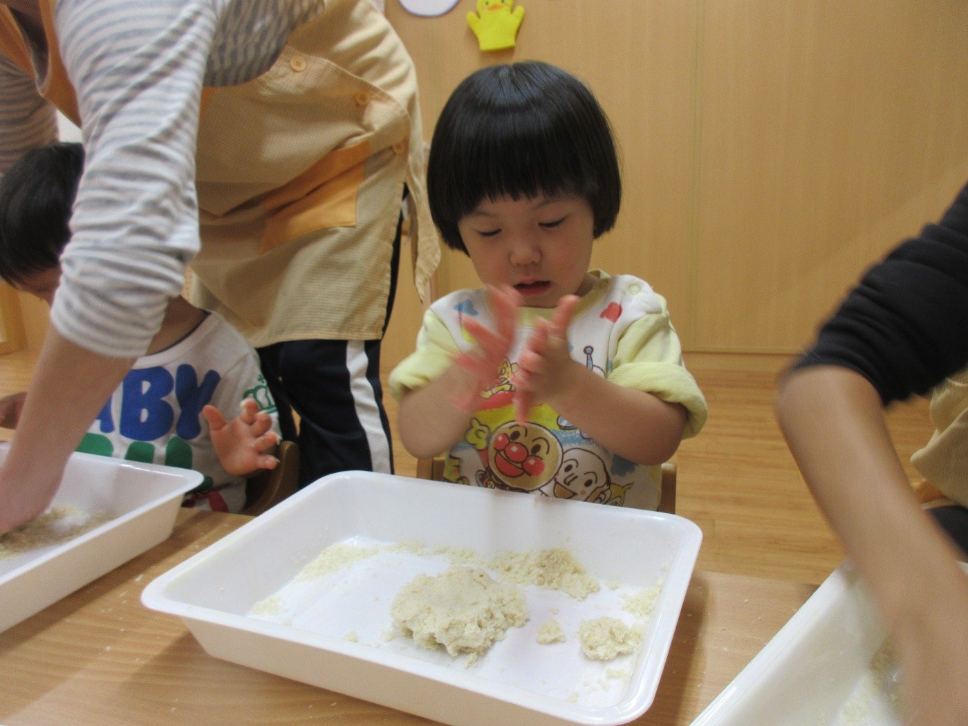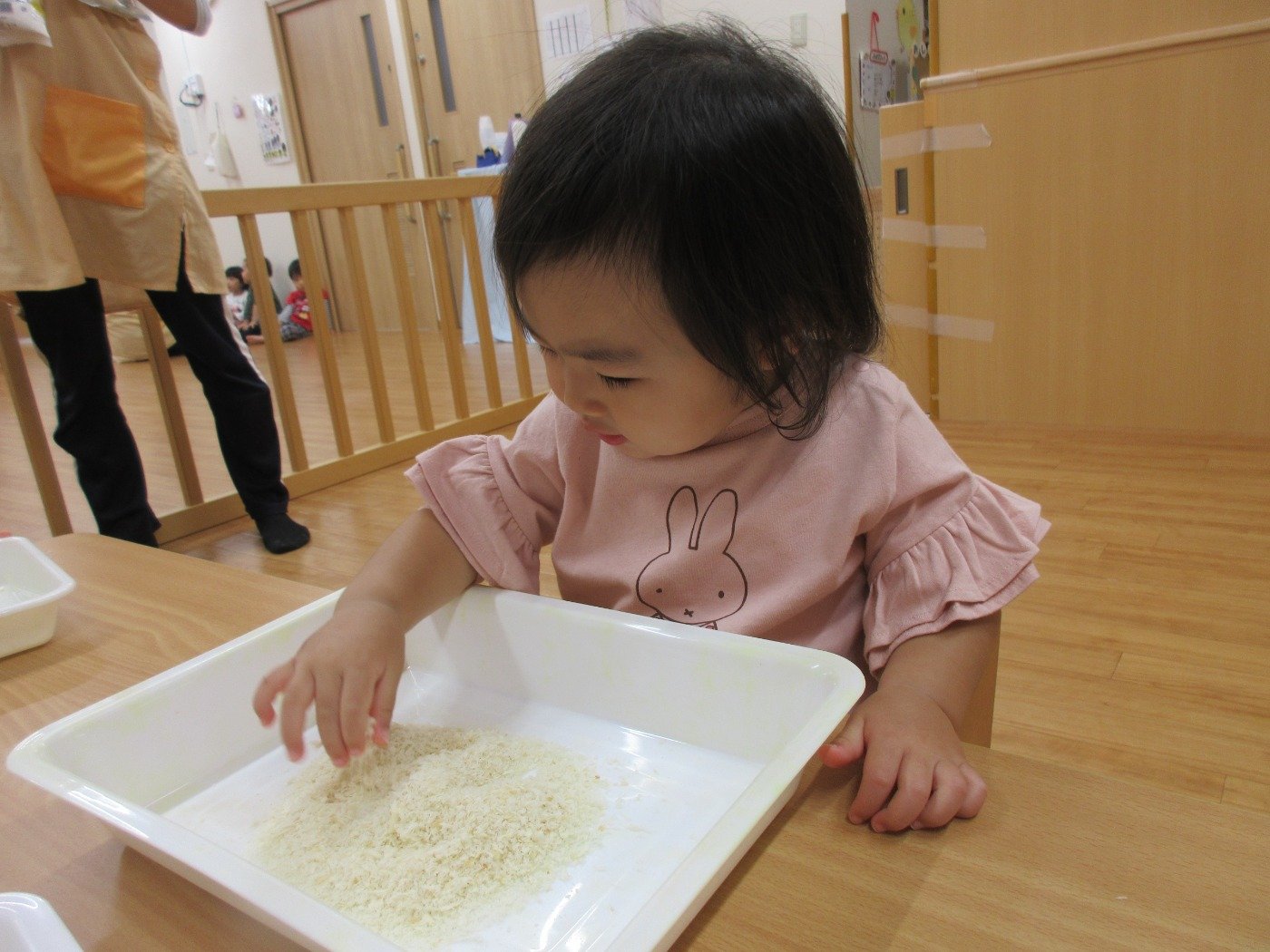 うさぎぐみさん ホームブログ 2021.10.25 今日は、にじ・おひさまの うさぎぐみさんで・・・ 子ども達の大好きな感触遊びをしました♪ パン粉に香りを・・・くんくん 手に触れて・・・ざらざら? お水をいれてもらい、こねこね♪ パン粉で、「かおり」「手触り」「感触」を楽しみました。 魔法の粉を入れてもらうと あらっ!!不思議 みどり・きいろに変身! 子ども達も、思い思いに、まるめたり・・・ちぎったり いっぱい感触遊びを楽しみました♪