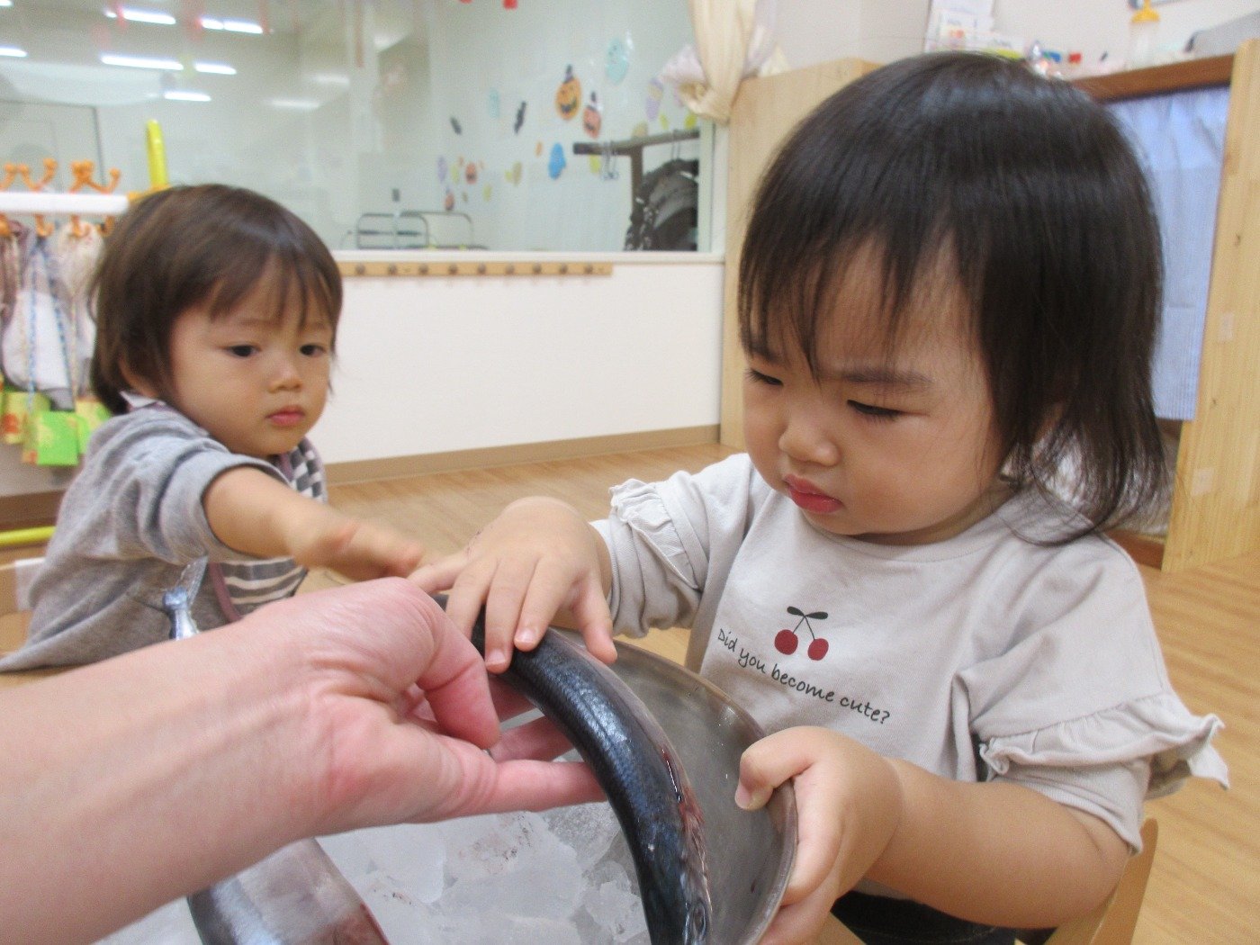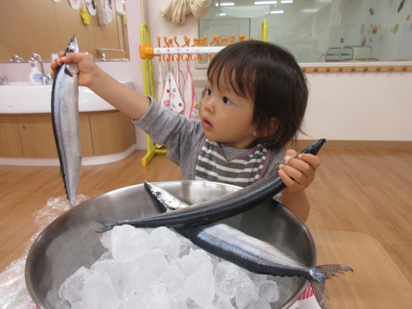 にじぐみさん ホームブログ 2021.10.27 今日は、お給食で秋の旬の「さんま」🐟がでました♪ 子ども達は、大きな「さんま」にビックリ!! おそるおそる、さんまに触れ見たり・・・ よしよししたりしていました。 給食に出てくると、ぱくぱく 食べる子ども達で圧力釜で骨まで柔らかくしてくれているので まるごと「さんま」を堪能しました♡