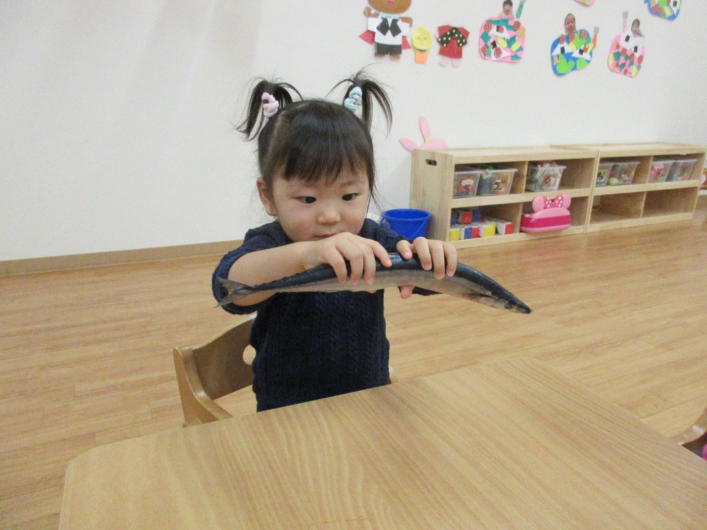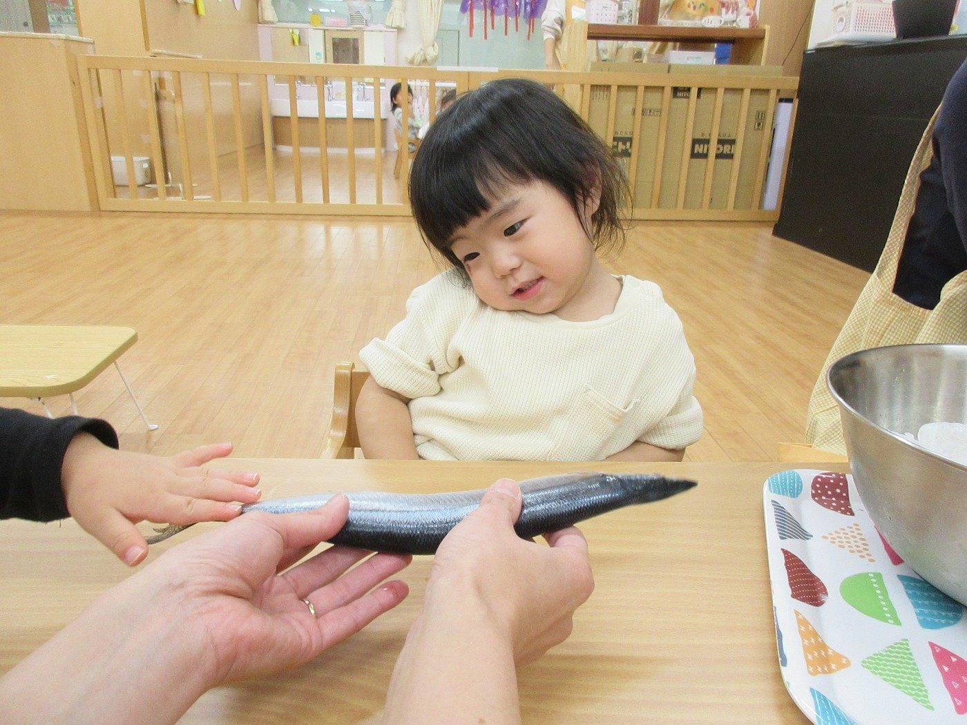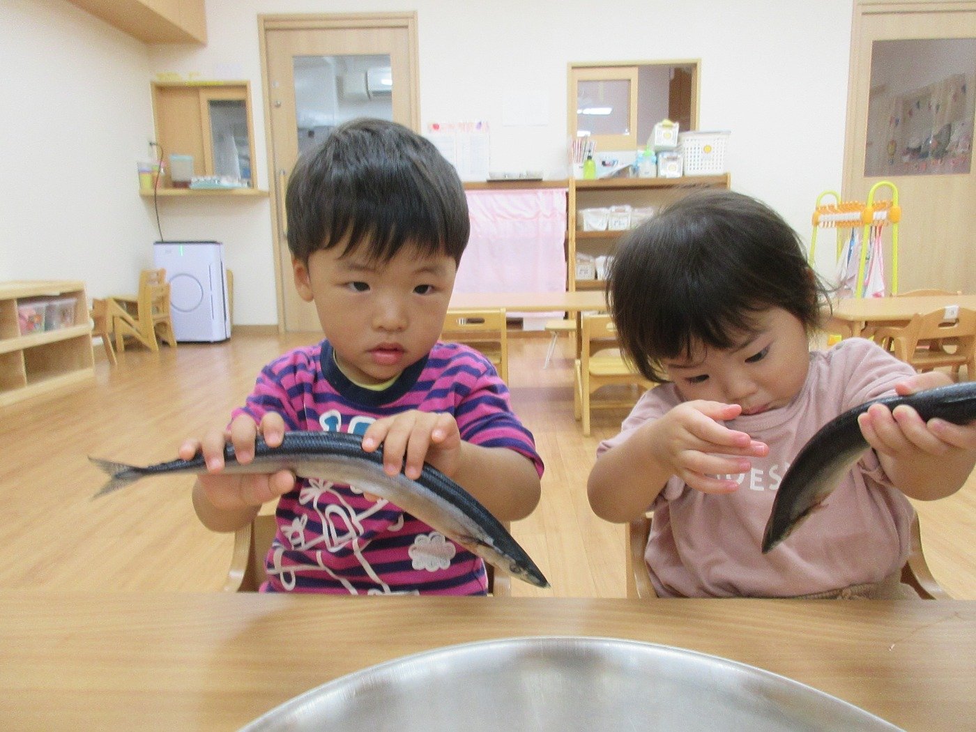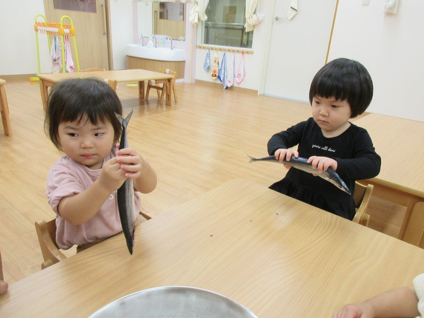 うさぎぐみさん ホームブログ 2021.10.27 お給食に秋の味覚「さんま」🐟が、登場です!! お給食をいただく前に、子ども達は「さんま」に 触れたりしました。 最初は、おそるおそるの子ども達もさんま🐟に慣れてくると さかなー!!とさわってみてましたよ いよいよ お給食♪柔らかく調理された「さんま」はとっても美味しかったようで 最初になくなるほど人気でした。