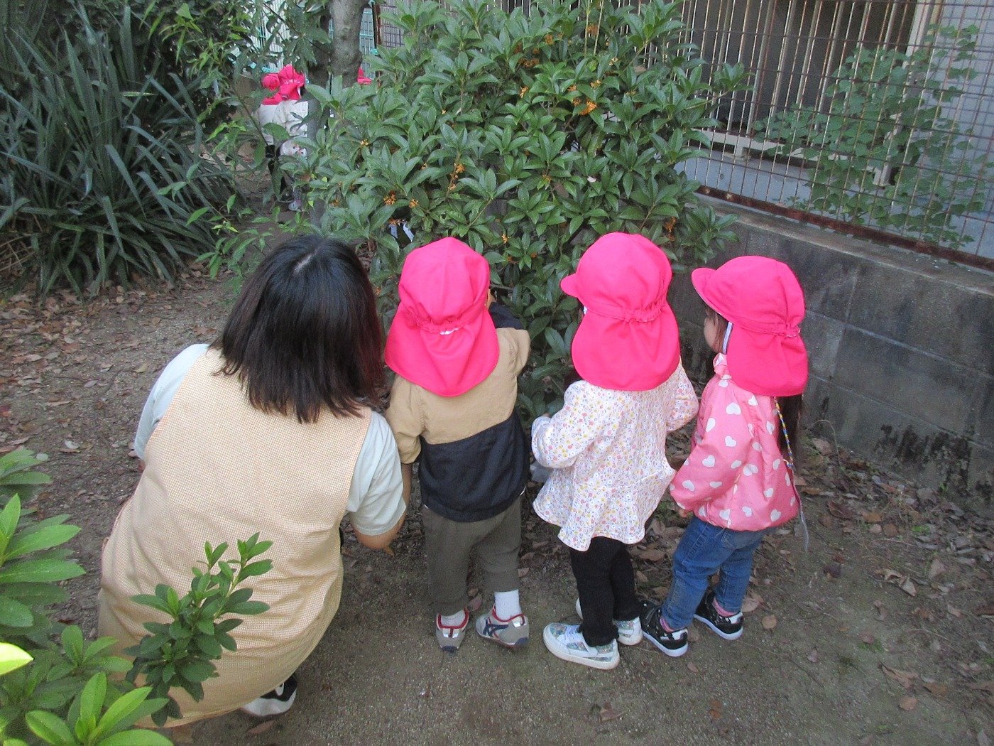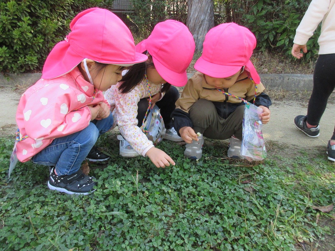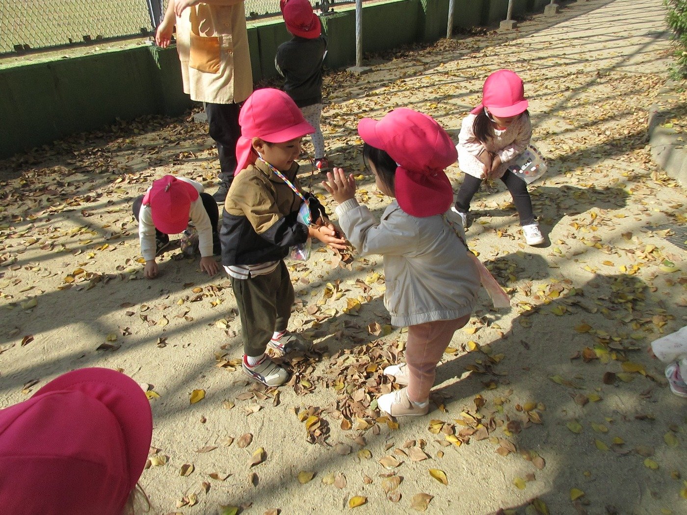 「どんぐりないね・・・」「きれいな葉っぱあるよ」子ども達は