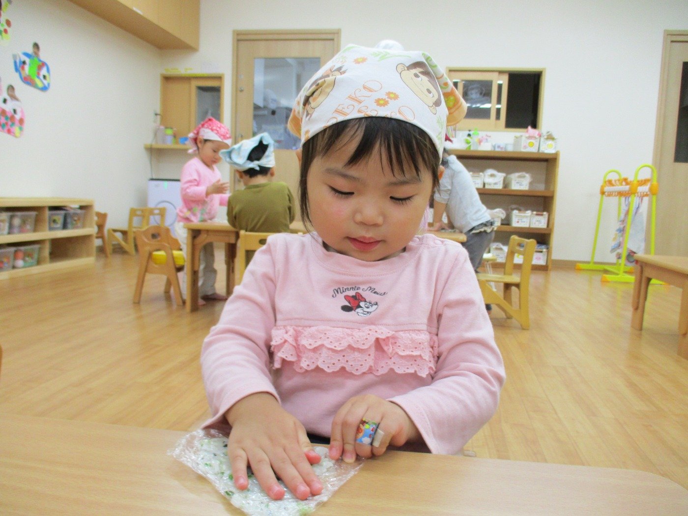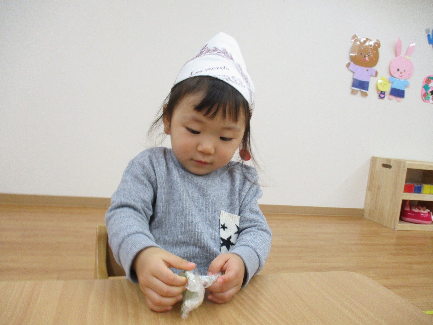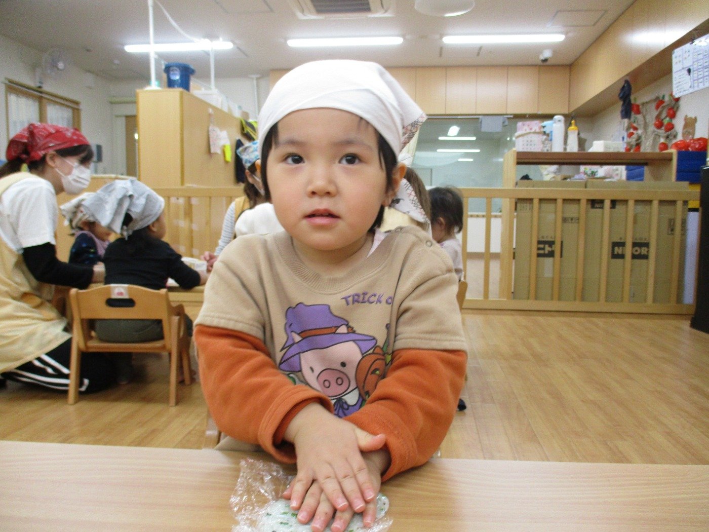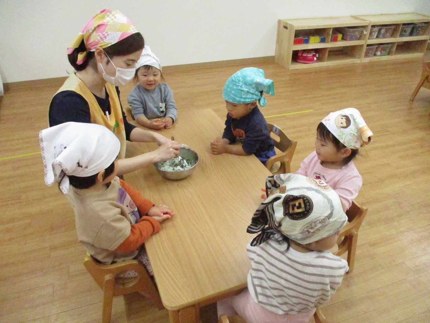 うさぎぐみさんクッキング♪ ホームブログ 2021.11.10 楽しみに待っていたクッキング♪ 登園した時から、「きょう、クッキングー!!」 と嬉しそうに来てくれました。 バンダナを巻いて。。。準備万端😊 調理の先生の話を聞いて、わくわく、そわそわ 今日のクッキングは「おこめのせんべい」 お友だちの前に、まぜごはんがくると まってましたぁー♪ とんとん。ぺたぺた。。。 たいらいなーれ とんとん♪ とっても美味しそうな「おこめのせんべい」ができました!! おやつの時間が楽しみです♡