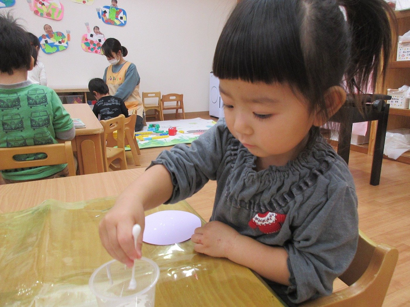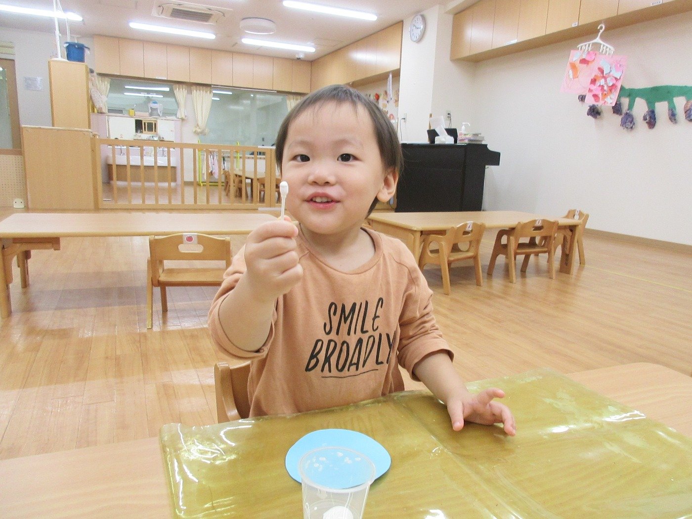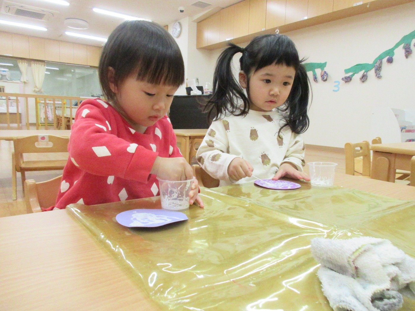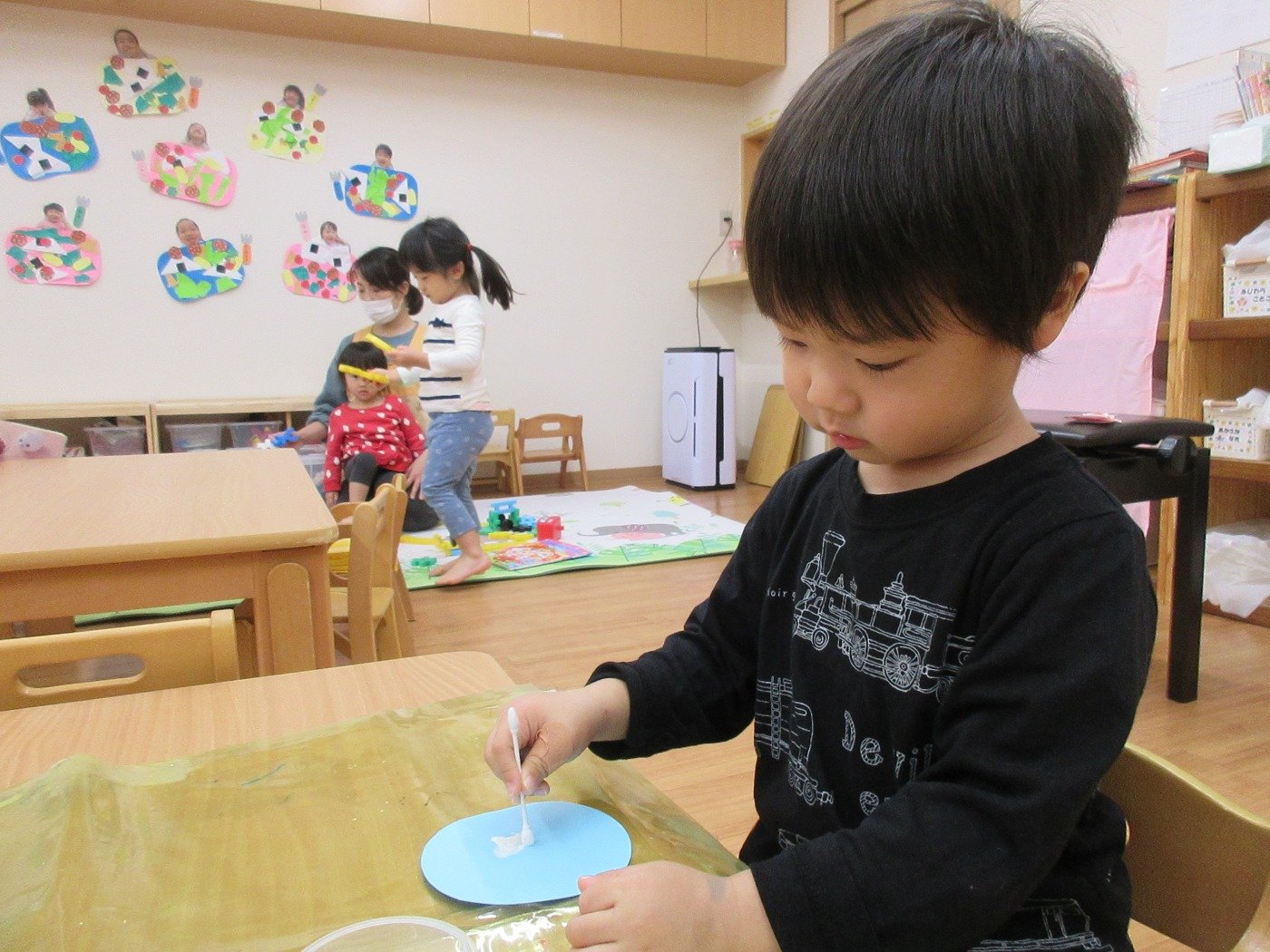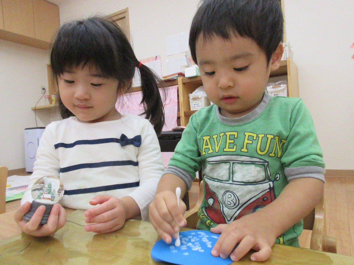 くまぐみさんの制作 ホームブログ 2021.11.17 くまぐみさん 今日はクリスマスの制作♪ 先生からきらきら光るスノードームをみせてもらうと 目をキラキラ✨ わぁー 作りたい♪さわってみたい・・・ 子ども達の興味、関心のある言葉がたくさん聞こえてきます。 先生から制作の手順を聞いて、さぁー制作!! 真剣。 集中して 子ども達が選んだ、画用紙に色の絵の具で雪の模様をつけていきます。 どんなスノードームになるのかな? とっても楽しみです😊