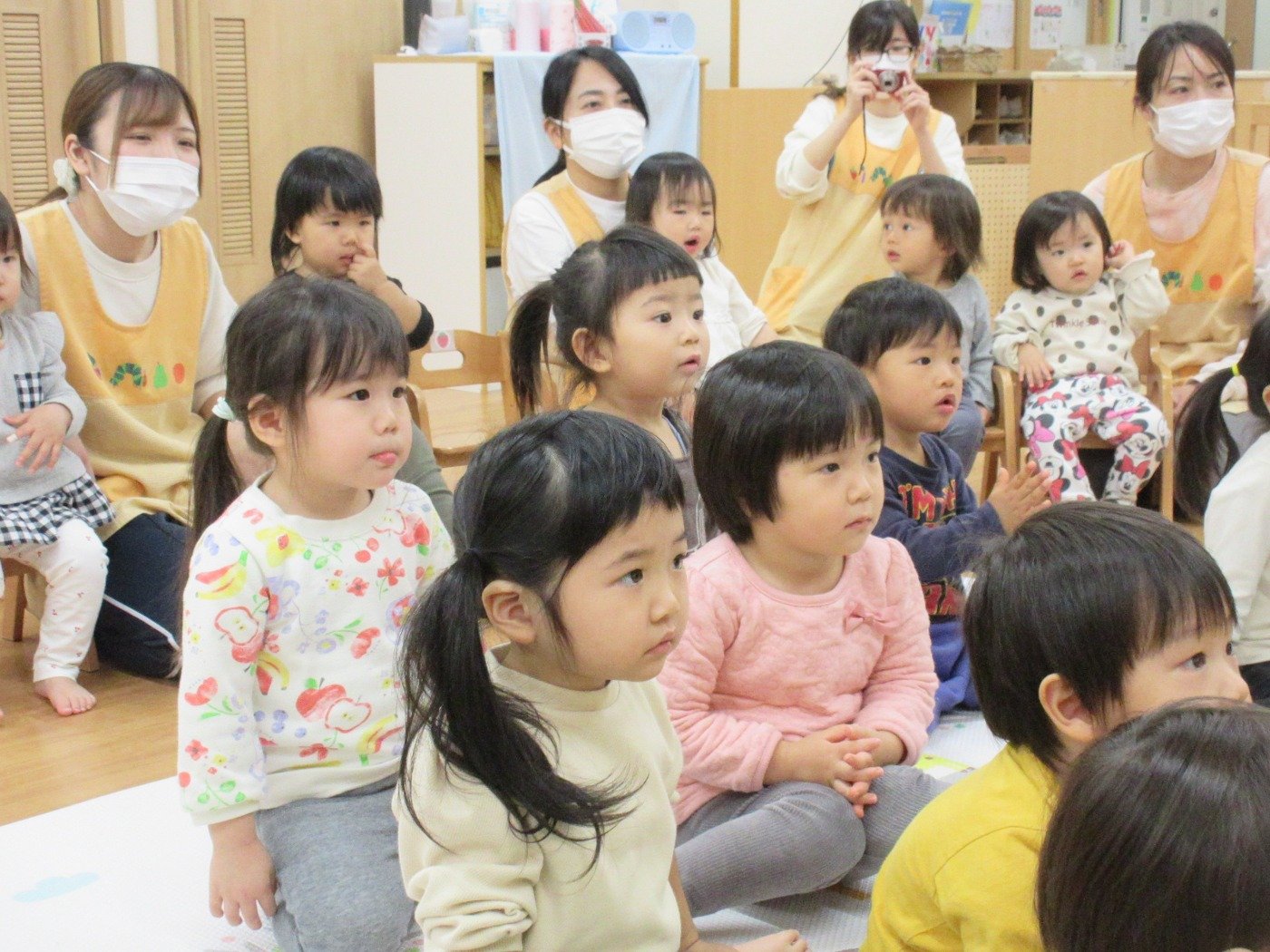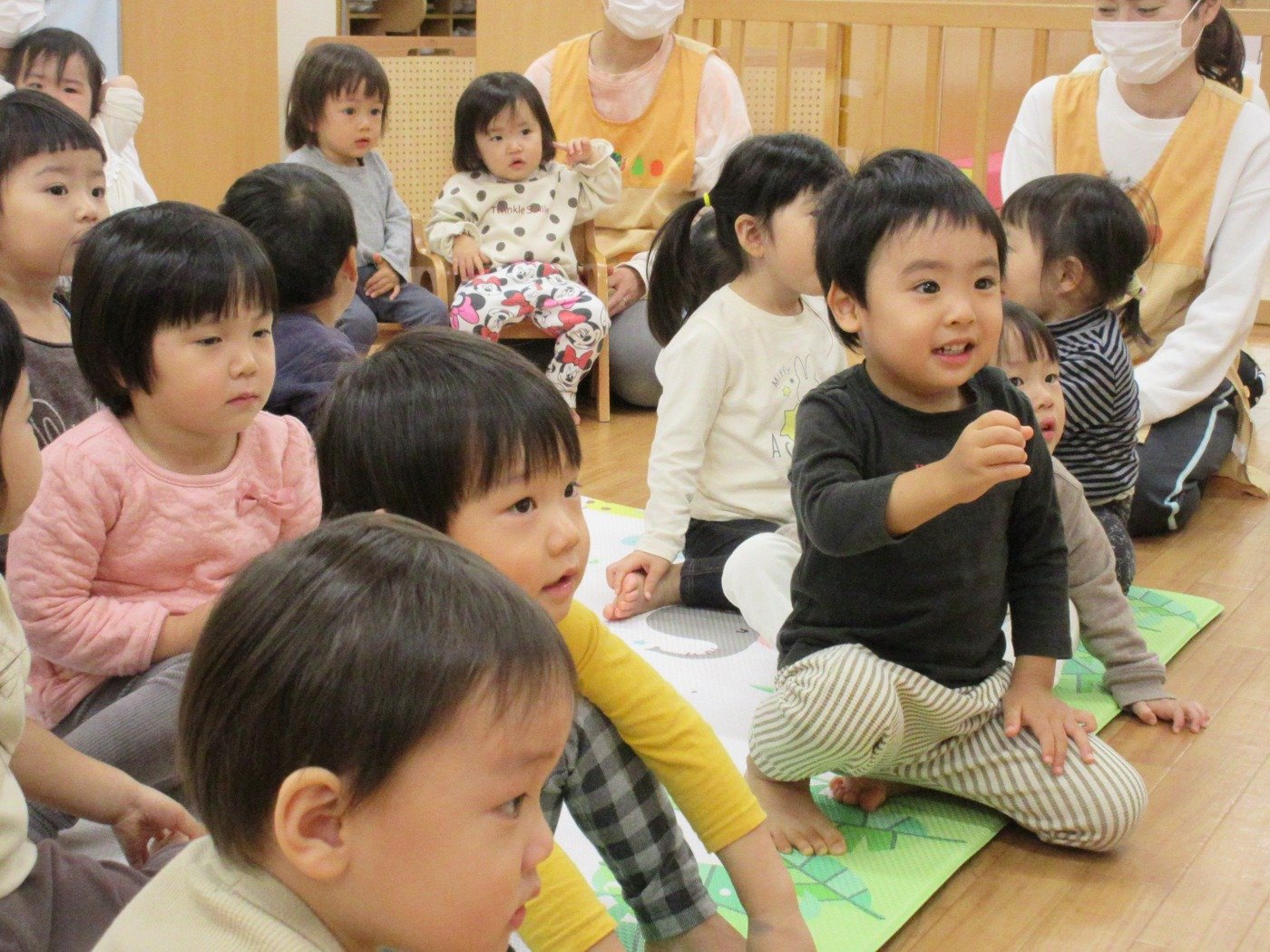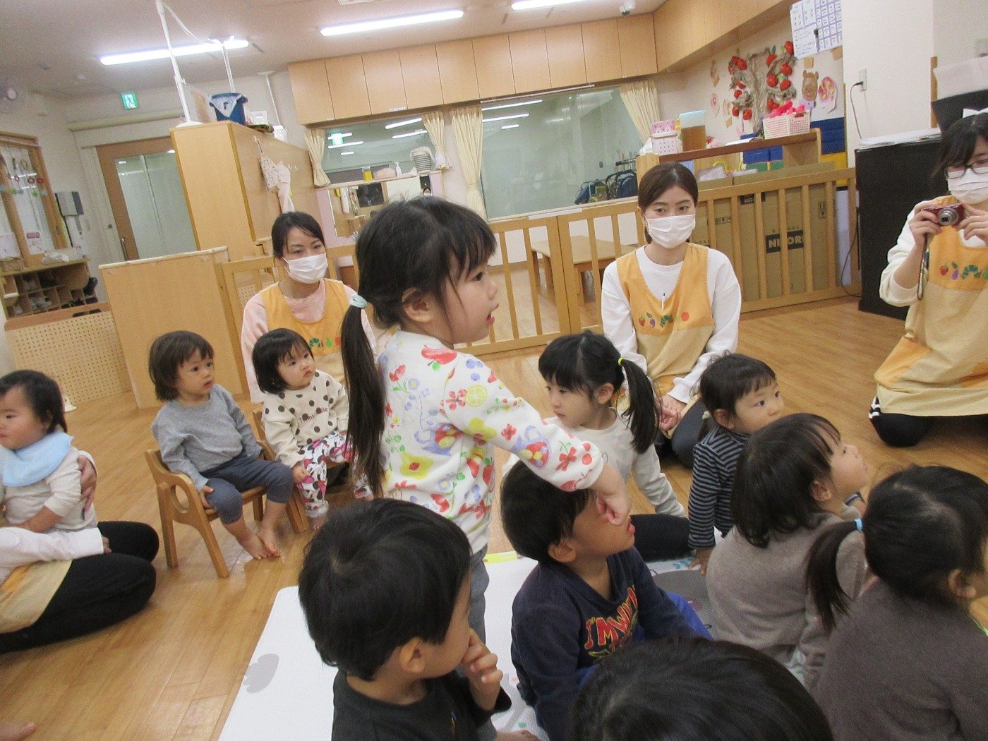 11月の楽しみ会♬ ホームブログ 2021.11.18 今日は子ども達も、楽しみにしている「お楽しみ会」 先生もちょぴり緊張😊 とってもふんわりした雰囲気でお楽しみに会が始まりました。 子ども達も先生の用意してくれた、パネルシアターに夢中♬ 一緒に応援したり、声を掛けたり。。。。 パネルシアターの物語に真剣!! お話が終るとにこにこ顔の子ども達♡ 子ども達が喜んでくれることが、一番うれしいです。 来月はどんな会になるのかな?