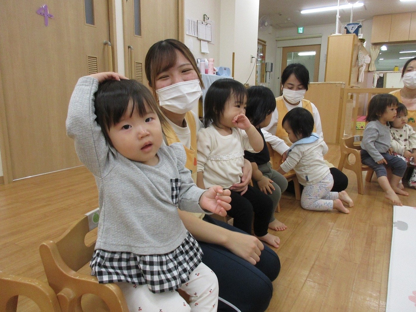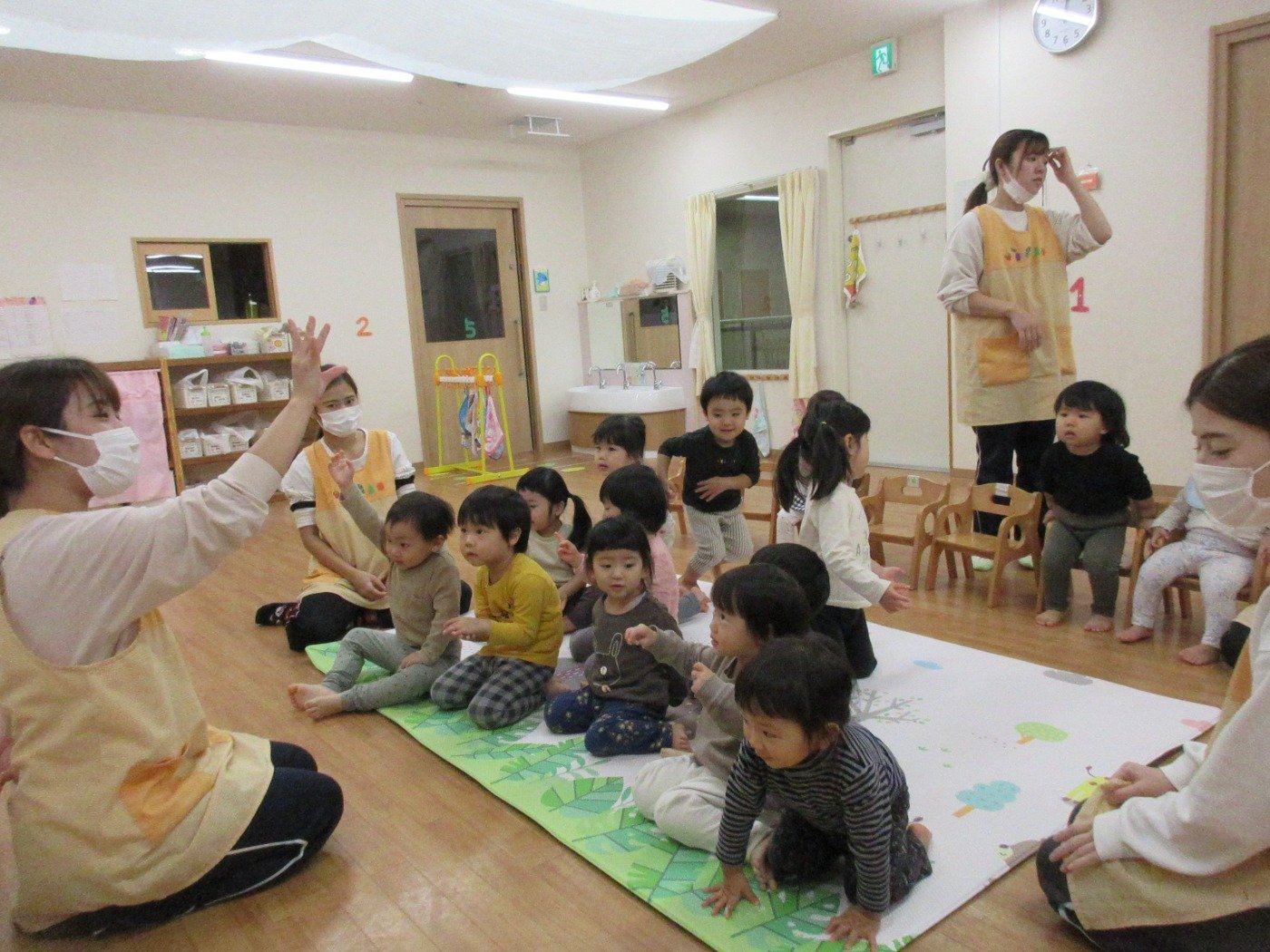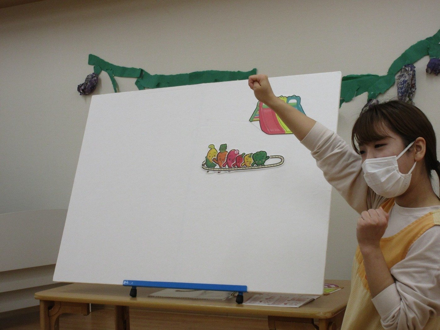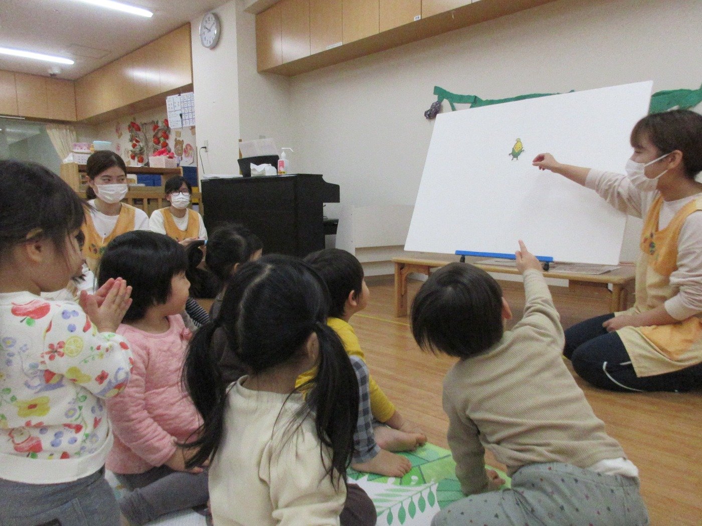11月の楽しみ会♬ ホームブログ 2021.11.18 今日は子ども達も、楽しみにしている「お楽しみ会」 先生もちょぴり緊張😊 とってもふんわりした雰囲気でお楽しみに会が始まりました。 子ども達も先生の用意してくれた、パネルシアターに夢中♬ 一緒に応援したり、声を掛けたり。。。。 パネルシアターの物語に真剣!! お話が終るとにこにこ顔の子ども達♡ 子ども達が喜んでくれることが、一番うれしいです。 来月はどんな会になるのかな?