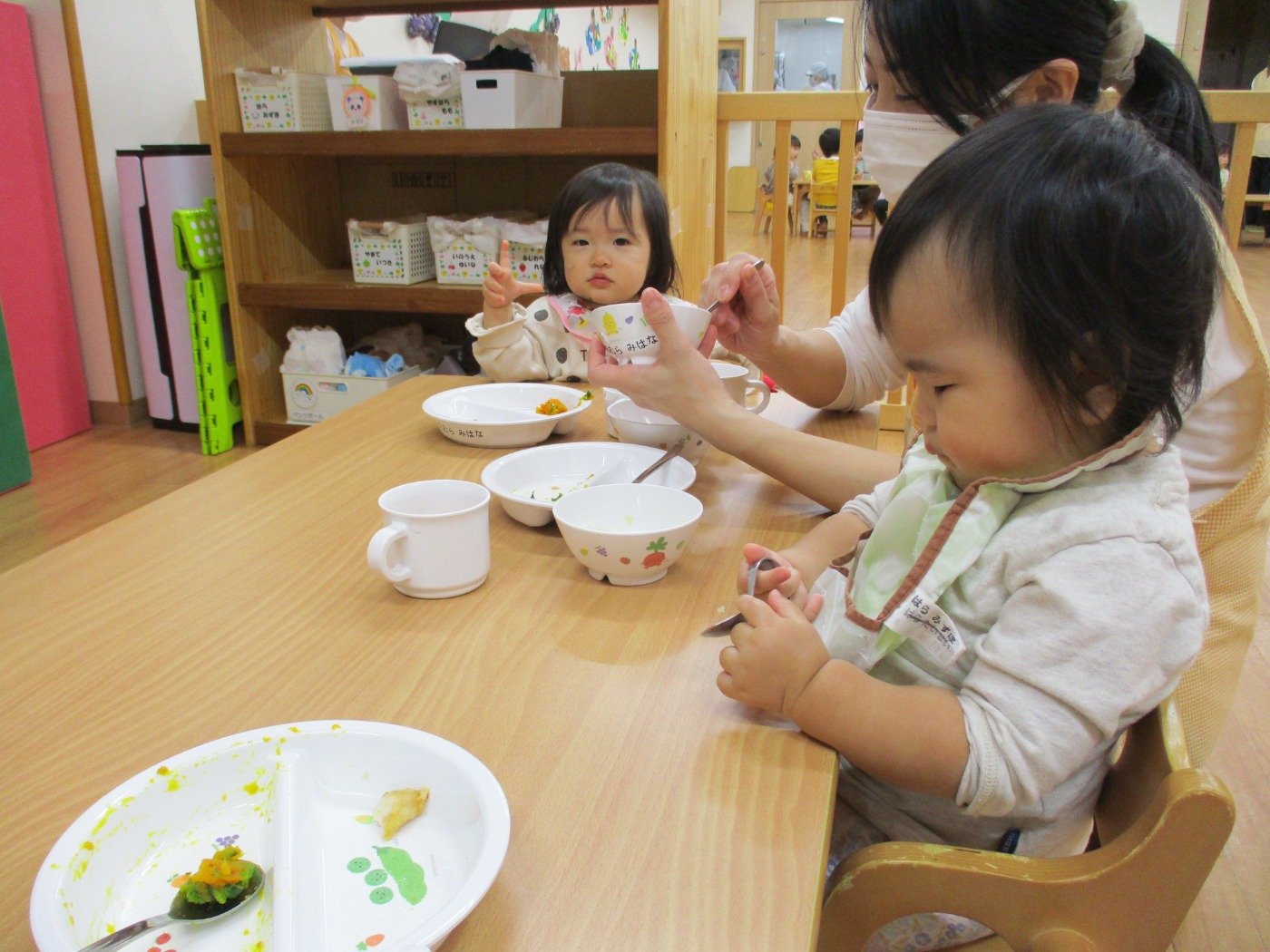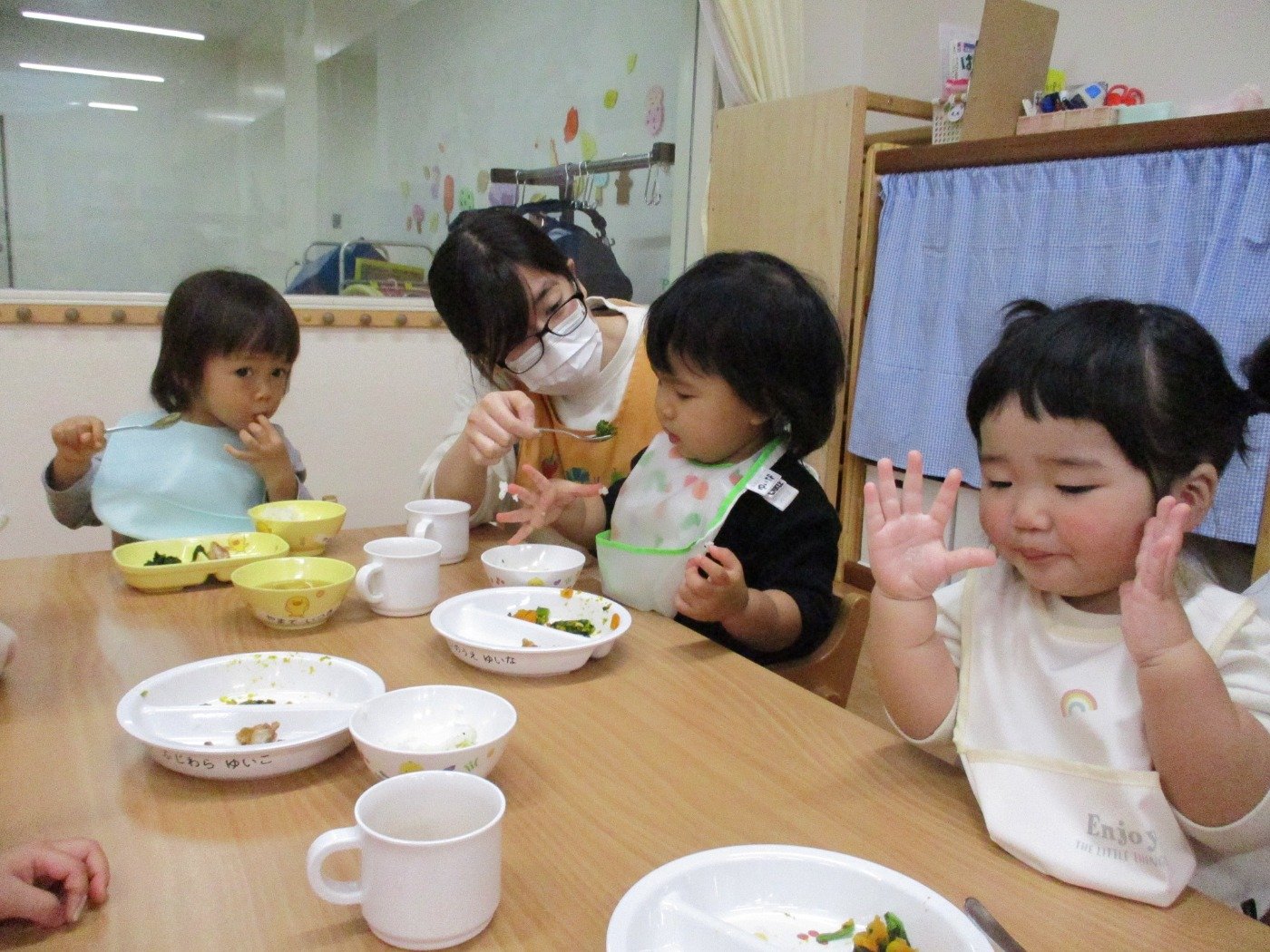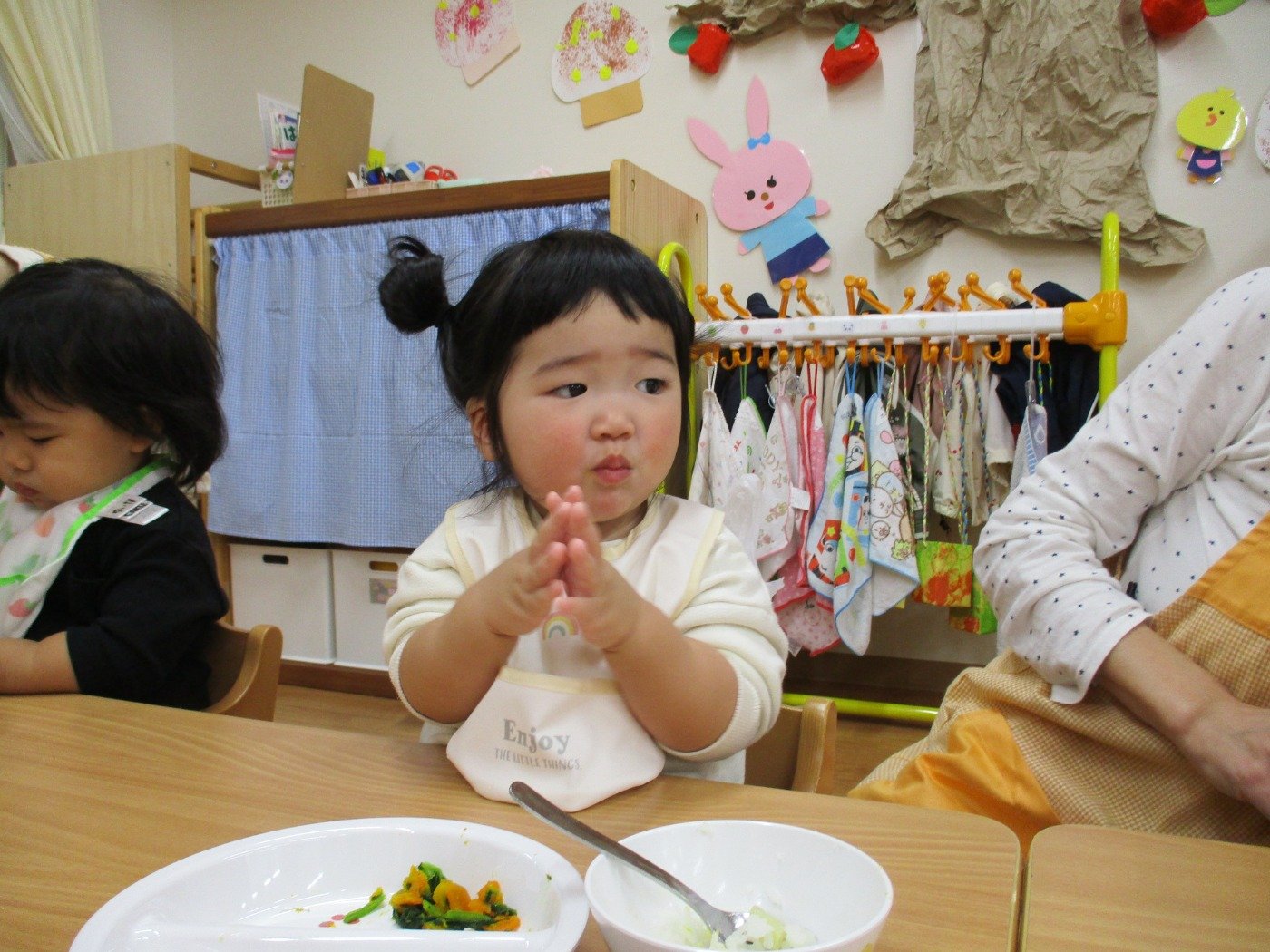 にじぐみさん ホームブログ 2021.11.18 新しいお友だちがにじぐみさんにきてくれて半月が経ちました😊 お友だちにも保育園の生活にも少しずつ慣れてくれてとっても嬉しいです。 お給食の時間もお友だちと一緒に♡ 今日はお楽しみに会のメニューで子どもたちの好きな・・・からあげ♬ と 子ども達が育てた「かぶ」がお味噌汁に!! ぱくぱく モグモグ にこにこで食べてくれていました。