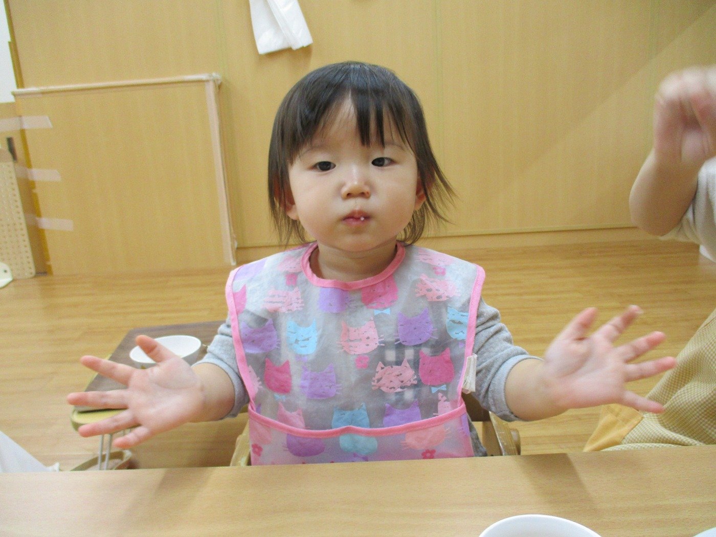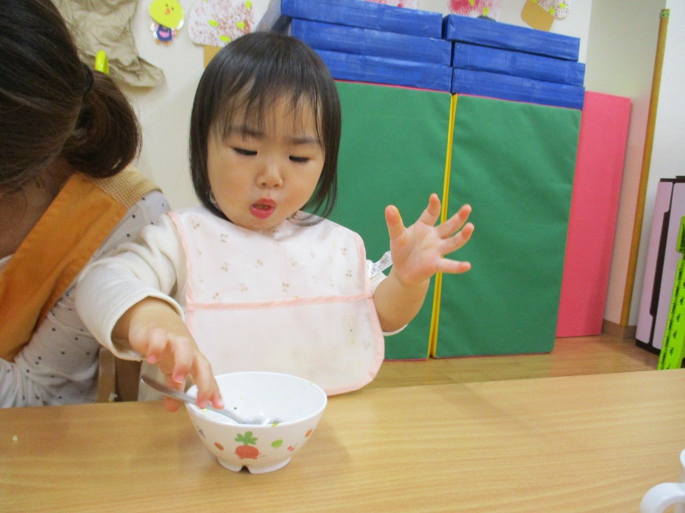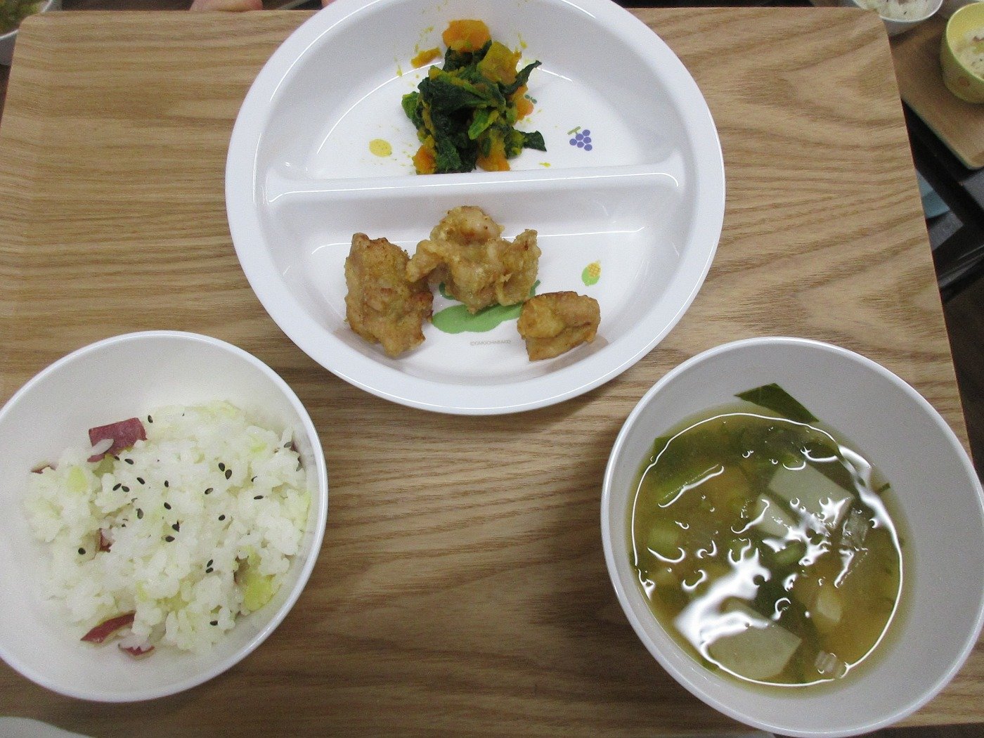 にじぐみさん ホームブログ 2021.11.18 新しいお友だちがにじぐみさんにきてくれて半月が経ちました😊 お友だちにも保育園の生活にも少しずつ慣れてくれてとっても嬉しいです。 お給食の時間もお友だちと一緒に♡ 今日はお楽しみに会のメニューで子どもたちの好きな・・・からあげ♬ と 子ども達が育てた「かぶ」がお味噌汁に!! ぱくぱく モグモグ にこにこで食べてくれていました。