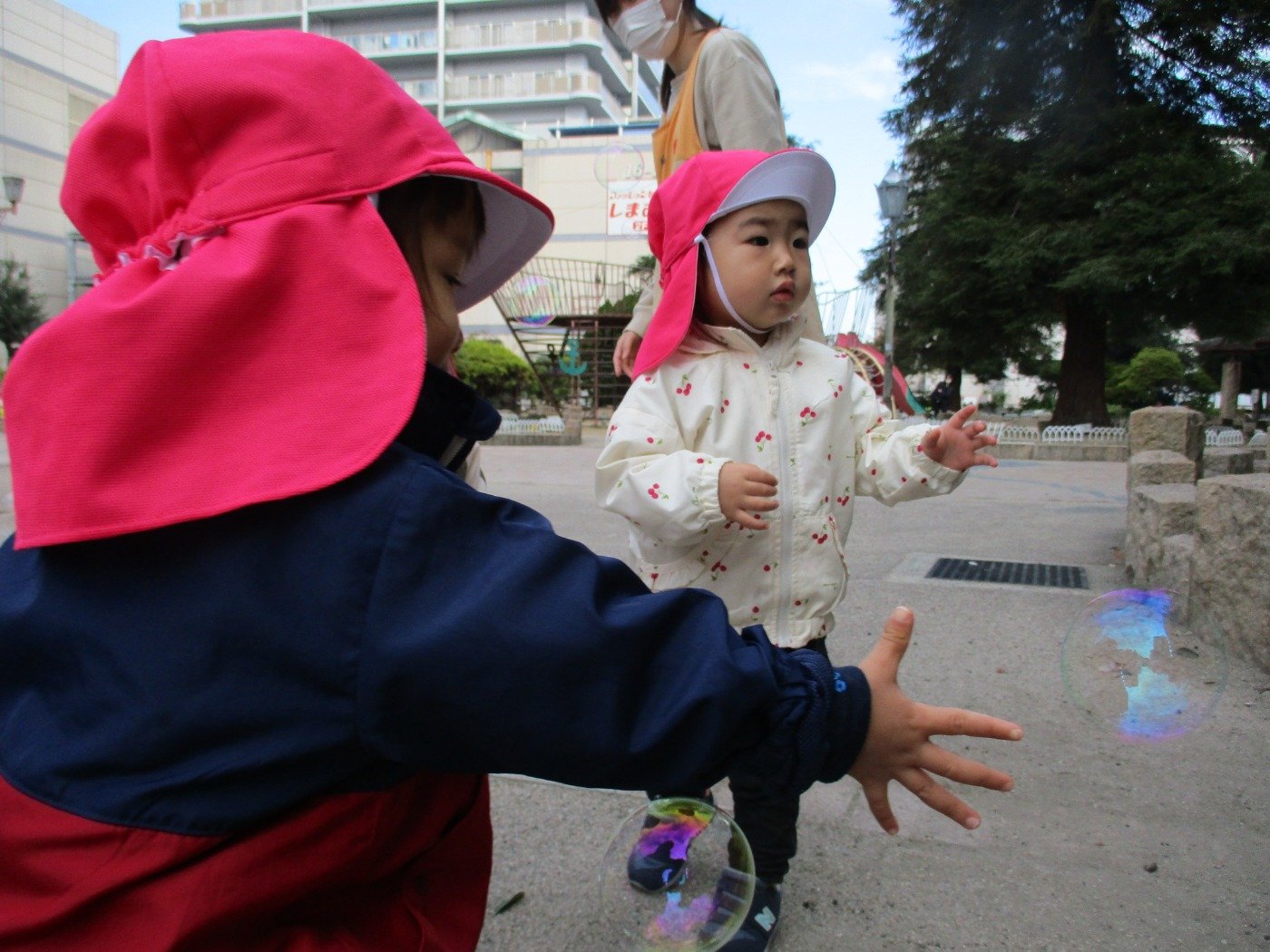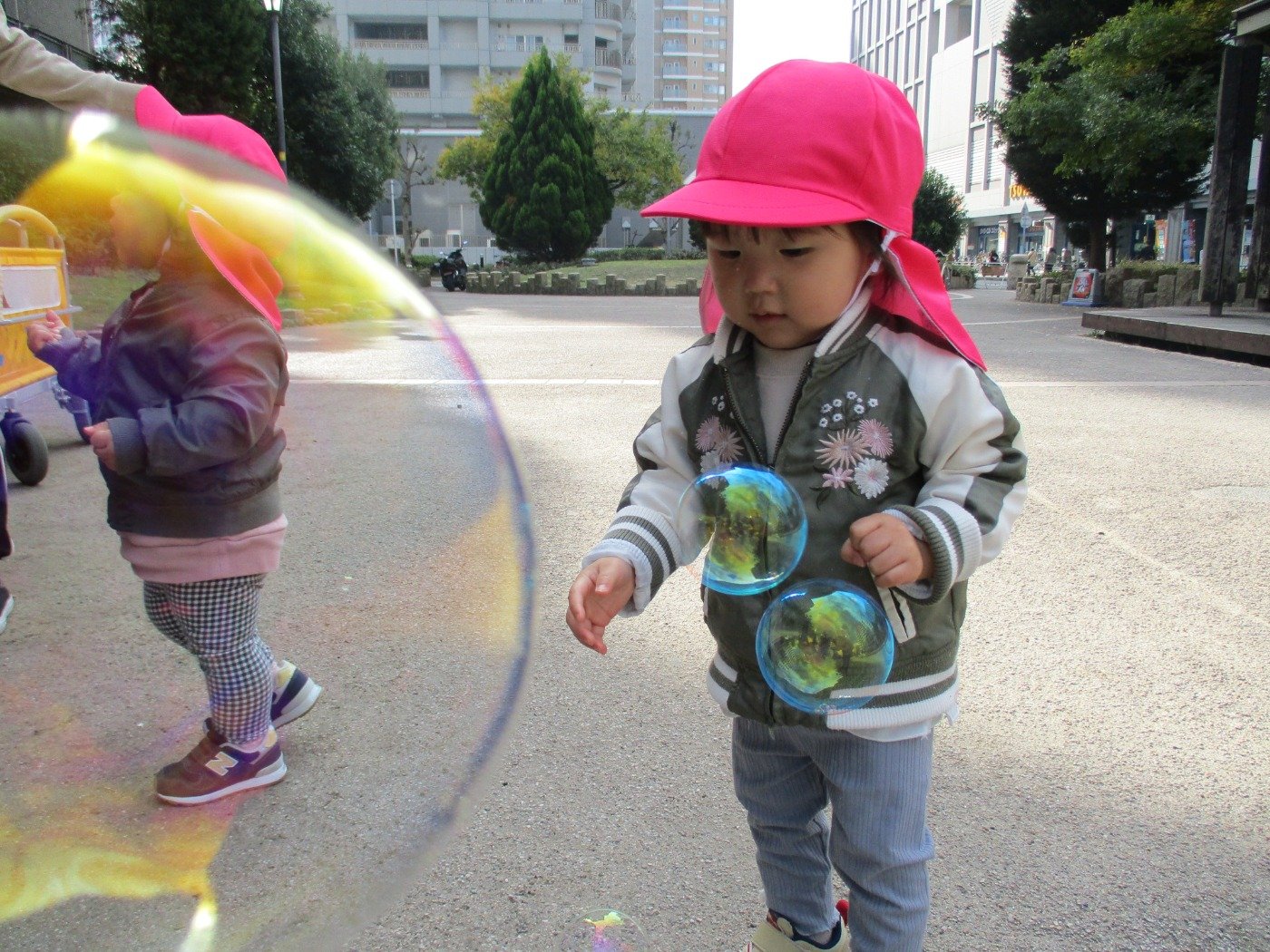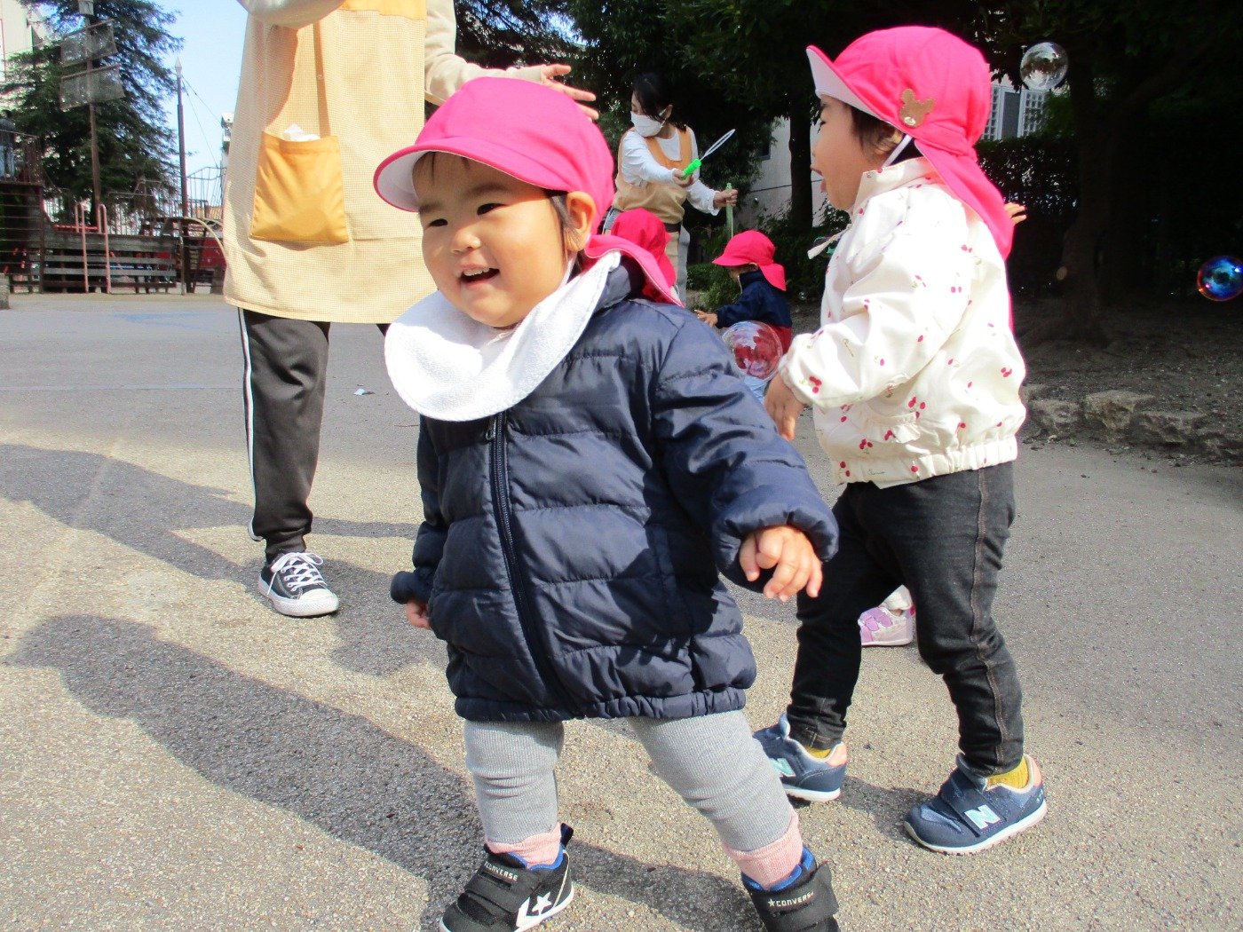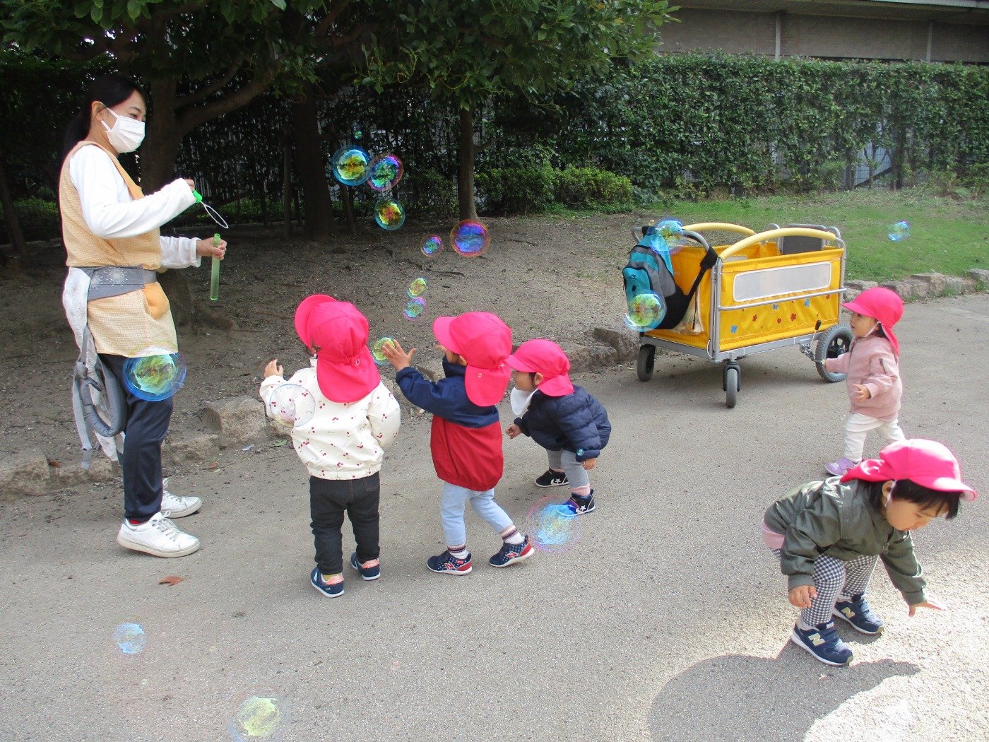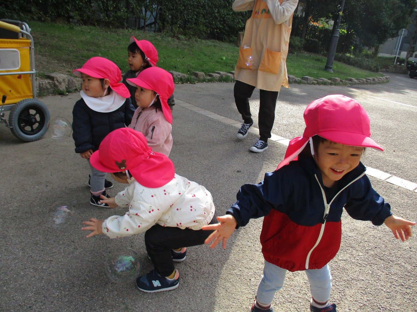 にじぐみさん ホームブログ 2021.11.19 にじぐみさん 公園にお散歩に行って「しゃぼんだま」でたくさん遊びました😊 お友だちと手を繋いで、いっちに!いっちに!! と歩きます。 しゃぼん玉を追いかけっこしてる姿はとっても微笑ましいです♬ 来週も、たくさんお散歩に行けるかな?
