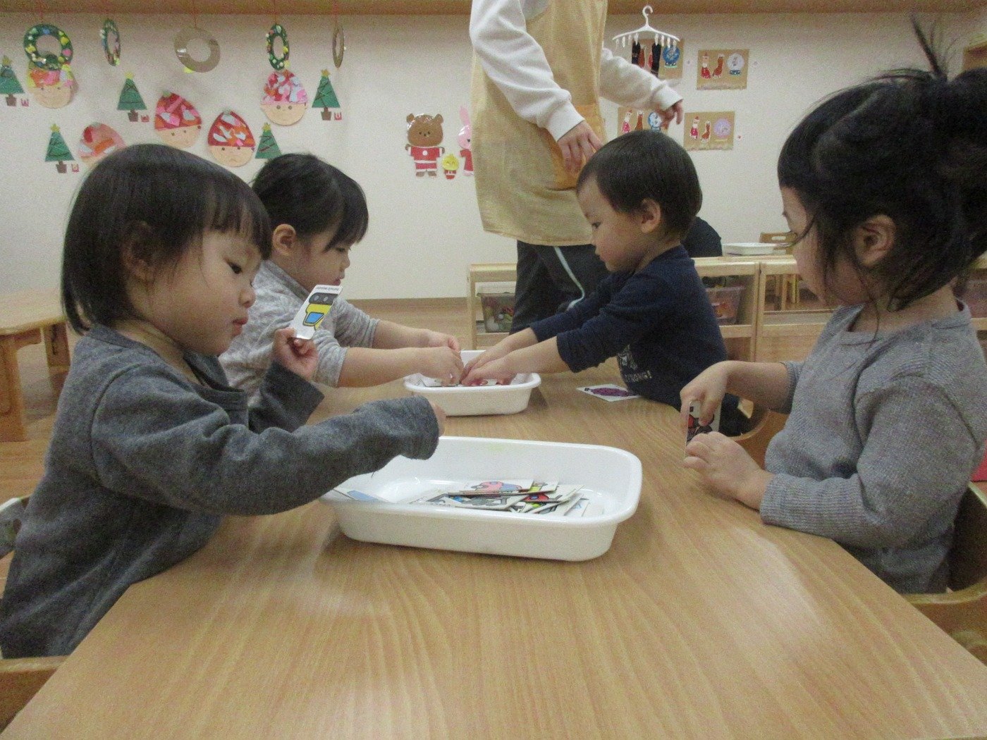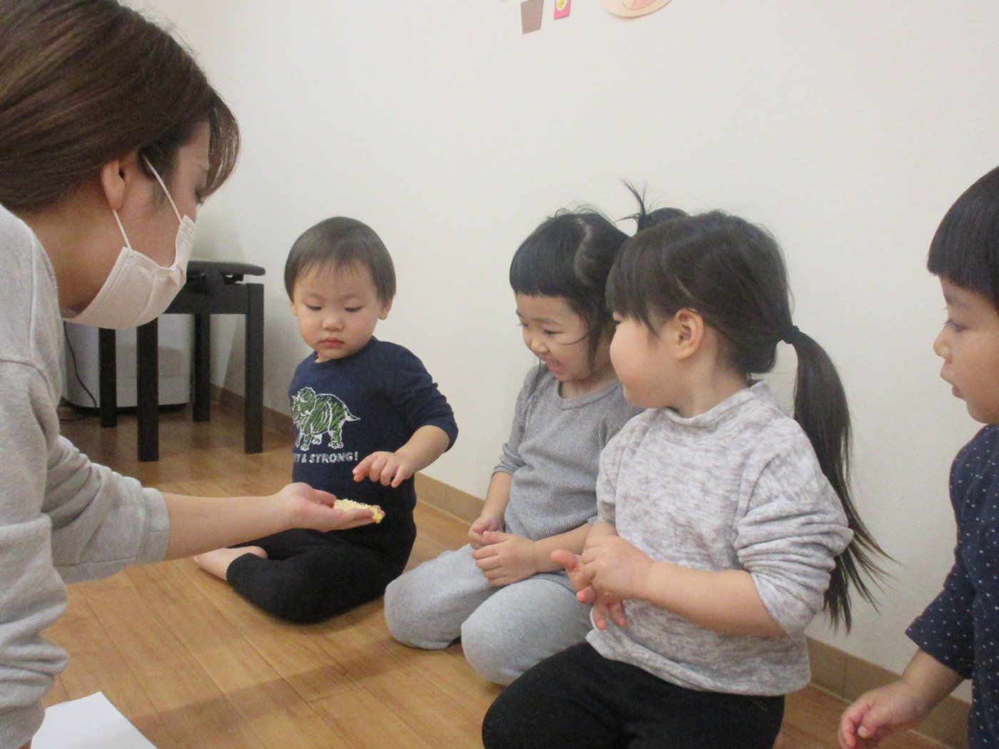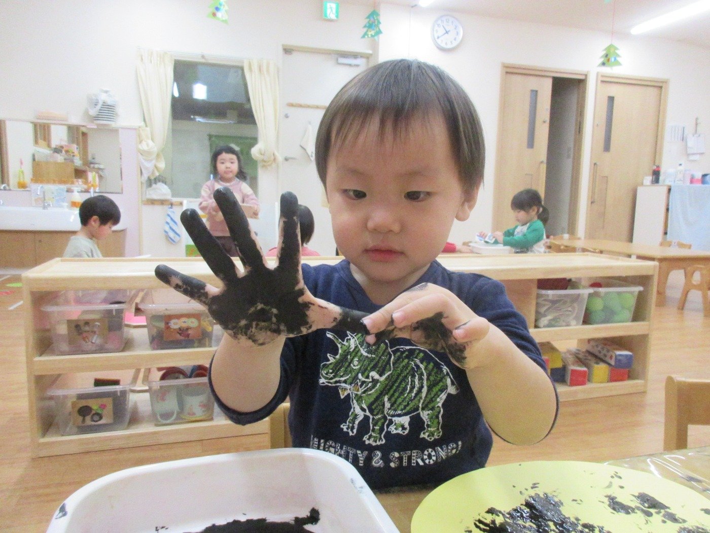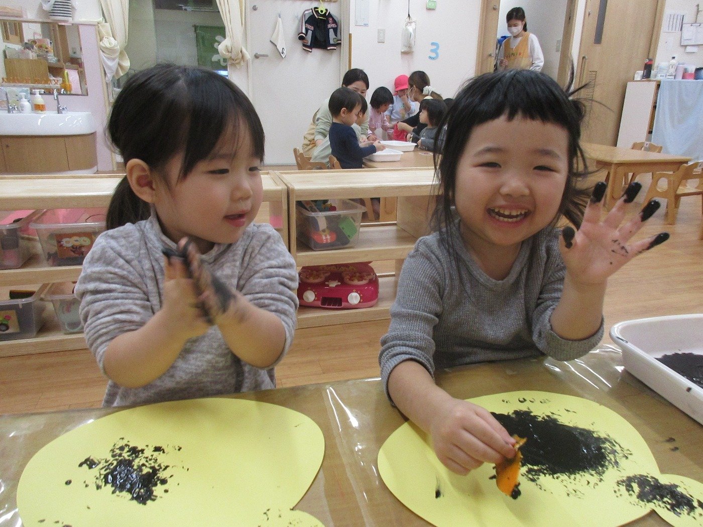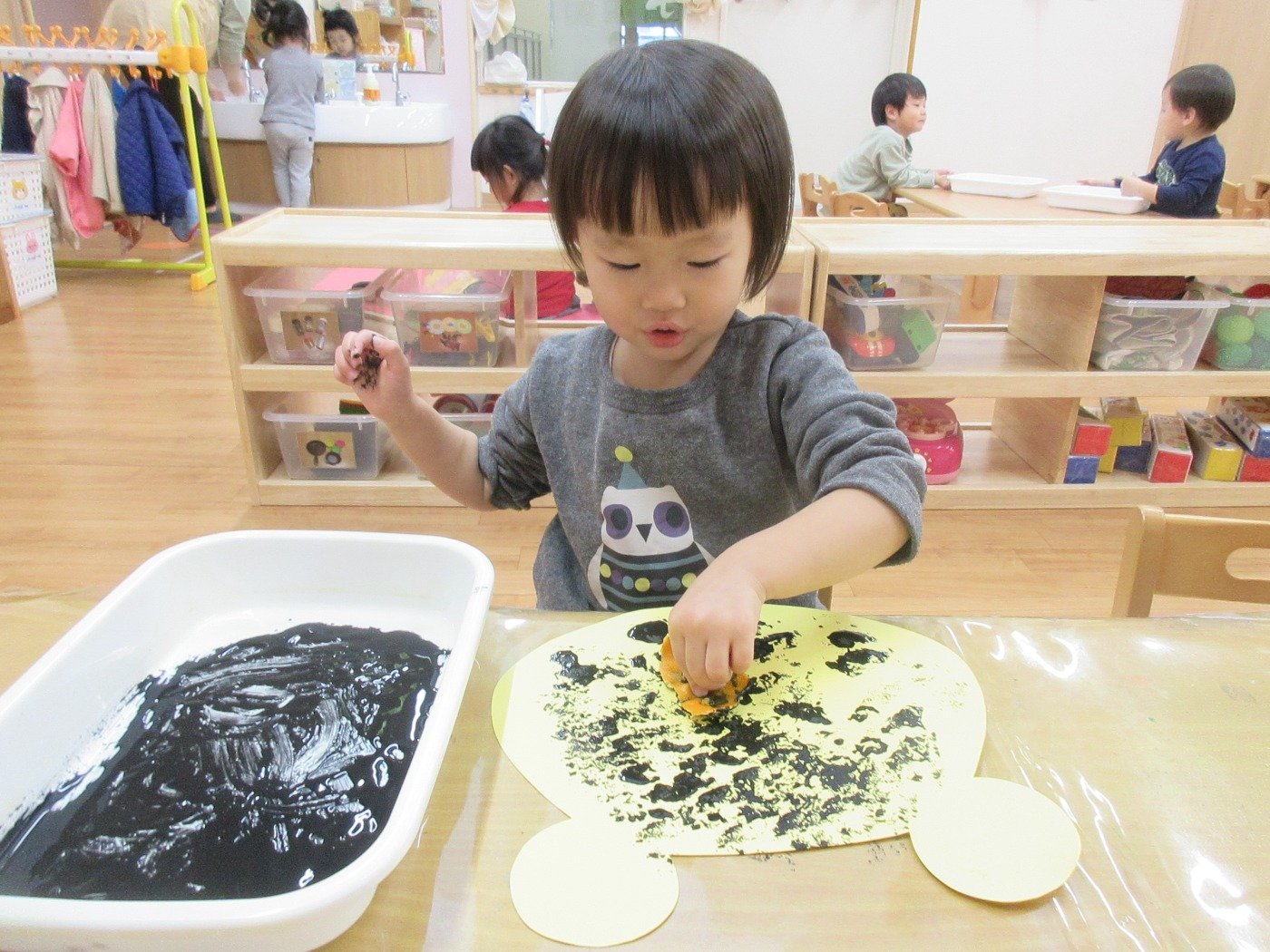 くまぐみさん ホームブログ 2021.12.17 子ども達は、今日はお部屋で制作!! 真っ黒絵の具を使って 何を作るのかな? 子ども達も、スタンプをを見て 「わぁー!!みかん♡」 と喜んでスタンプしていました♬